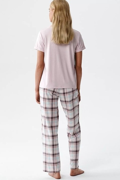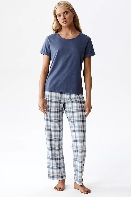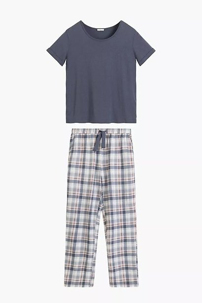 Pyžamový must-have, který sází na pohodlí a čistý styl. Kombinace hladkého trička s dlouhými kostkovanými kalhotami působí nadčasově a skvěle se nosí. Měkká směs modalu a bavlny je lehká, prodyšná a na kůži příjemně „chladí“, takže se hodí i na teplejší noci. Jednoduchý střih trička neomezuje v pohybu a kalhoty v kostce dodají celku nenucený domácí look. Ideální volba na spaní, víkendové ráno i pohodový večer, kdy chcete hlavně klid a komfort.