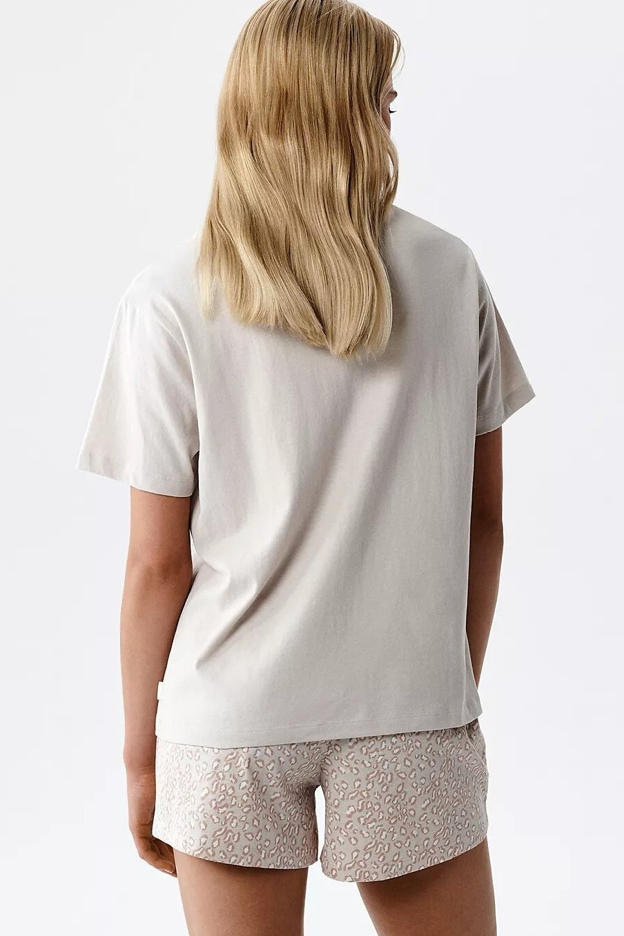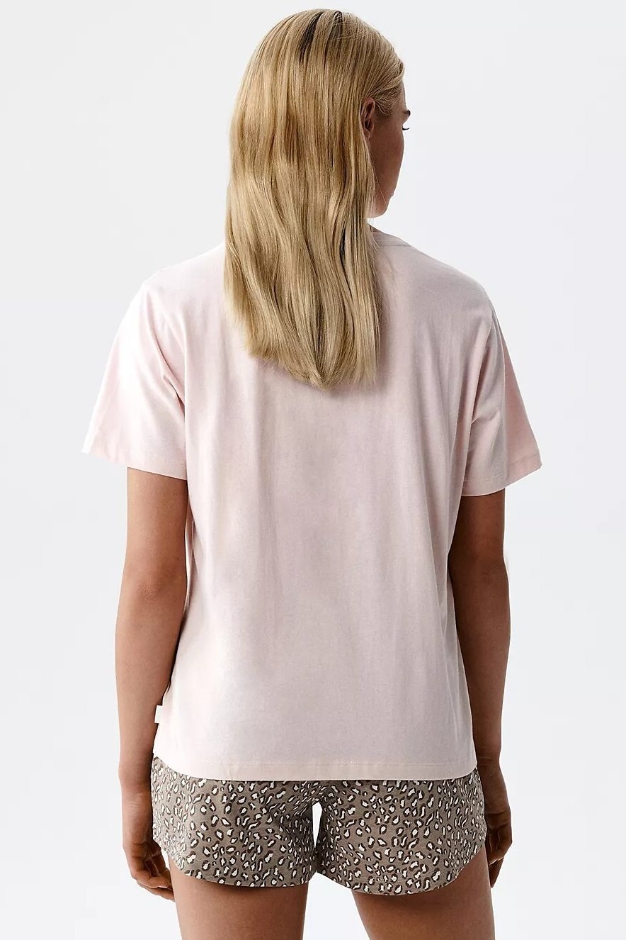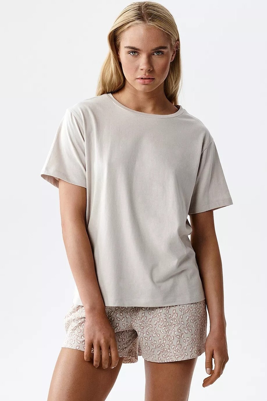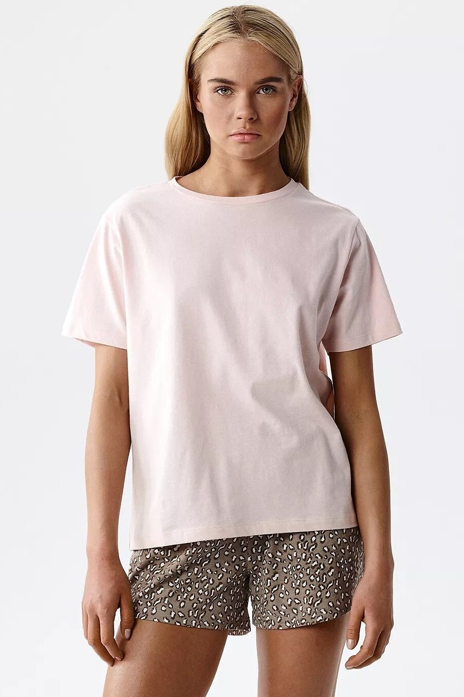 Dámské pyžamo z čisté bavlny, které si zamilujete hned na první dotek. Speciální úprava „peach effect“ vytváří na povrchu jemné, hebké chloupky – materiál tak působí měkce a příjemně, jako broskvová slupka. Tričko s krátkým rukávem a půlkulatým výstřihem sedí pohodlně a hodí se i na domácí lenošení. Součástí jsou krátké vzorované kalhoty s kapsami na bocích, takže máte drobnosti vždy po ruce. V pase najdete komfortní gumu potaženou bavlnou, která netlačí a dobře drží. Skvělá volba na klidné večery i pohodová rána.