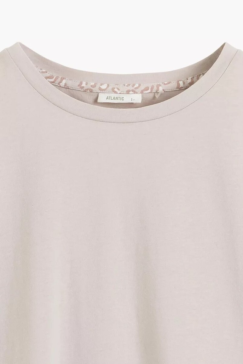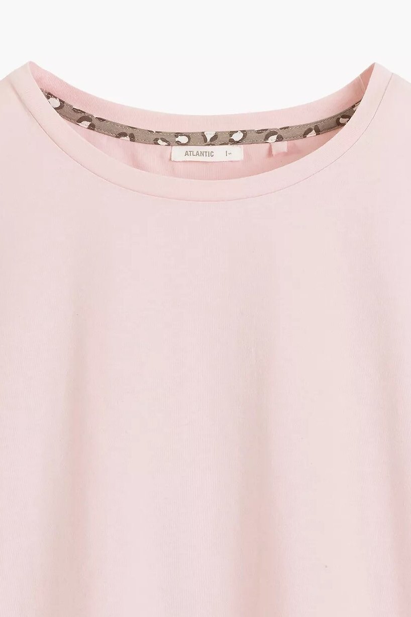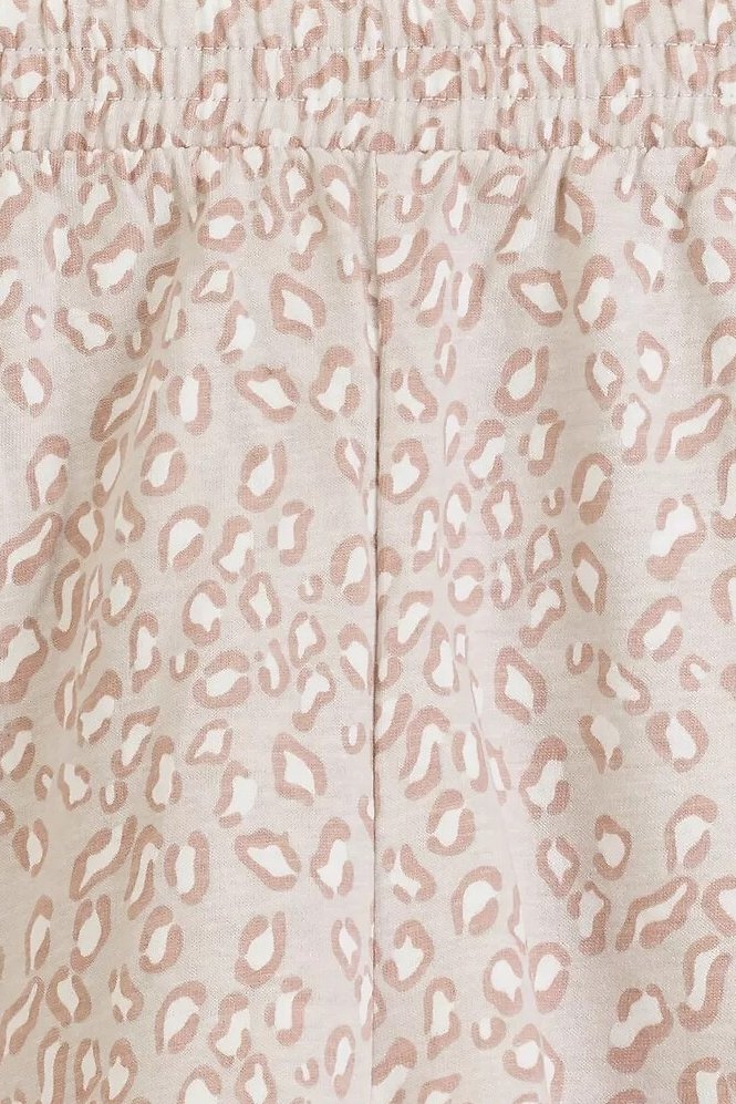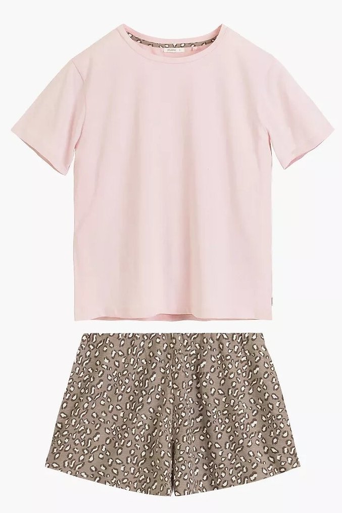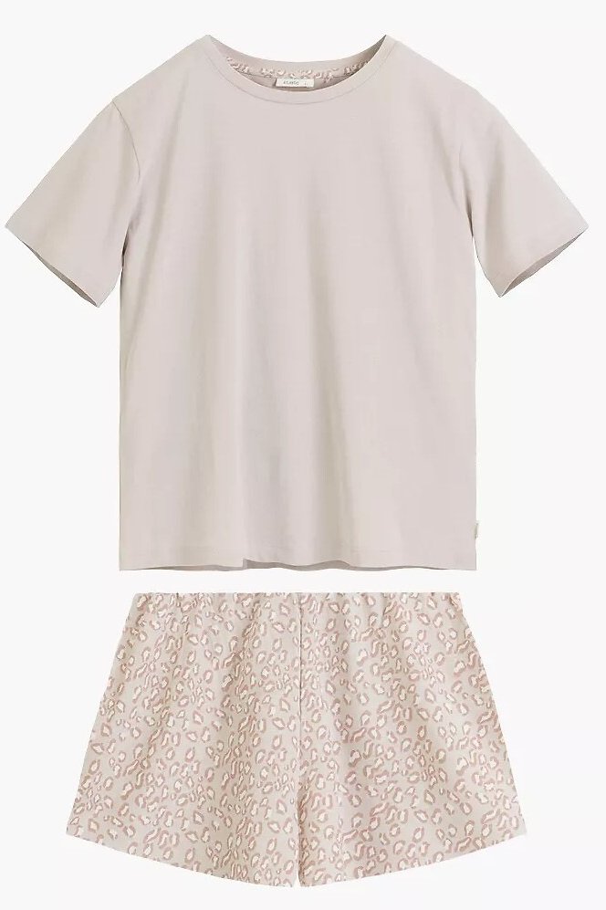 Dámské pyžamo z čisté bavlny, které si zamilujete hned na první dotek. Speciální úprava „peach effect“ vytváří na povrchu jemné, hebké chloupky – materiál tak působí měkce a příjemně, jako broskvová slupka. Tričko s krátkým rukávem a půlkulatým výstřihem sedí pohodlně a hodí se i na domácí lenošení. Součástí jsou krátké vzorované kalhoty s kapsami na bocích, takže máte drobnosti vždy po ruce. V pase najdete komfortní gumu potaženou bavlnou, která netlačí a dobře drží. Skvělá volba na klidné večery i pohodová rána.