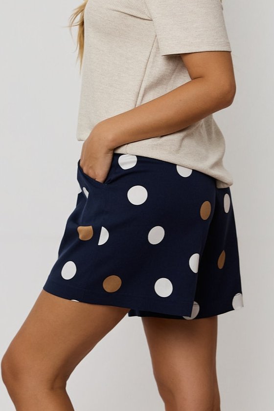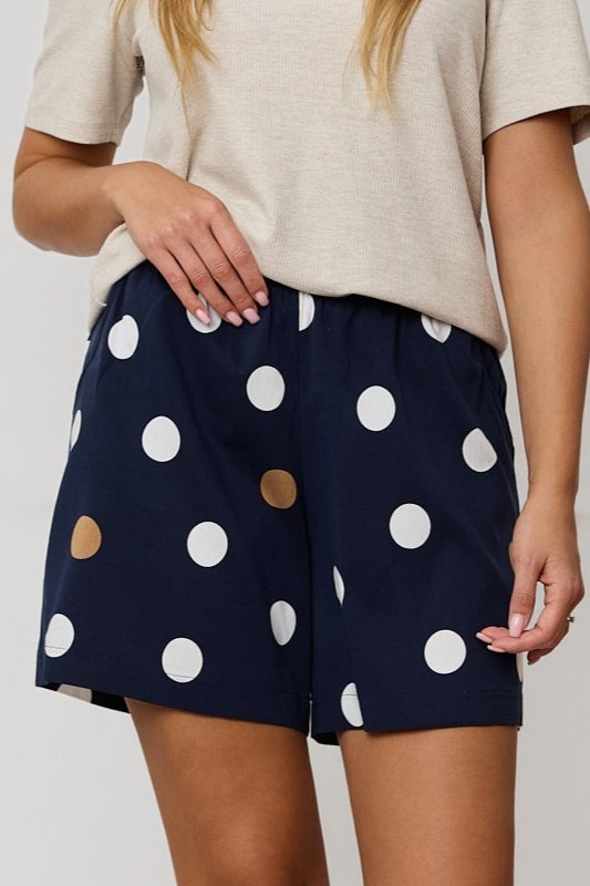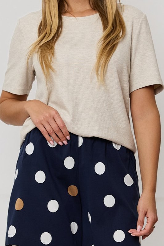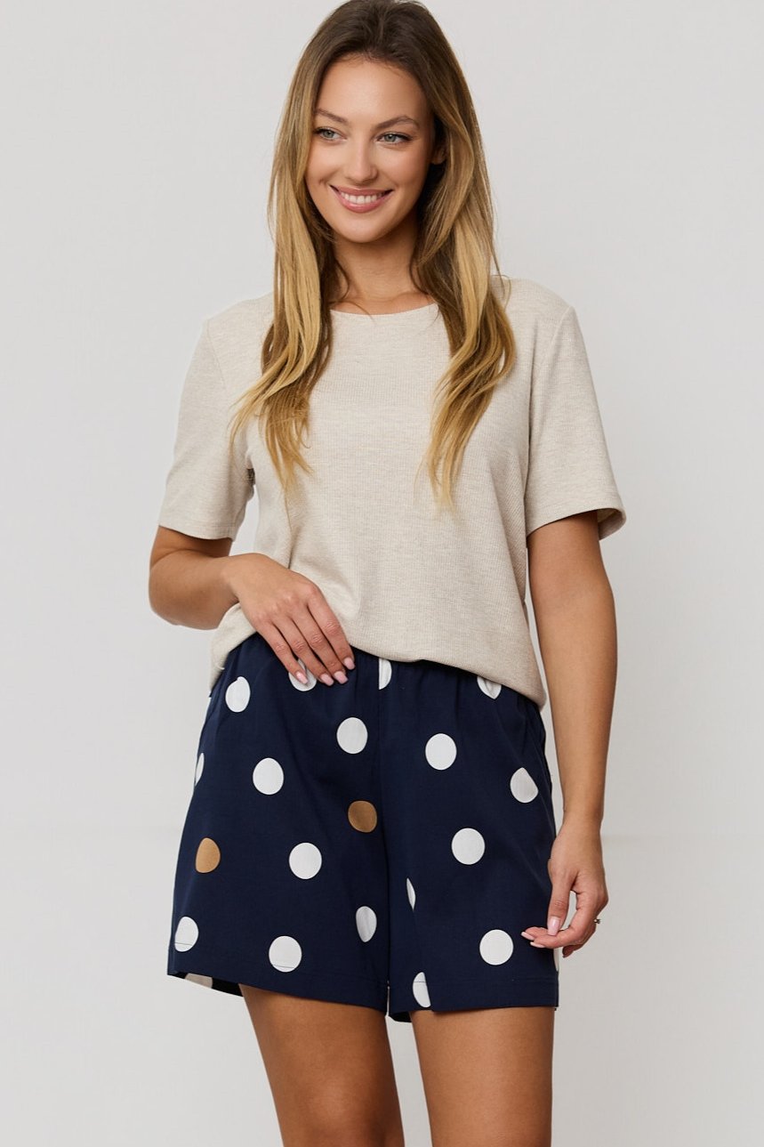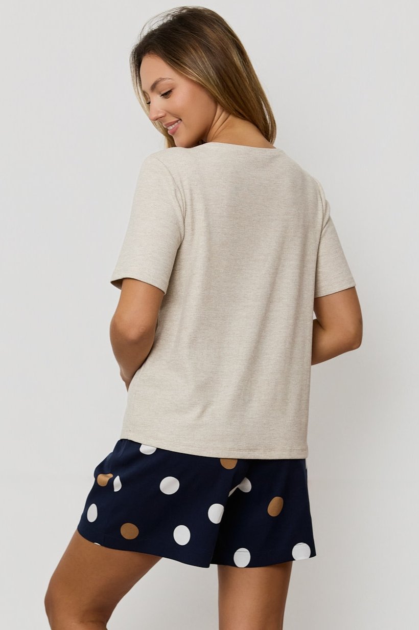 Dámske pyžamo Oceane vyniká kombináciou štýlu a pohodlia. Mäkké tričko z rebrovanej viskózy príjemne obopína telo a poskytuje komfort aj počas horúcich nocí. Je s krátkym rukávom a okrúhlym dekoltom. Krátke šortky s hravým bodkovaným vzorom a praktickými vreckami dodávajú pyžamu svieži a moderný vzhľad. Vďaka priedušnému materiálu a pohodlnému strihu je tento model ideálnou voľbou na letné obdobie alebo domáci odpočinok. Oceane spája ženskosť, ľahkosť a eleganciu v jednom.