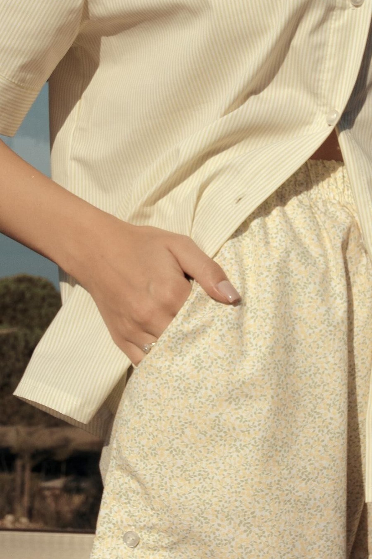 Pyžamo Ophelia působí svěže, lehce a upraveně. Kombinuje hladkou košili s krátkým rukávem a jemně vzorované šortky, takže celek vypadá ženský a zároveň uvolněný.