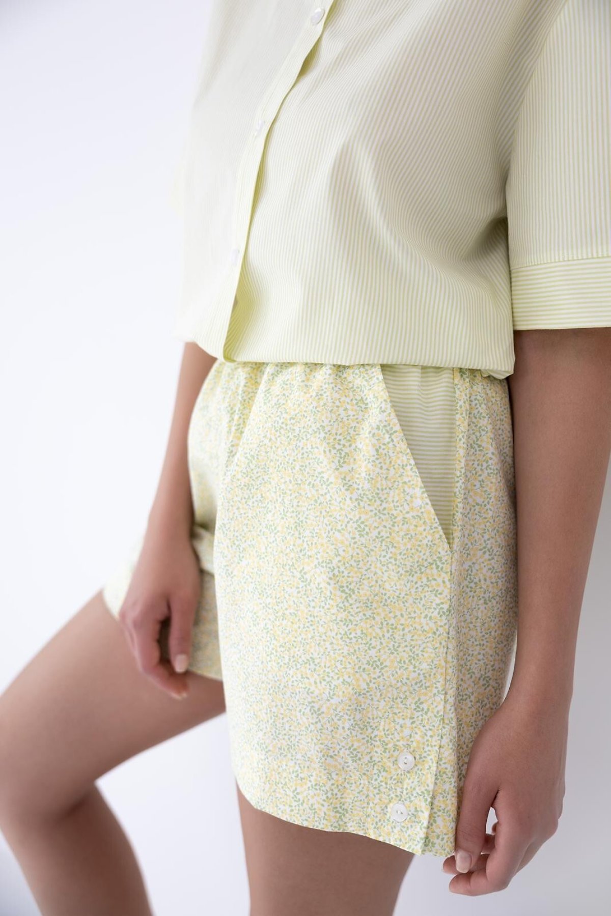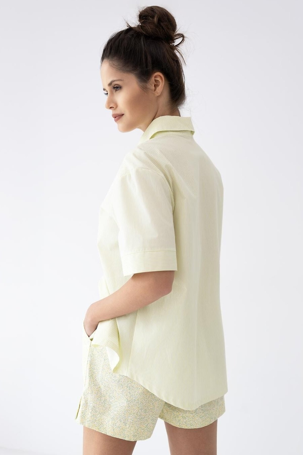 Košile s límečkem a knoflíkovým zapínáním dodává modelu čistý, klasický vzhled, zatímco šortky s pružným pasem a kapsami přinášejí pohodlí pro spaní i domácí nošení. Světlé tóny a jemný vzor podtrhují lehký charakter kompletu na teplejší dny. Materiál tvoří 100% bavlna. Modelka měří 168 cm a má na sobě velikost S.