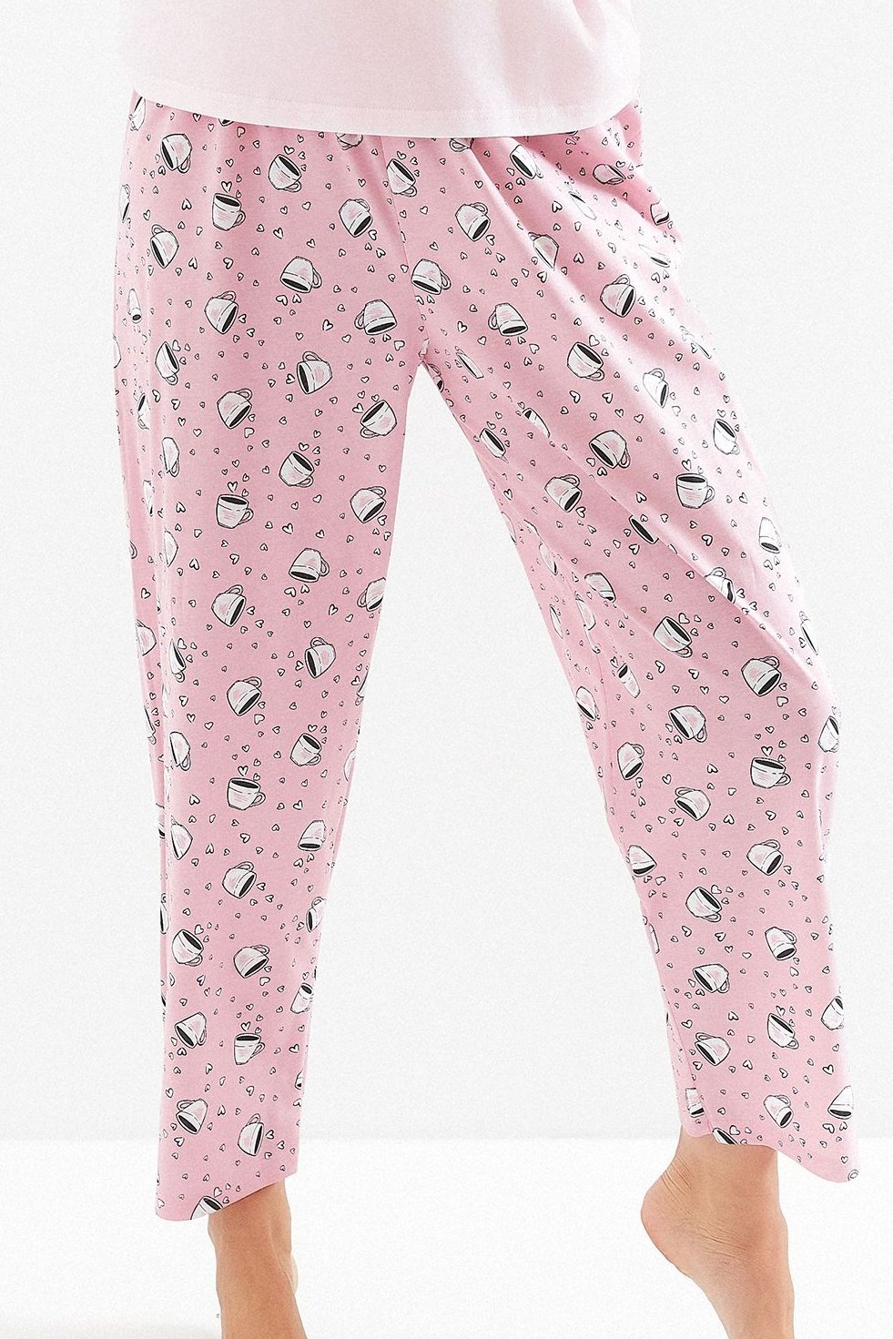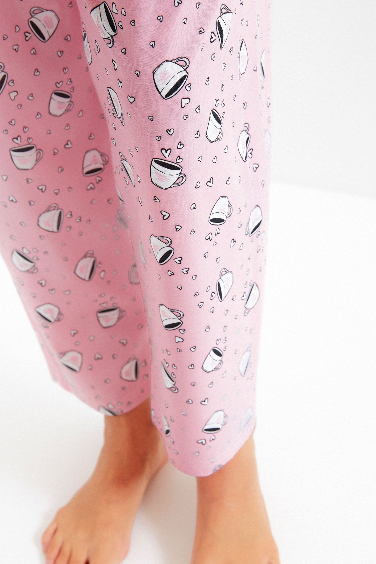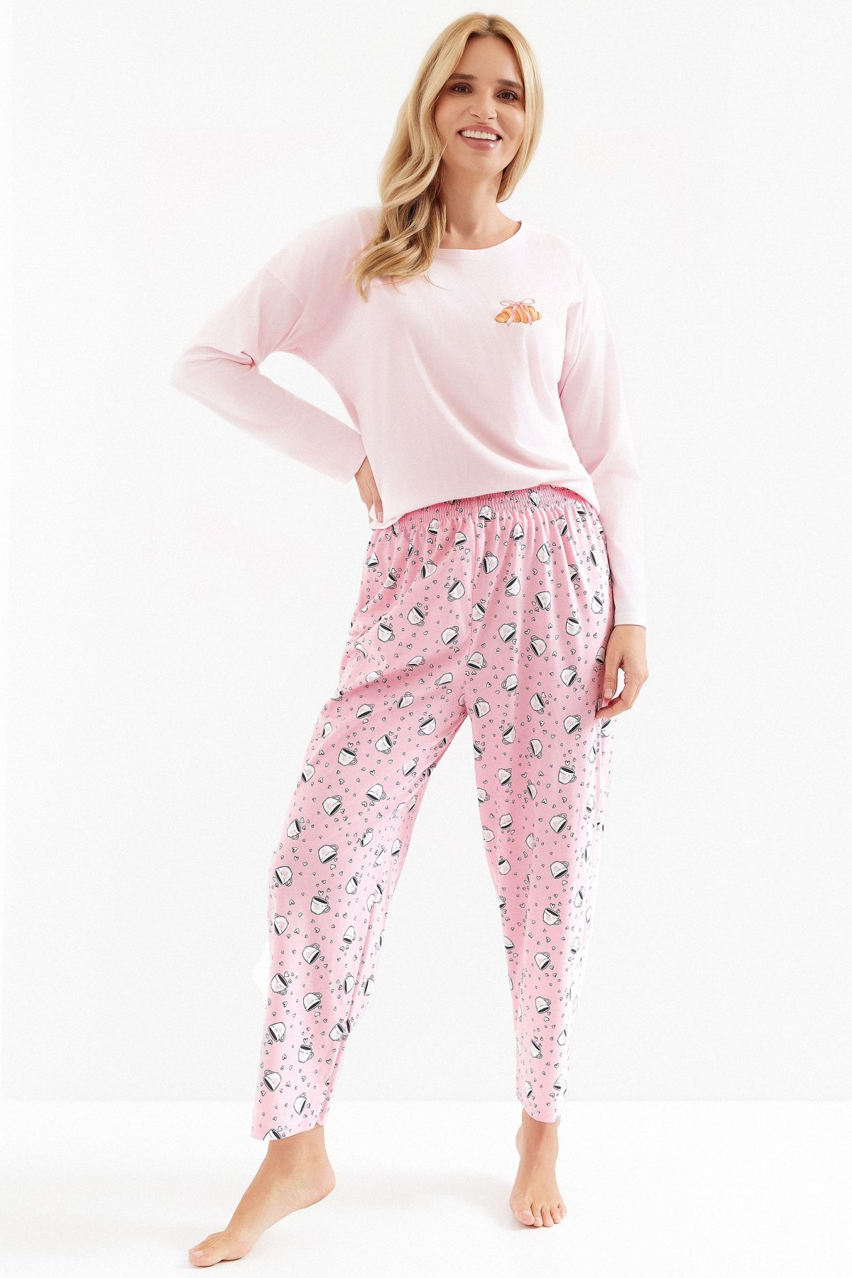 Dámske pyžamo Tori spája príjemnú bavlnenú kvalitu s jemne hravým dizajnom. Svetlé tričko s dlhým rukávom zdobí rozkošný motív croissantu, ktorý navodí pozitívnu náladu hneď po prebudení. Nohavice s veselým vzorom a 7/8 dĺžkou dodávajú modelu mladistvý charakter a vďaka elastickému pásu zaručujú pohodlné nosenie bez nepríjemného tlačenia. Celé pyžamo je vyrobené z mäkkej, priedušnej bavlny, ktorá príjemne hreje a zároveň odvádza vlhkosť.