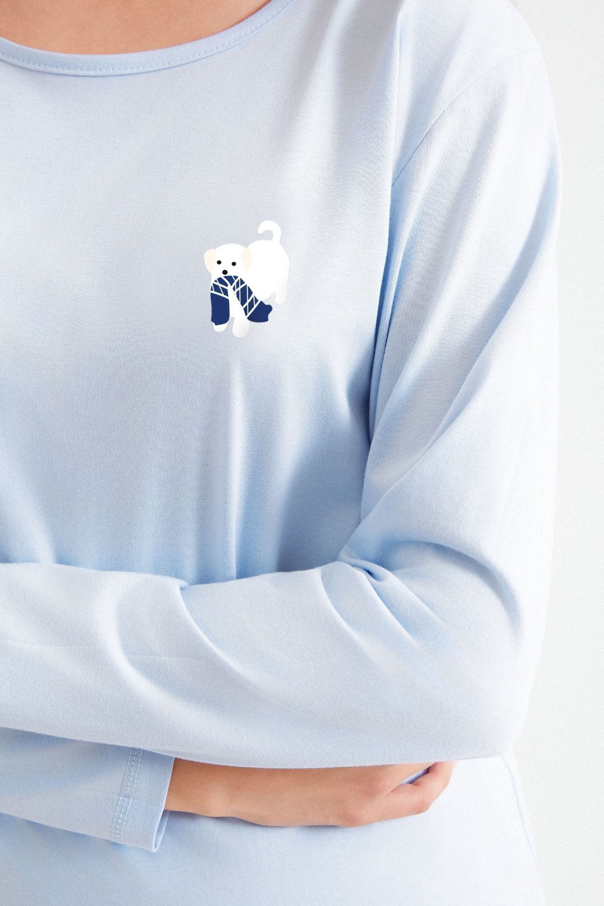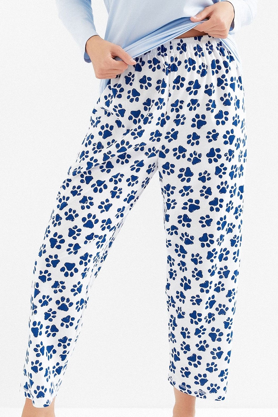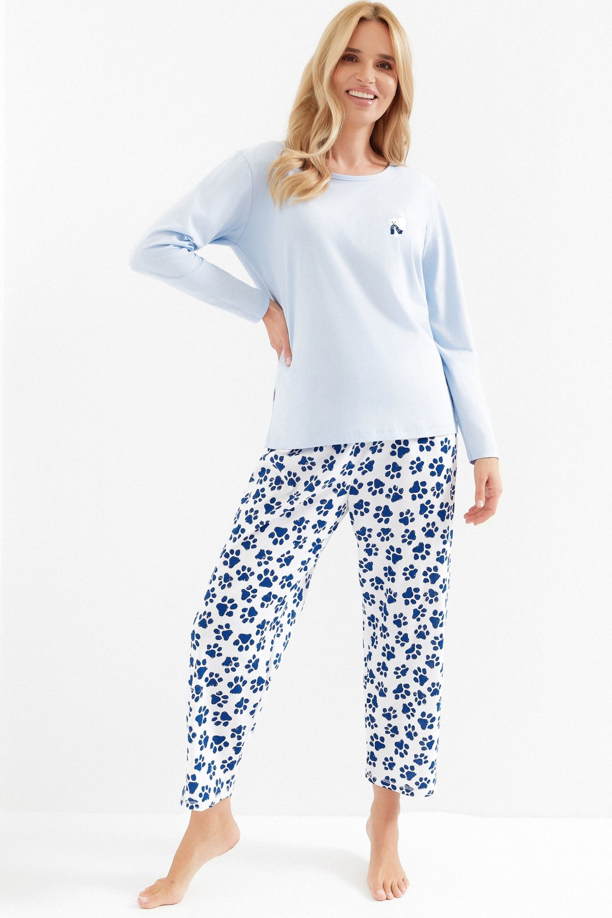 Dámske pyžamo Zola je dokonalým spojením pohodlia, kvality a hravého dizajnu. Vyrobené zo 100% bavlny, je príjemné na dotyk, vhodné aj na citlivú pokožku. Horný diel s okrúhlym výstrihom a dlhým rukávom zdobí rozkošná potlač so psíkom. Spodný diel tvoria vzorované nohavice v 7/8 dĺžke, s elastickou gumou v páse pre perfektné prispôsobenie postave.