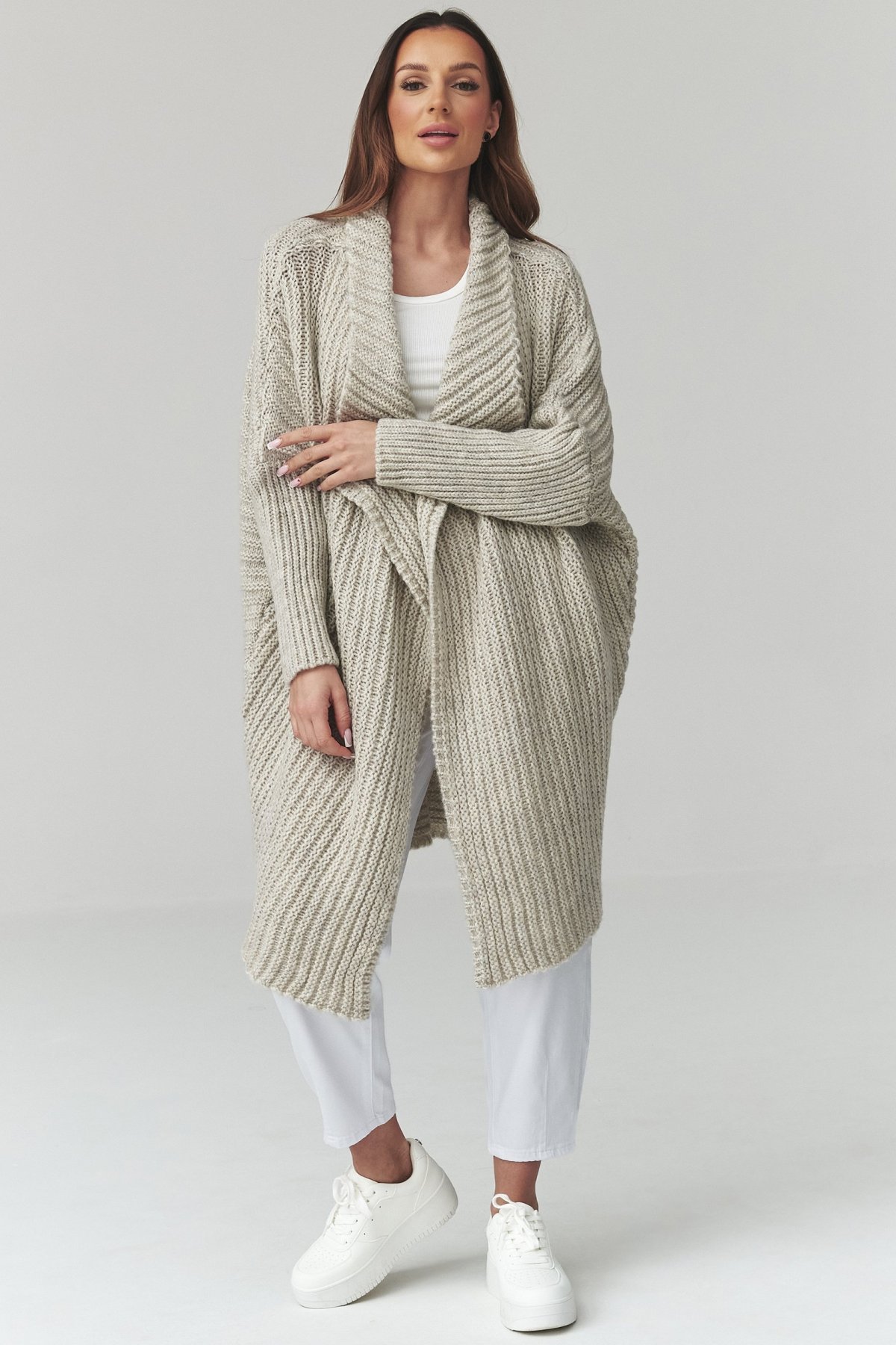 Dlhý dámsky kardigán v svetlo šedej farbe. Kúsok, ktorý spája pohodlie s uvoľnenou eleganciou.