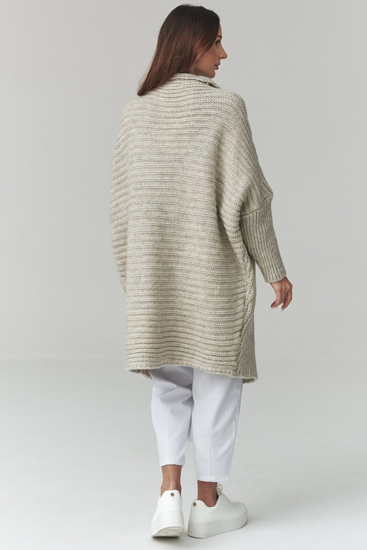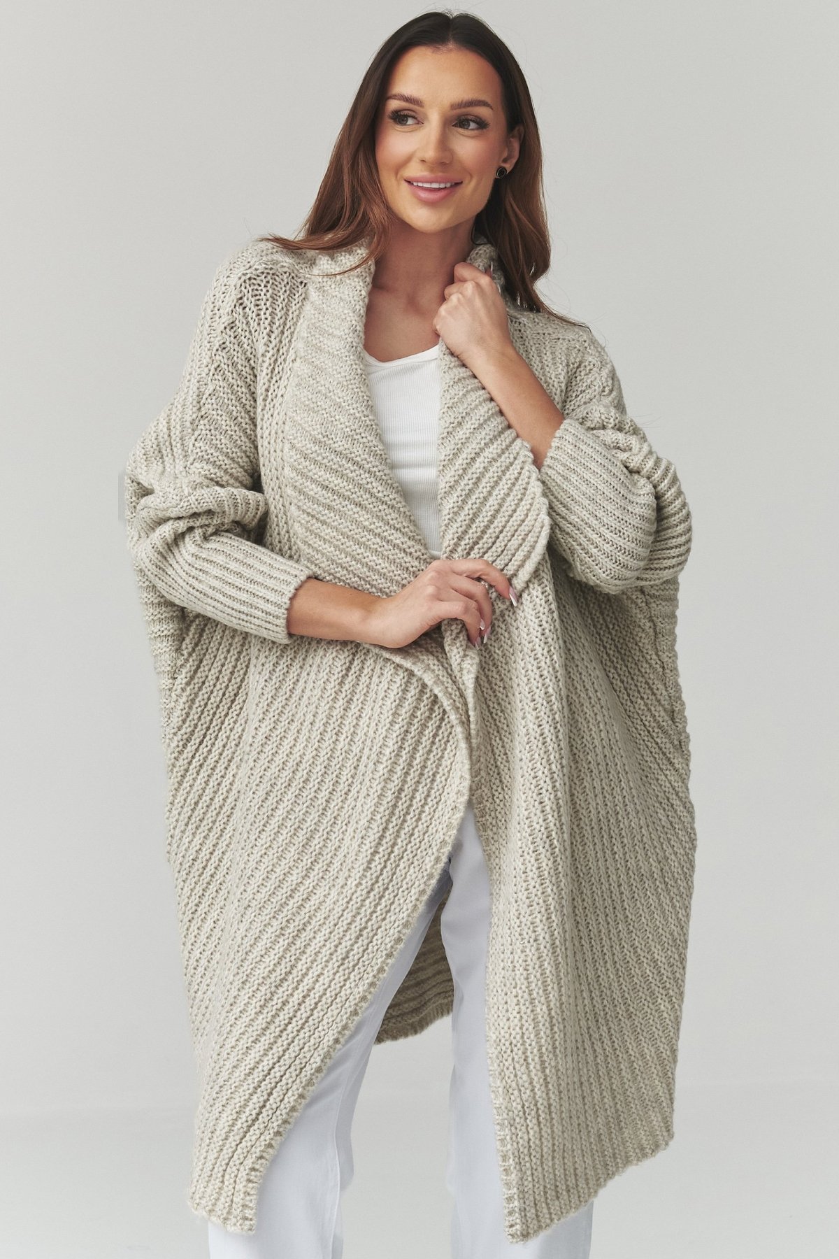 Otvorený strih bez zapínania sa ľahko vrství cez tričko, top aj šaty a vďaka oversize siluete pôsobí ležérne, ale stále upravené. Výrazná štruktúra pleteniny dodáva modelu charakter a robí z neho výrazný prvok každodenného šatníka. Dlhšia dĺžka pekne predĺži siluetu a dobre funguje s nohavicami, legínami aj úzkymi šatami. Zmes akrylu, polyesteru, vlny a polyamidu príjemne zahreje v chladnejších dňoch.