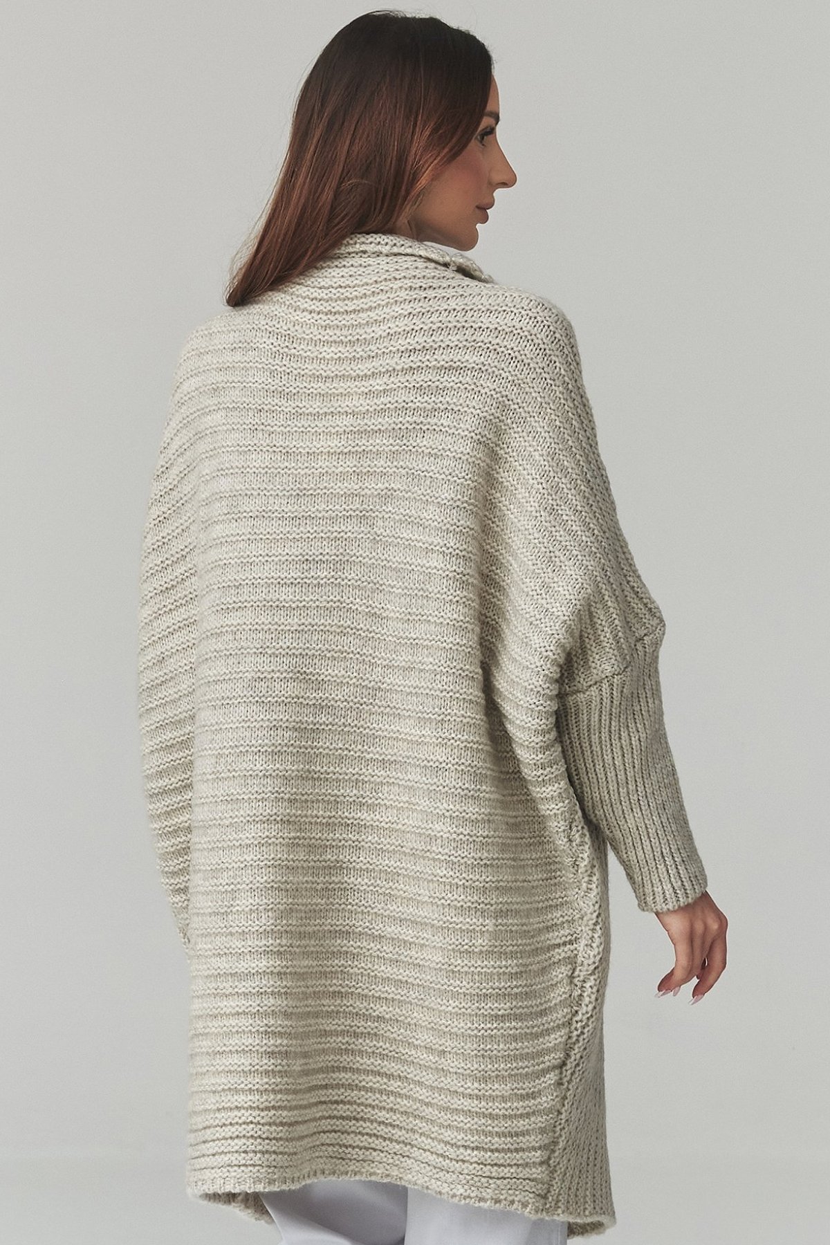 dlhý otvorený kardigán oversize strih pre voľný pohyb výrazný plastický úplet príjemná zmes s obsahom vlny jednotná…