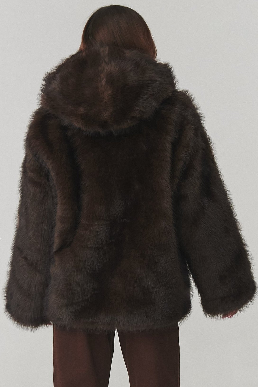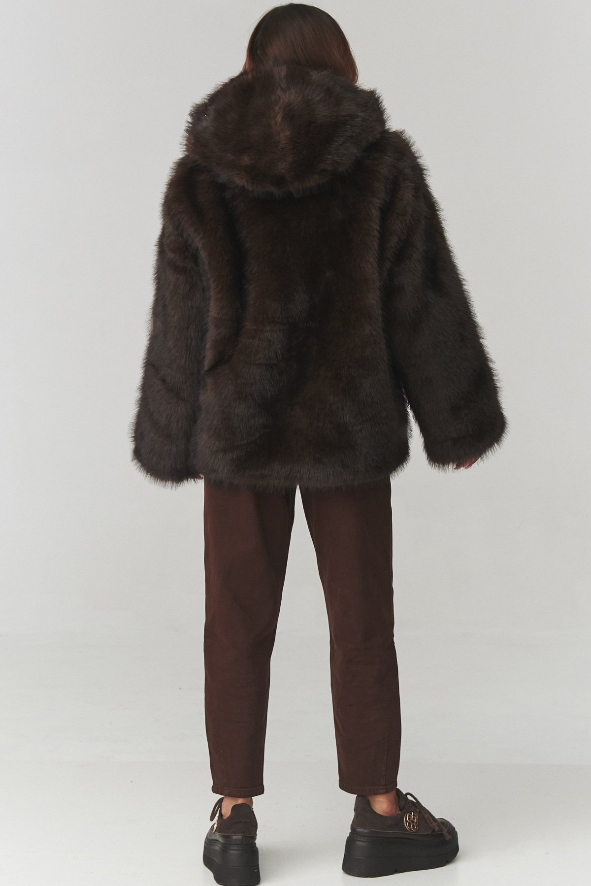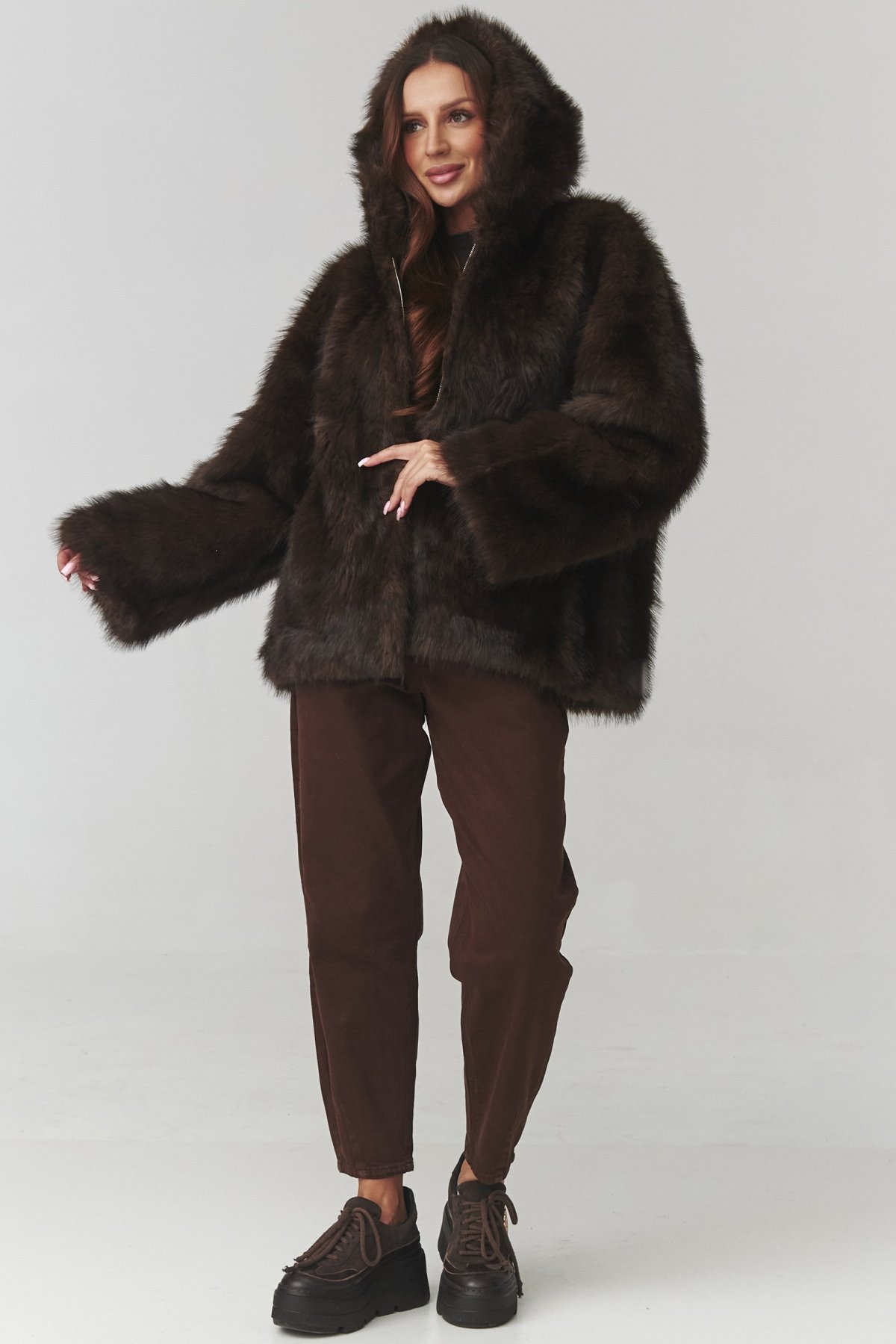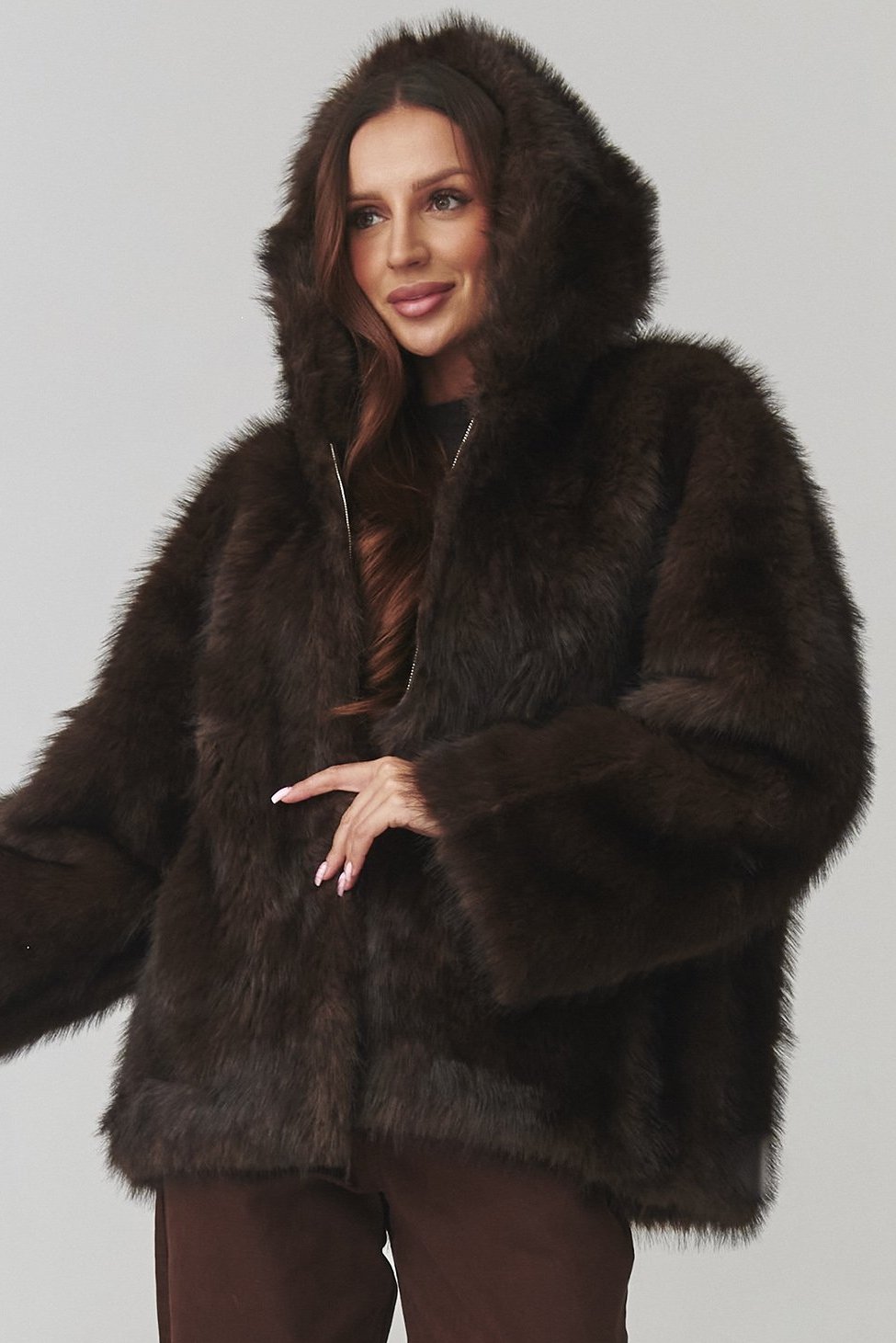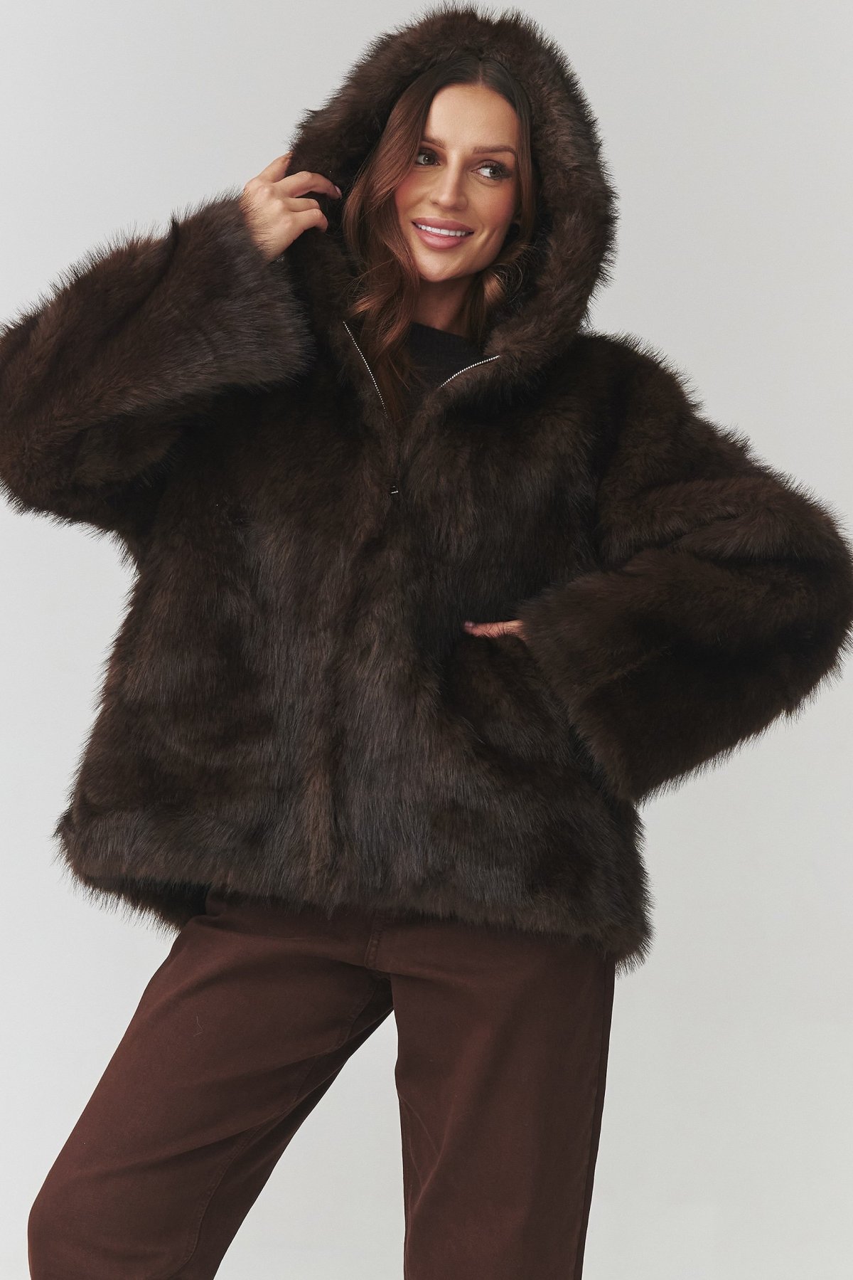 Dámsky umelý kožúšok s kapucňou v atraktívnej hnedej farbe. Luxusný vzhľad a maximum pohodlia.