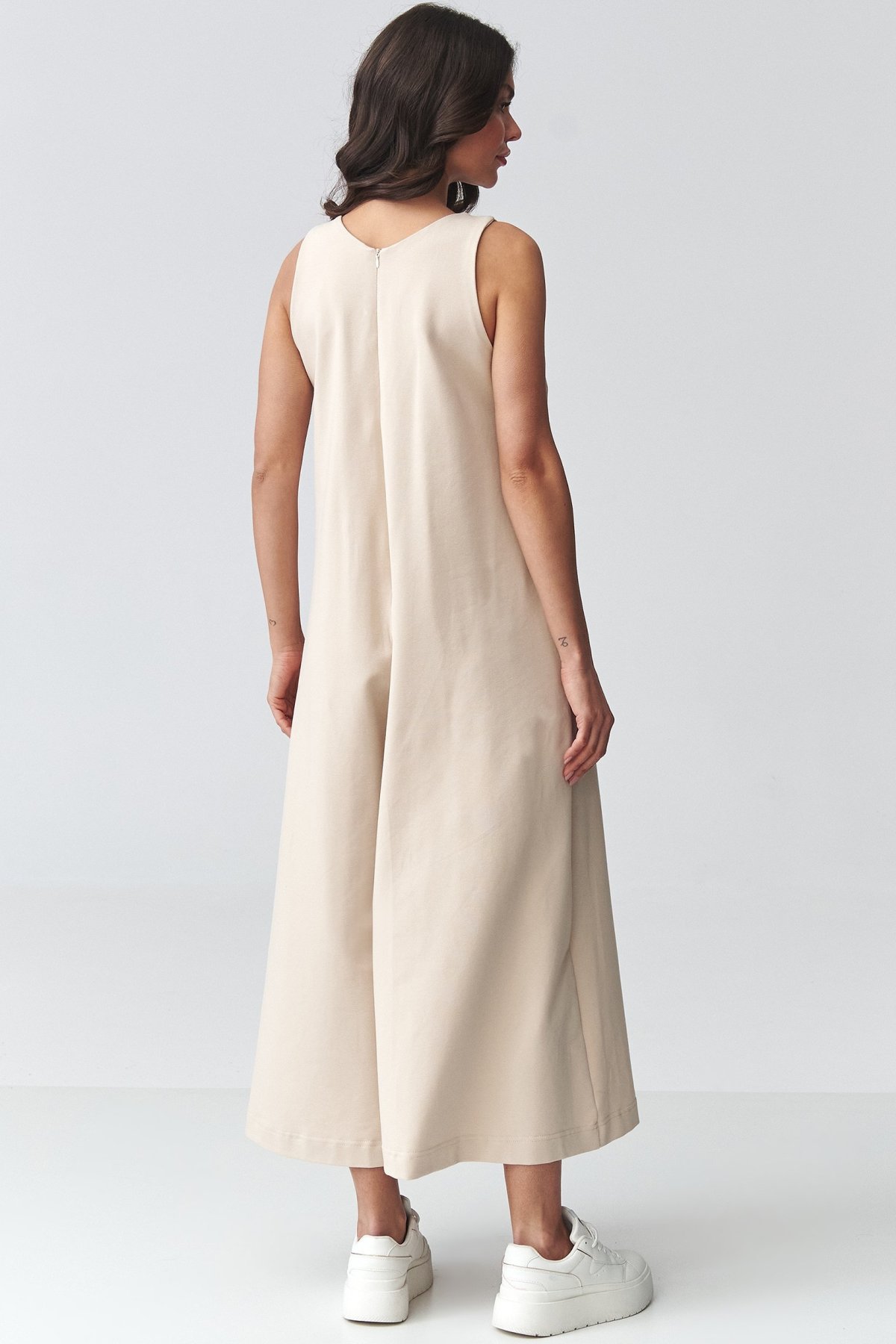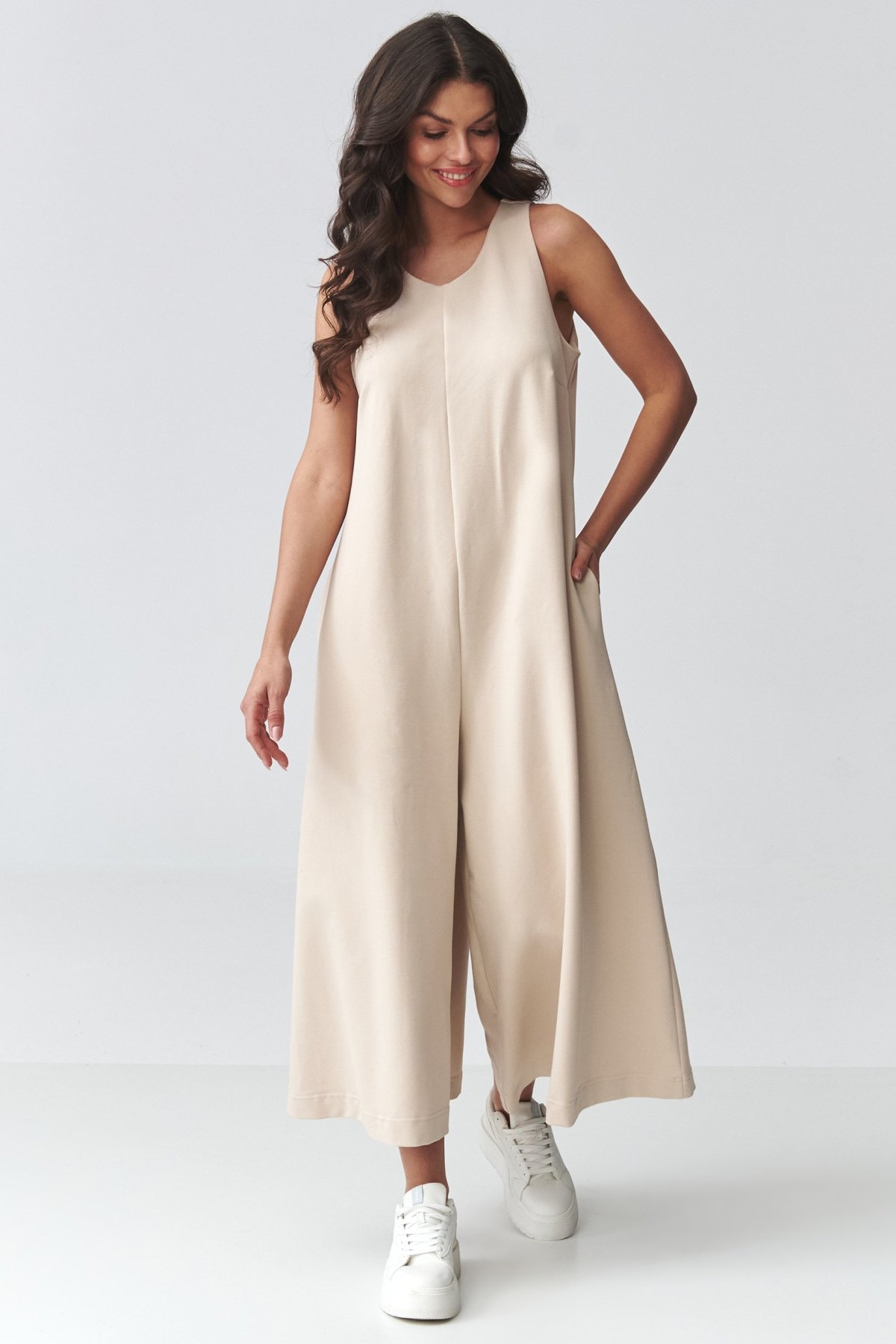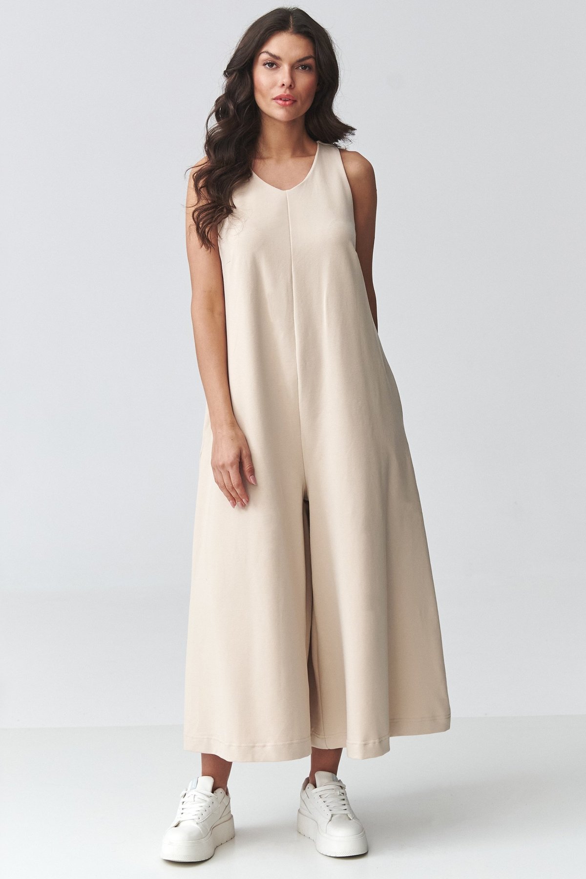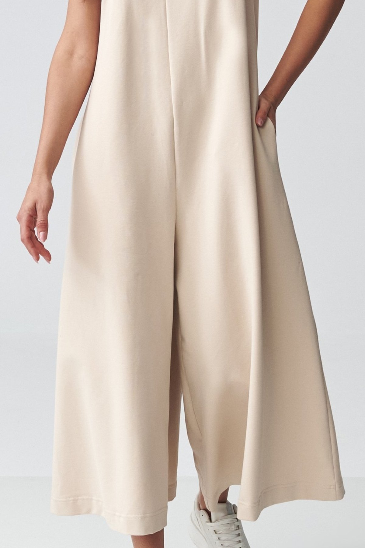 Tieto svetlo béžové dámske overaly so širokými nohavicami spájajú čistý vzhľad, pohodlie a nadčasový štýl.