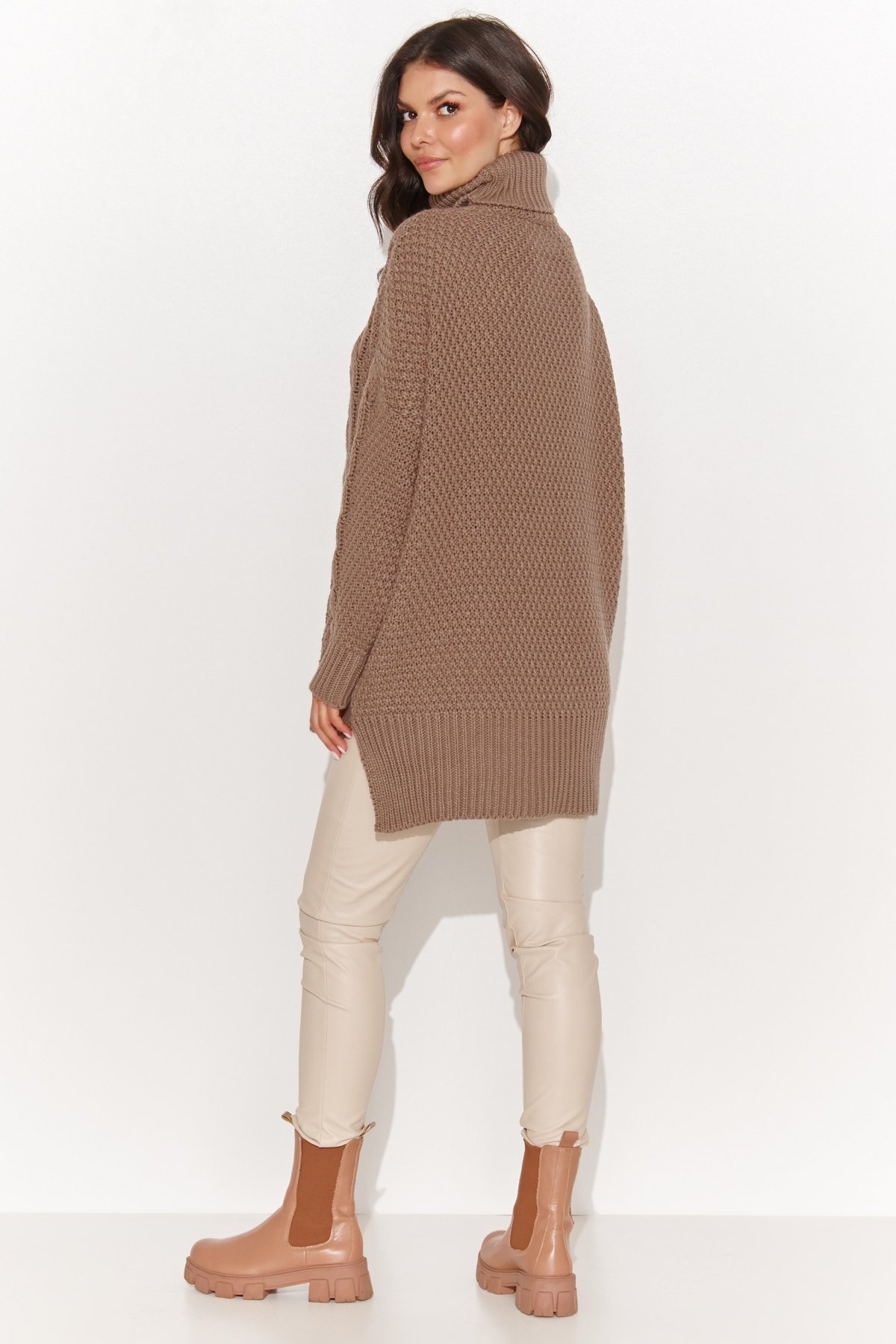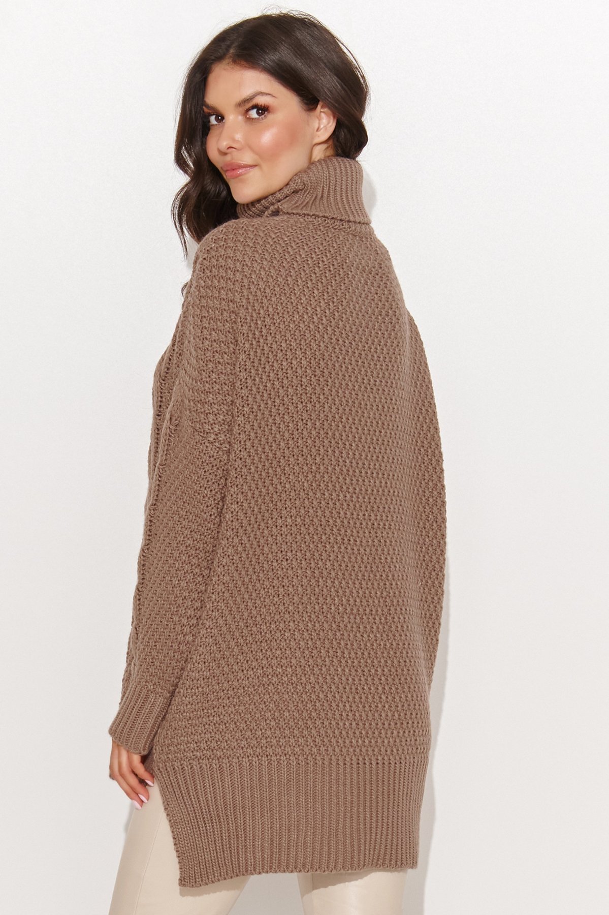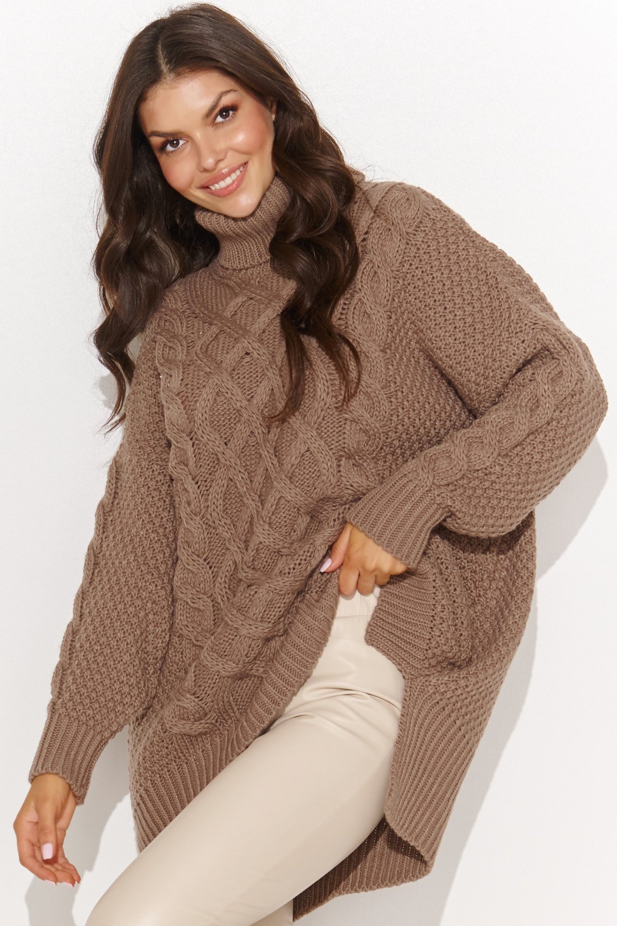 Teplý a tučný dámsky sveter. Skutočná lahôdka pre milovníčky zimného pohodlia. Sveter sa oblieka cez hlavu. Má asymetrický strih, vzadu je o niečo dlhší ako vpredu. Po stranách svetra je viditeľný rozparok, ktorý mu dodáva ľahkosť a voľnosť. Sveter má veľký a teplý rolák a dlhé rukávy s praktickými manžetami na koncoch. Jeho charakteristickým rysom sú rôzne vzory, vrátane efektných vrkôčikov na prednej strane. Tento sveter sa skvele hodí k legínam alebo úzkym nohaviciam a je možné ho tiež nosiť ako tuniku. K dispozícii v troch farebných vyhotoveniach. Tento model svetra vám umožní vyjadriť svoj individuálny štýl a poskytne vám neuveriteľnú voľnosť, zároveň dodá vášmu vzhľadu charakter.