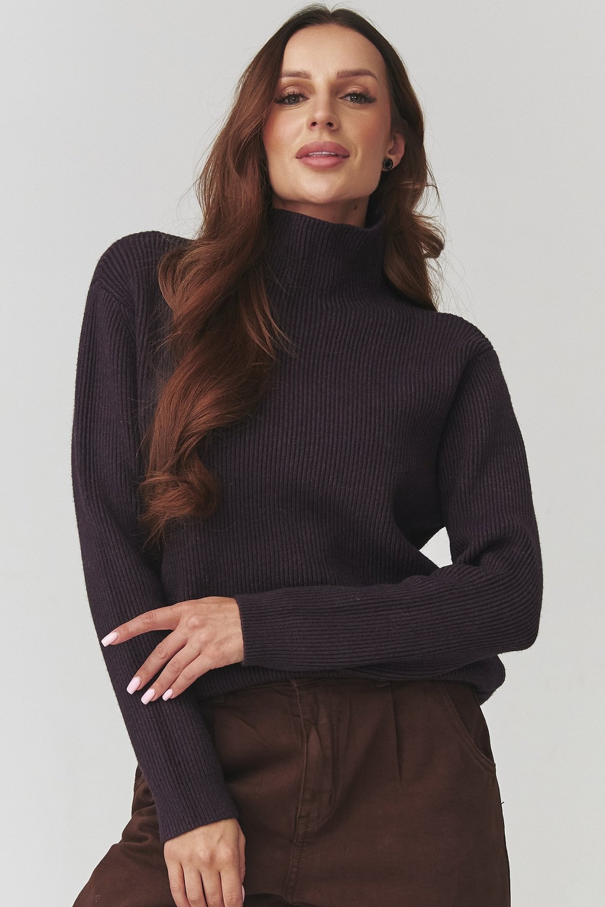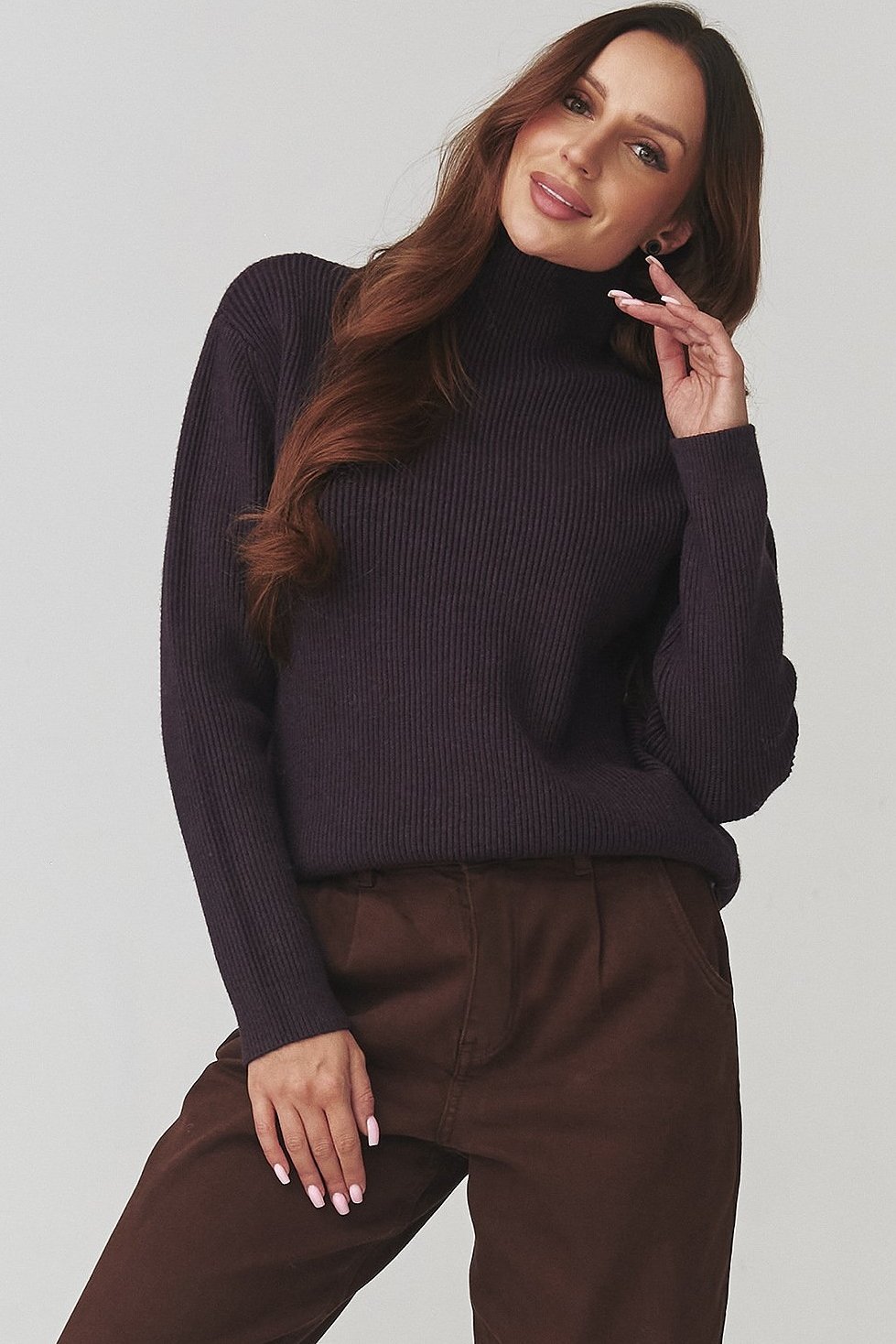 Zvoľte nadčasovú eleganciu v minimalistickom štýle. Dámsky sveter s rolákom v hnedofialovom odtieni je ideálnym kúskom do chladnejších dní. Jemná, rebrovaná štruktúra dodáva svetru moderný vzhľad a pružný úplet sa krásne prispôsobí postave bez toho, aby obmedzoval v pohybe.