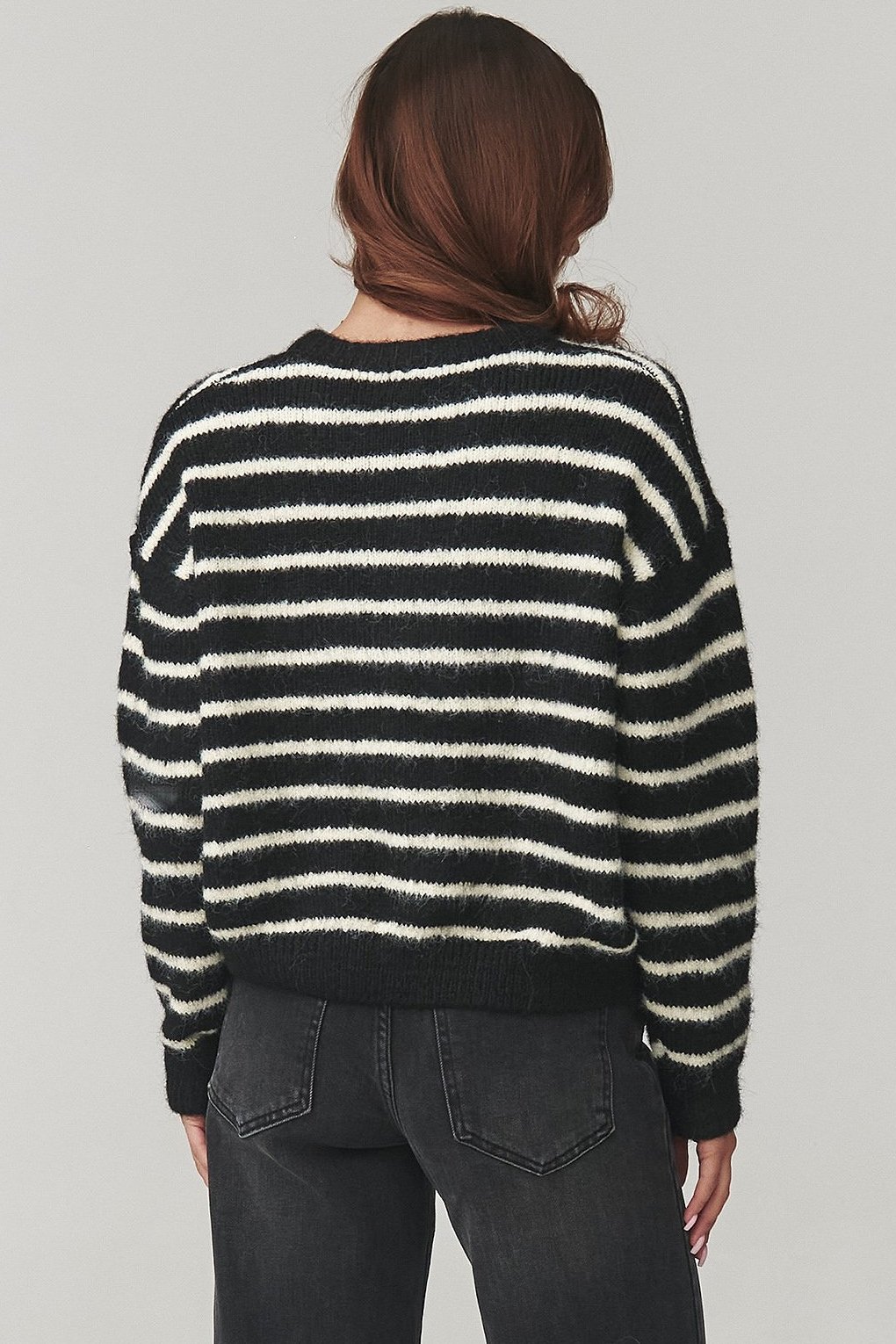 Štýlový pruhovaný sveter v čiernobielom vyhotovení. Nadčasová elegancia a ležérny štýl.