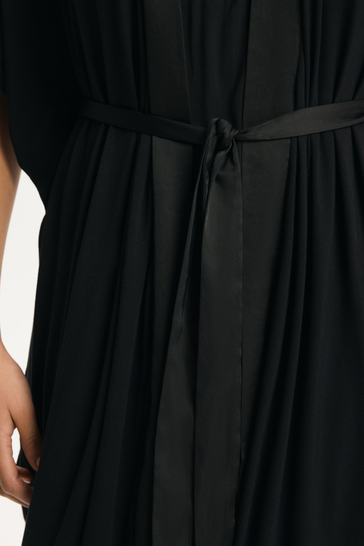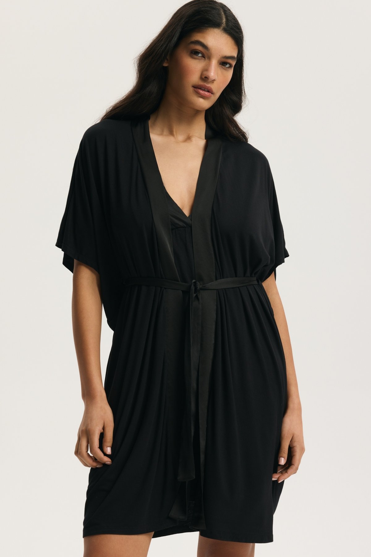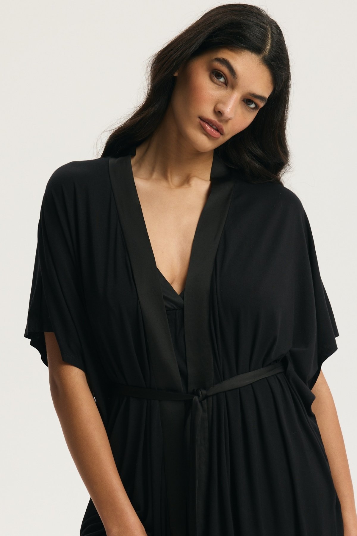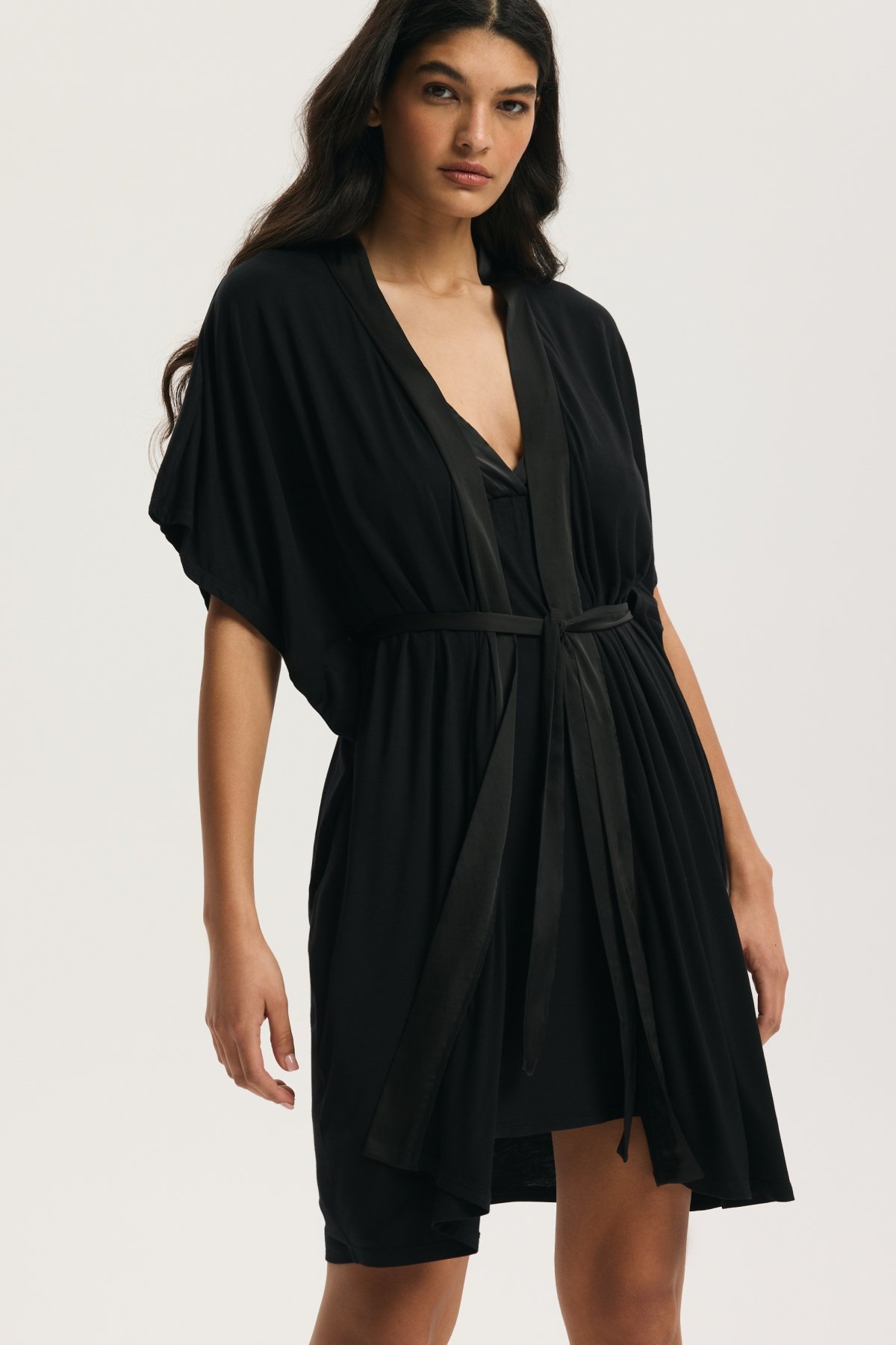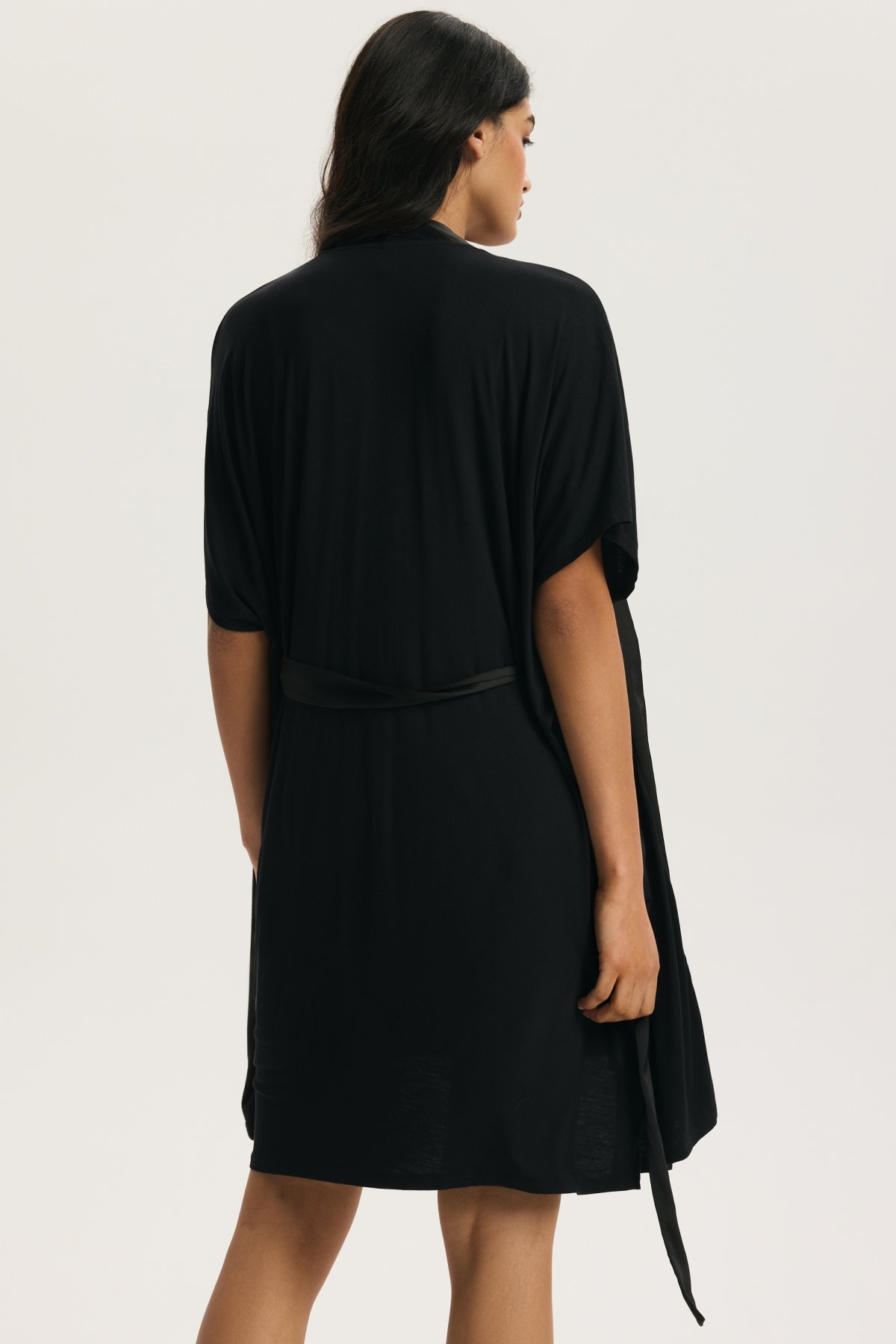 Župan Onyx působí čistě, elegantně a přitom velmi uvolněně. Šálový límec přechází do hlubšího výstřihu do V, který opticky prodlužuje siluetu, zatímco pásek v pase umožní upravit tvar přesně podle toho, jak vám vyhovuje. Materiál s vysokým podílem viskózy je příjemný na dotek a měkce splývá po těle. Volnější rukávy v kimono stylu dodávají modelu lehkost a pohodlnější pohyb, délka nad kolena pak zachovává vzdušný a ženský vzhled. Černé provedení podtrhuje nadčasový charakter a snadno se kombinuje s dalšími kousky z domácího šatníku.