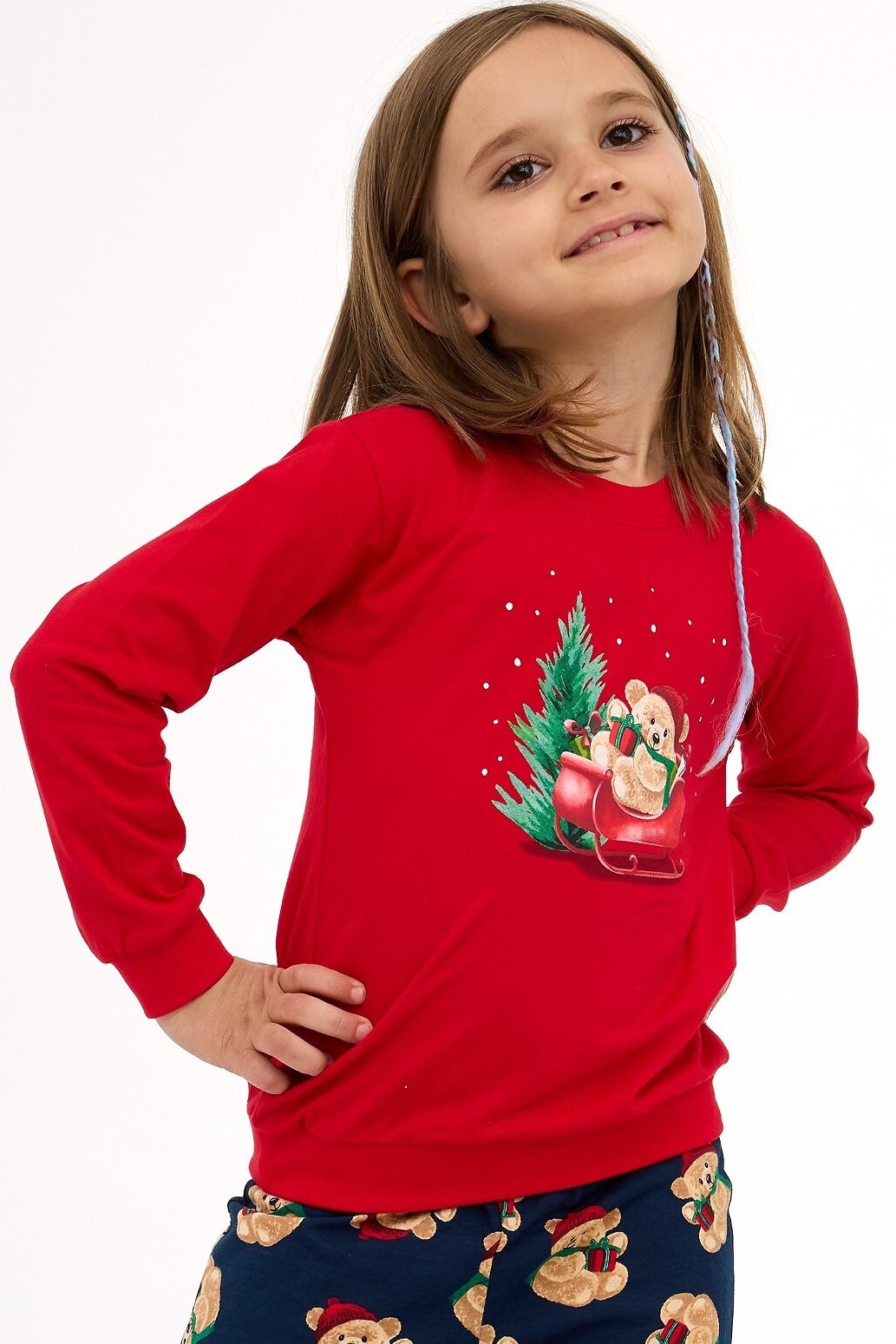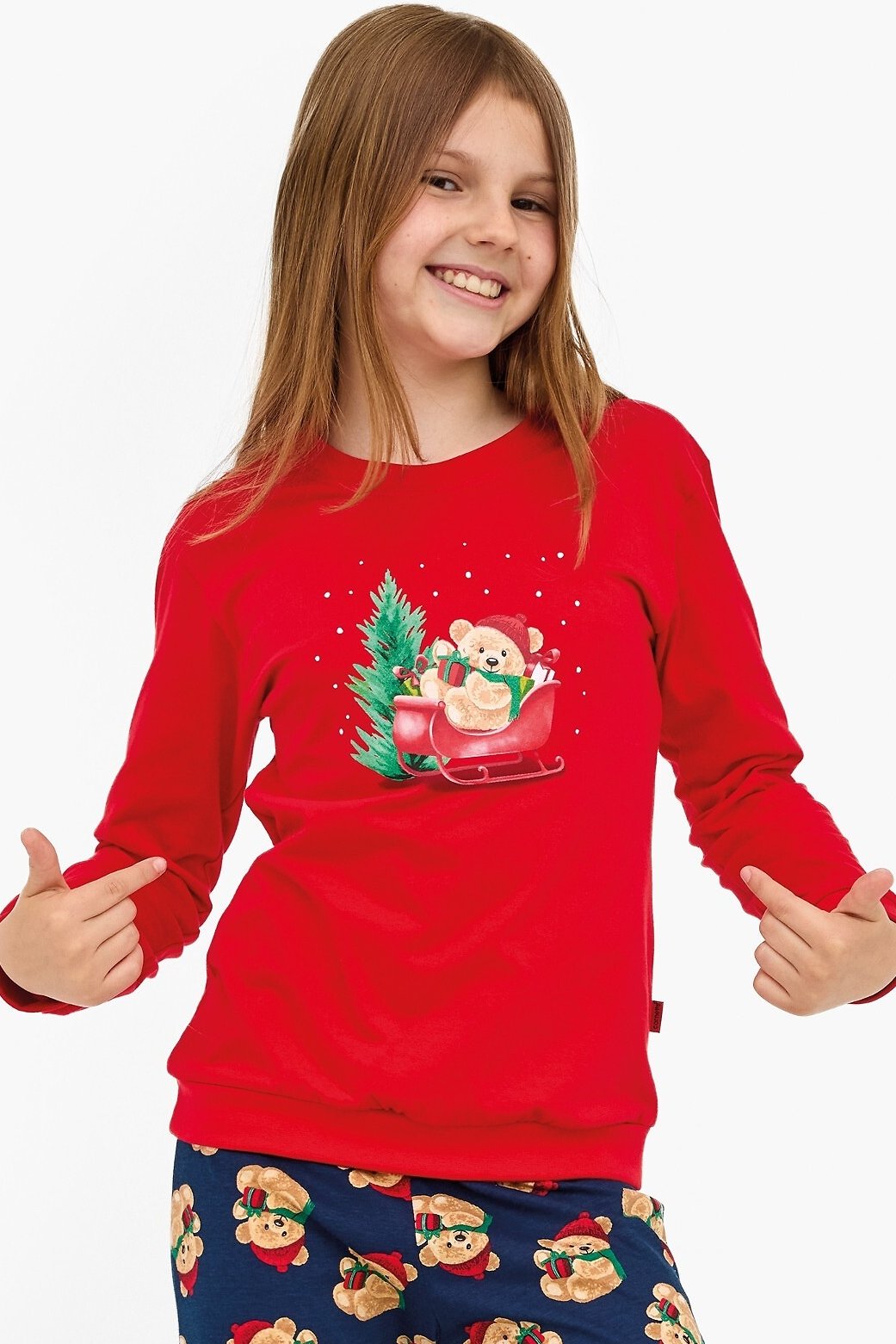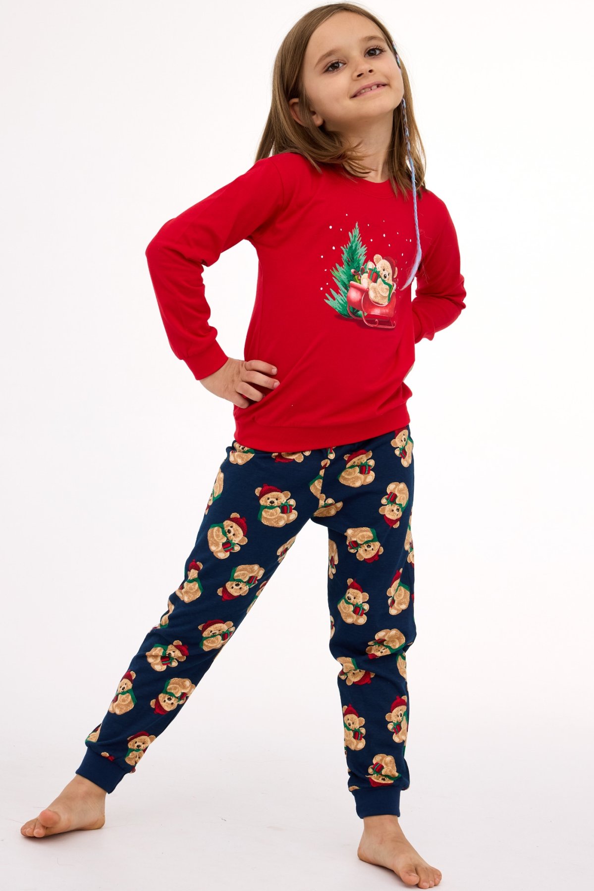Dievčenské pyžamo Teddy z vianočnej kolekcie je hravý komplet, ktorý zaručí pohodlie aj sviatočnú atmosféru. Mäkká bavlna je príjemná k pokožke a zaistí pokojný spánok, zatiaľ čo voľnejší strih poskytne voľnosť pohybu. Farebná potlač s motívom medvedíka poteší každú malú slečnu a dodá pyžamu kúzelný vzhľad. Dlhé nohavice s pružným pásom sa ľahko prispôsobia postave a manžety na rukávoch aj nohaviciach zaručia maximálne pohodlie.