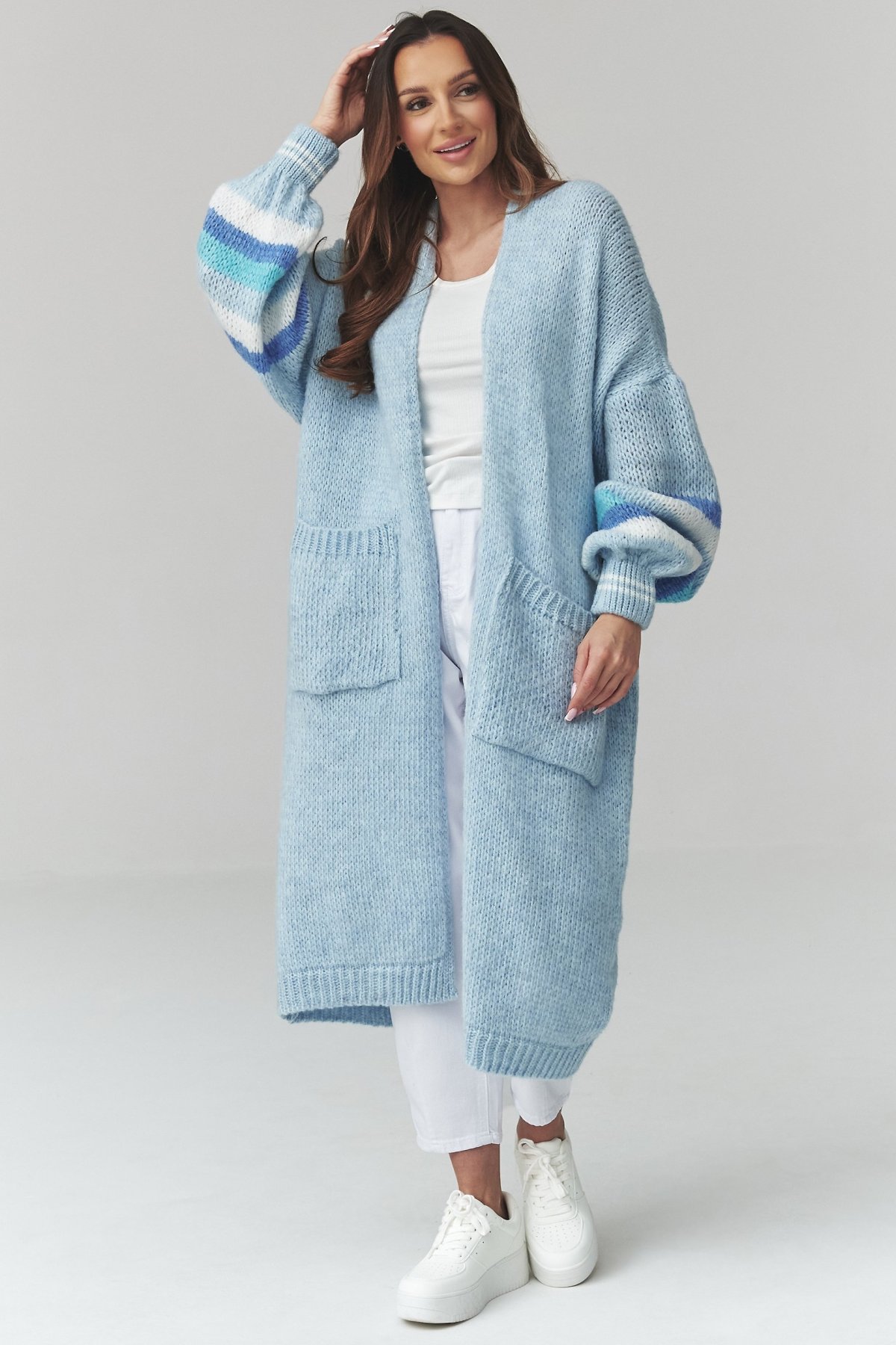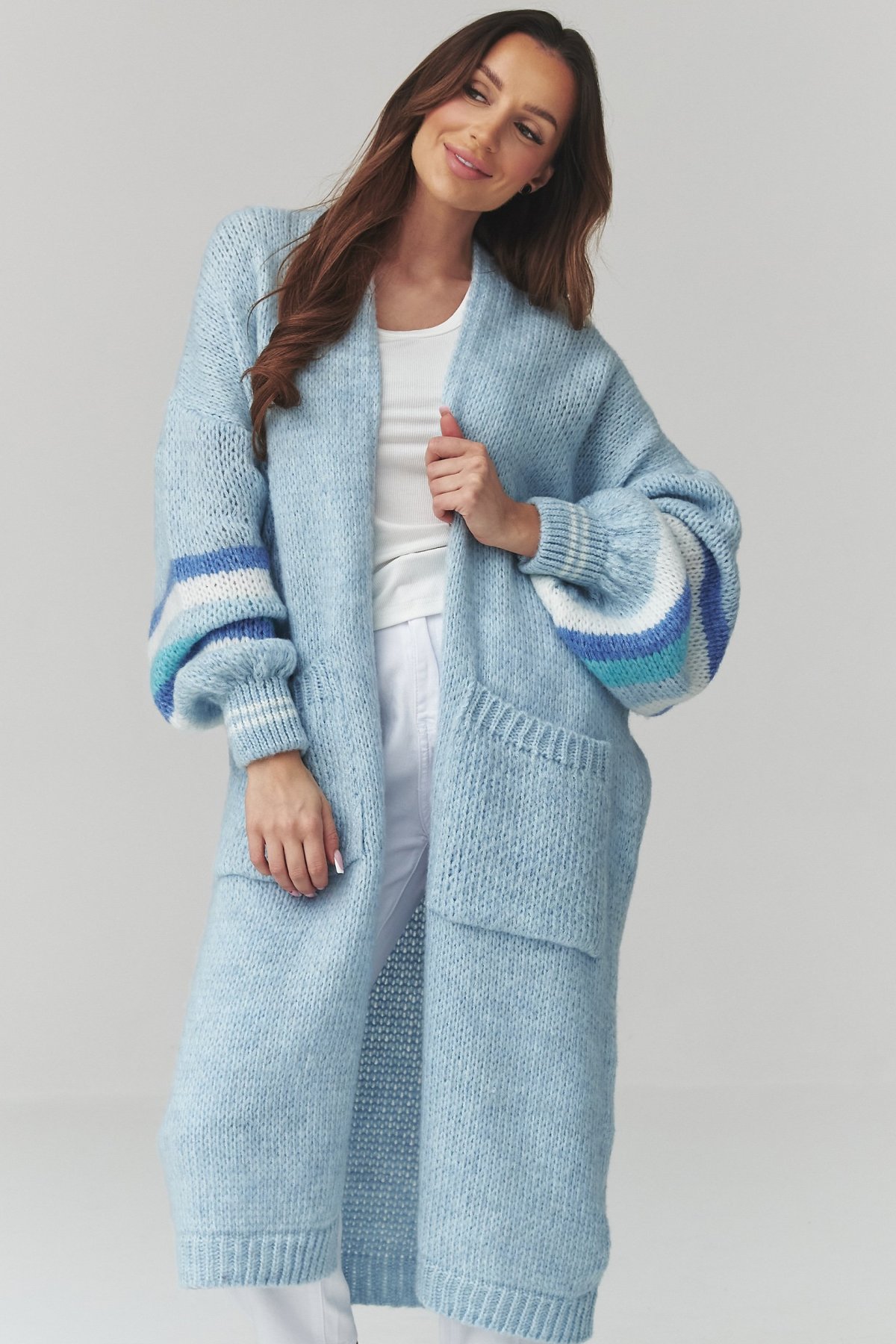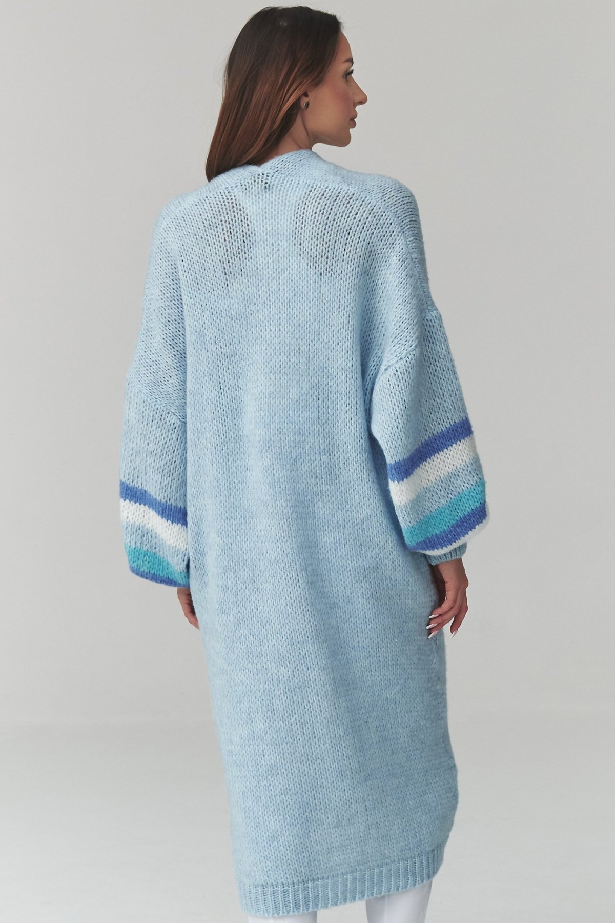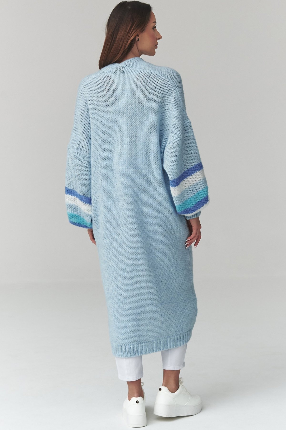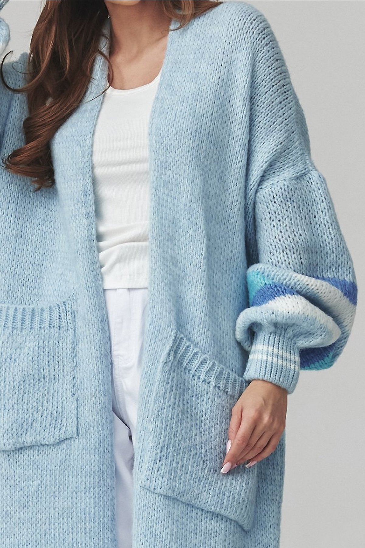 Dlouhý kardigan světle modré barvy je kousek, který přidá vrstveným outfitům výraz a zároveň zůstane pohodlný pro běžné nošení.