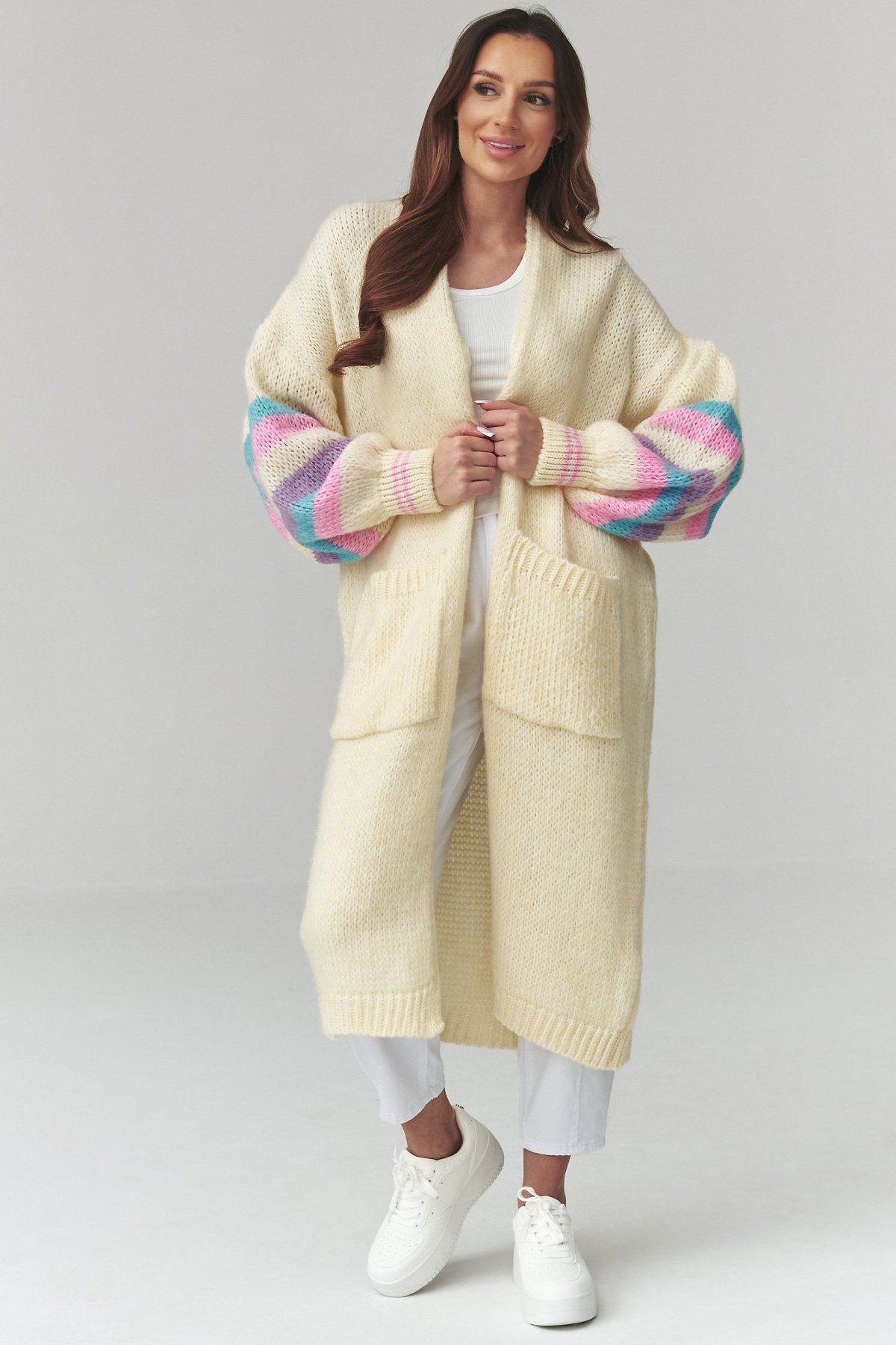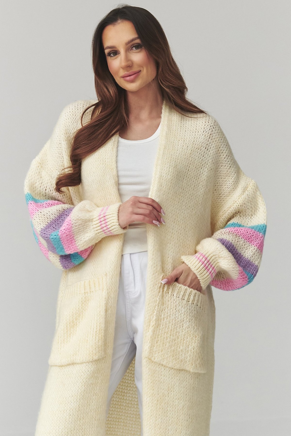 Dlouhý kardigan světle žluté barvy je kousek, který přidá vrstveným outfitům výraz a zároveň zůstane pohodlný pro běžné nošení.