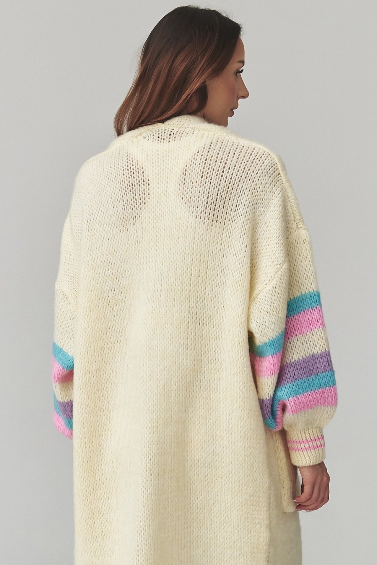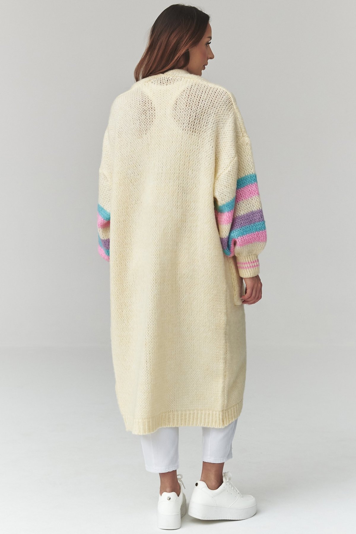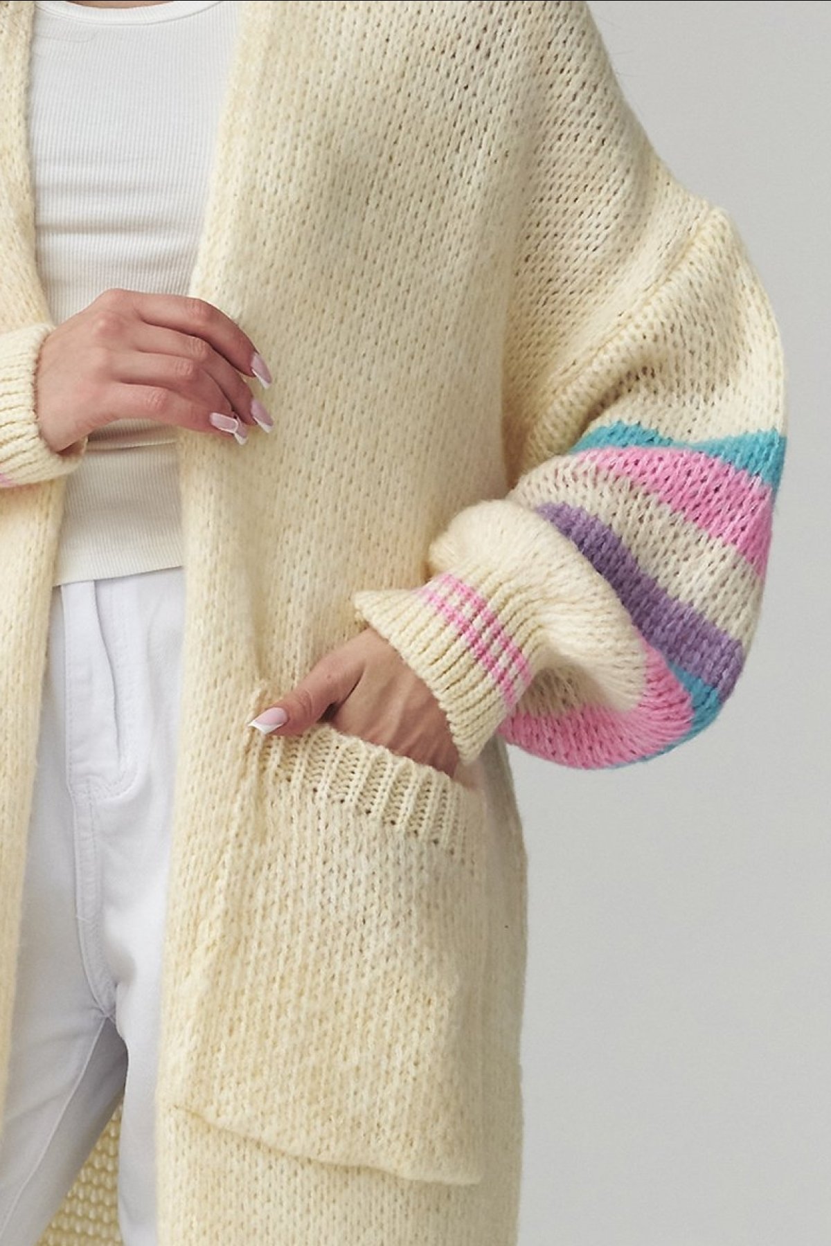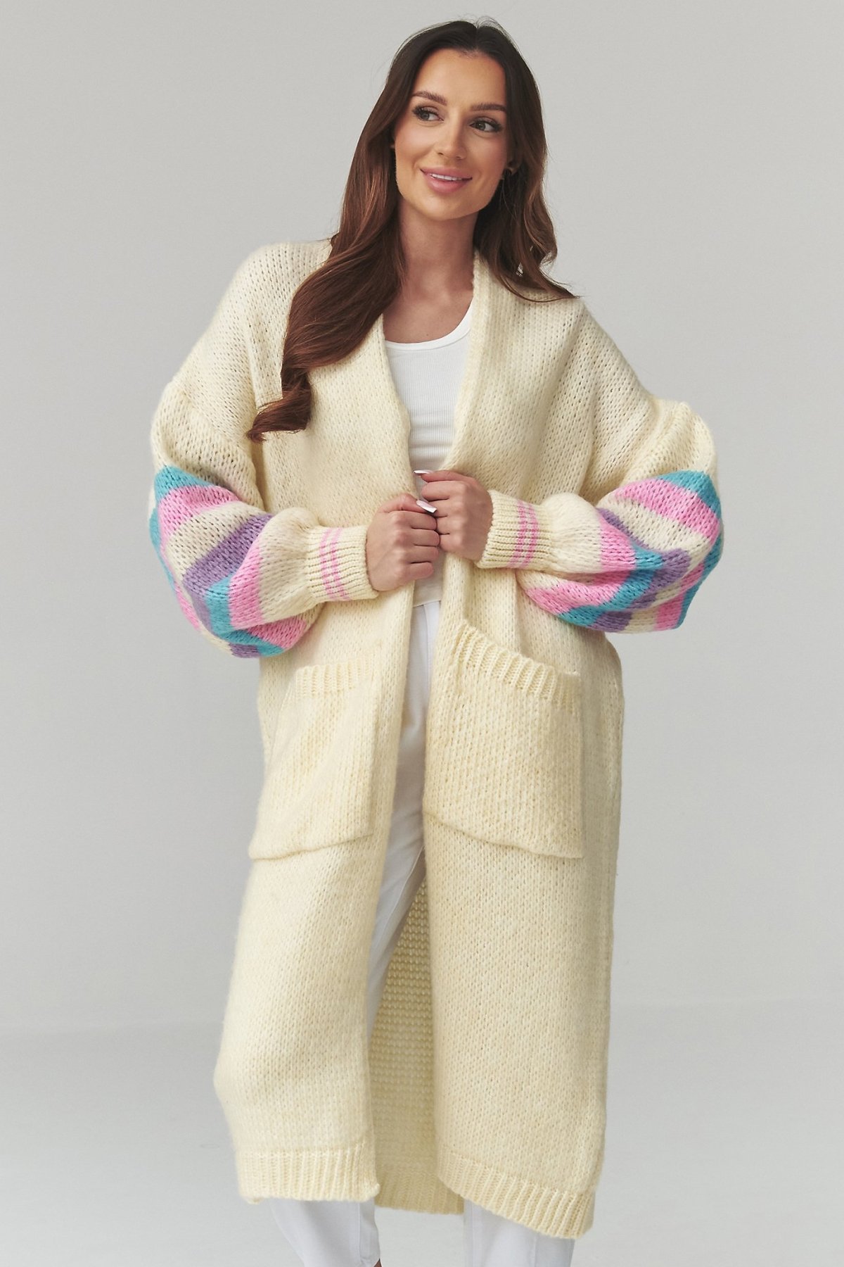 Volnější oversize střih se dobře nosí přes tričko, košili i šaty a vytváří uvolněnou siluetu bez zbytečné těžkosti. Výrazným detailem jsou pruhy na rukávech, které oživují minimalistický vzhled a dodávají modelu osobitý akcent. Velké kapsy zvyšují praktičnost, takže kardigan využijete doma, ve městě i na cestách. Díky delšímu střihu příjemně kryje a působí útulně, zatímco směs akrylu, polyesteru, vlny a polyamidu pomáhá zachovat pohodlí i měkký omak.
