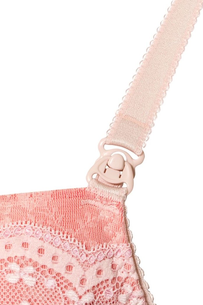 Vystužený model dojčiacej podprsenky vytvorený s láskou pre všetky mamičky, ktoré si chcú dopriať pohodlie a eleganciu aj počas dojčenia. Košíčky z jemnej peny sú potiahnuté jemným tylom a čipkou, čo dodáva podprsenke ľahký a ženský vzhľad. Vďaka praktickému systému KLIK je možné košíček ľahko odopnúť jednou rukou, čo uľahčuje dojčenie dieťaťa. Kostice aj bočné výstuhy poskytujú potrebnú oporu a pomáhajú udržať tvar pŕs, zatiaľ čo široké nastaviteľné ramienka zaručujú pohodlie po celý deň. Elegantný detail v podobe mašličky medzi košíčkami a kvalitné materiály robia z tejto podprsenky ideálnu voľbu pre ženy, ktoré chcú spojiť funkčnosť, komfort a jemnú ženskosť.