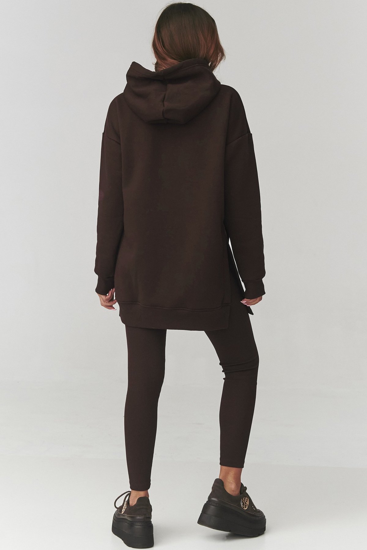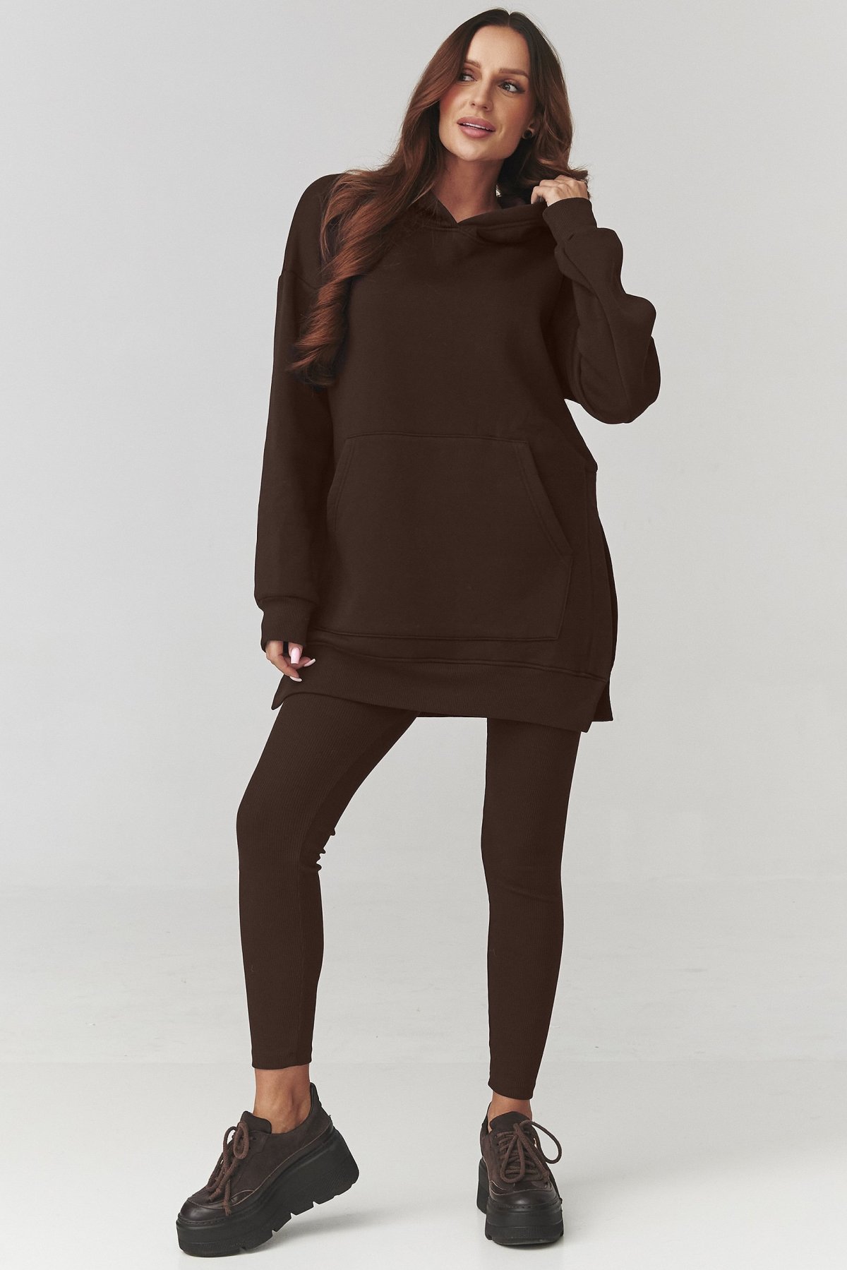 Dlhá mikina s kapucňou a vreckom typu klokanka pôsobí moderne a ležérne, zatiaľ čo priliehavé legíny zvýraznia ženské krivky. Oversize strih horného dielu krásne kontrastuje s úzkym spodným, čím vzniká vyvážený a štýlový look.