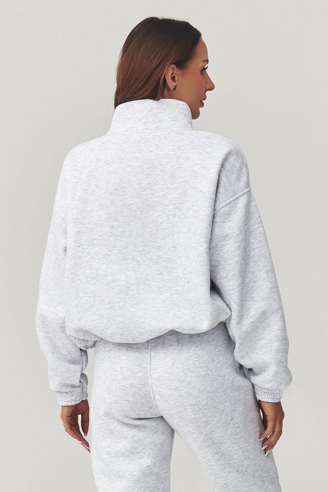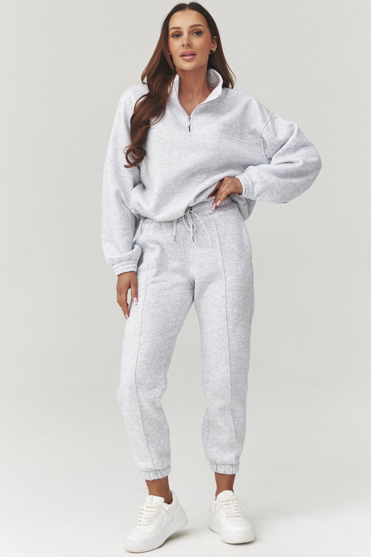 Volnější mikina s krátkým zipem a stahováním ve spodní části umožňuje přizpůsobit tvar podle potřeby – od sportovního po ležérně elegantní. Kalhoty s pružným pasem a ozdobnými švy dodávají soupravě ženský, moderní vzhled, zatímco žebrované konce nohavic zajistí perfektní padnutí.