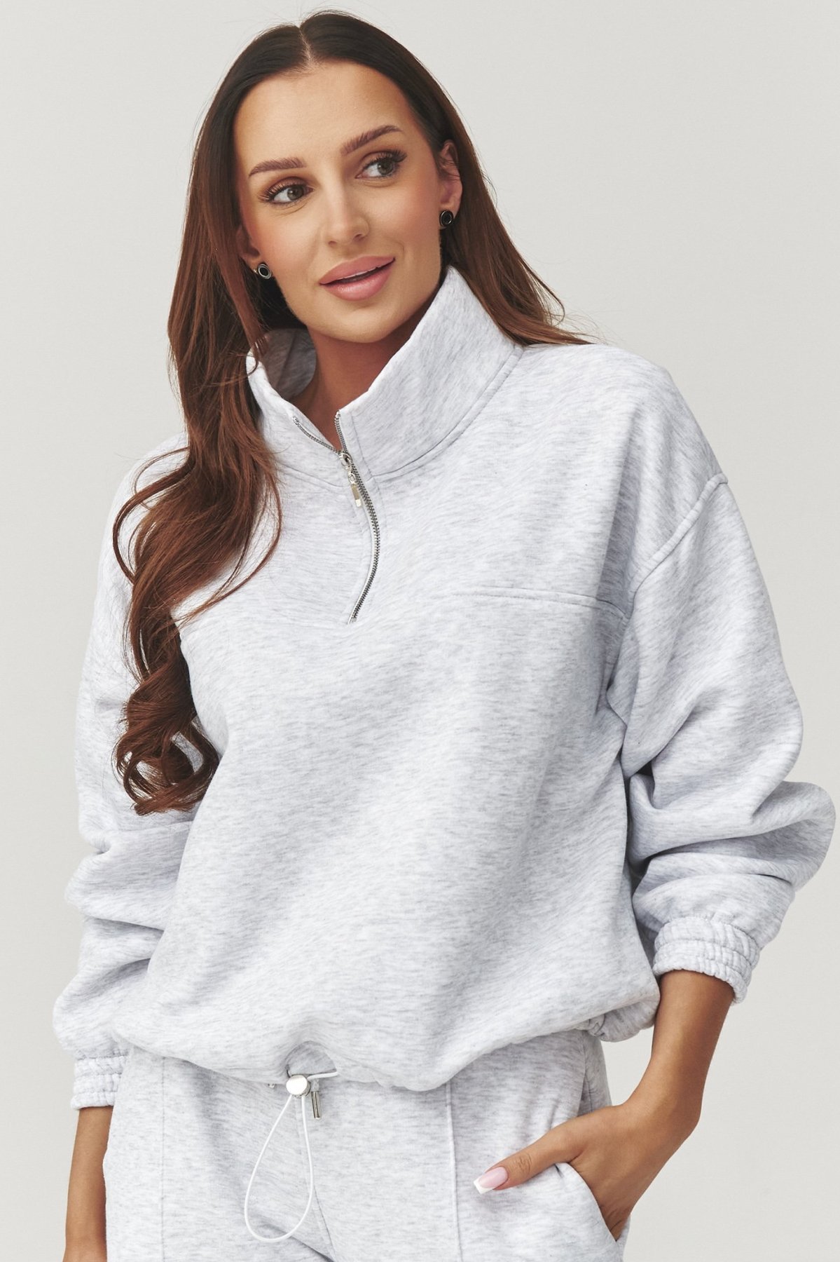 - mikina s krátkým zipem, stojáčkem a nastavitelným spodním lemem
