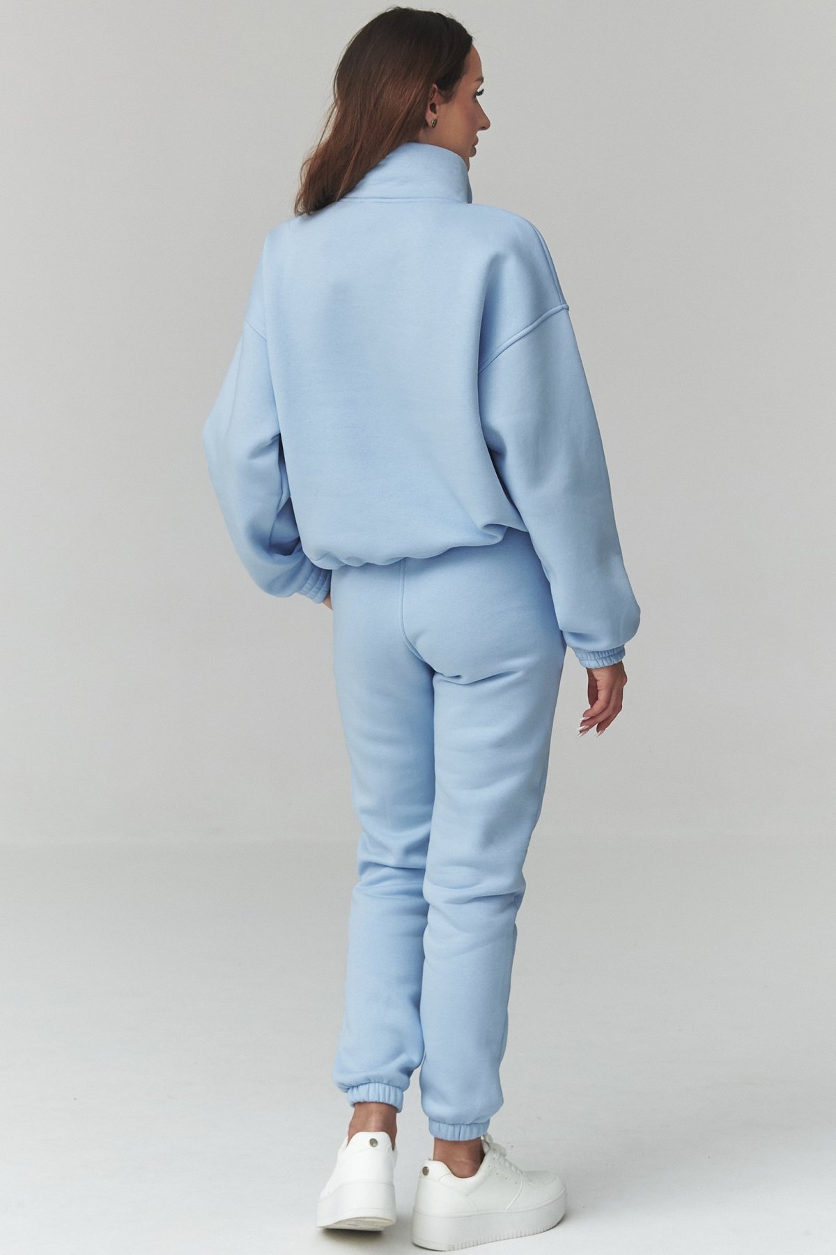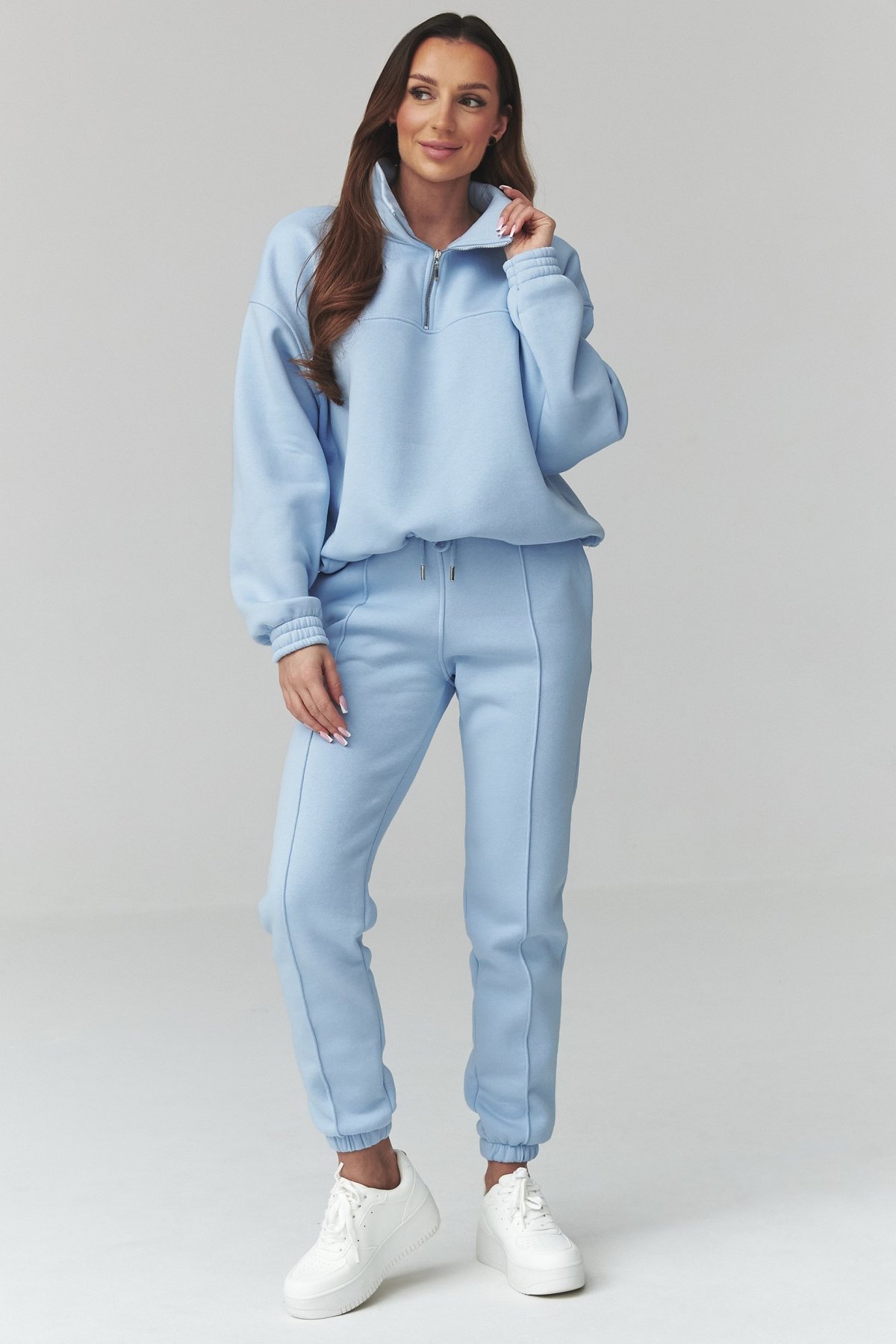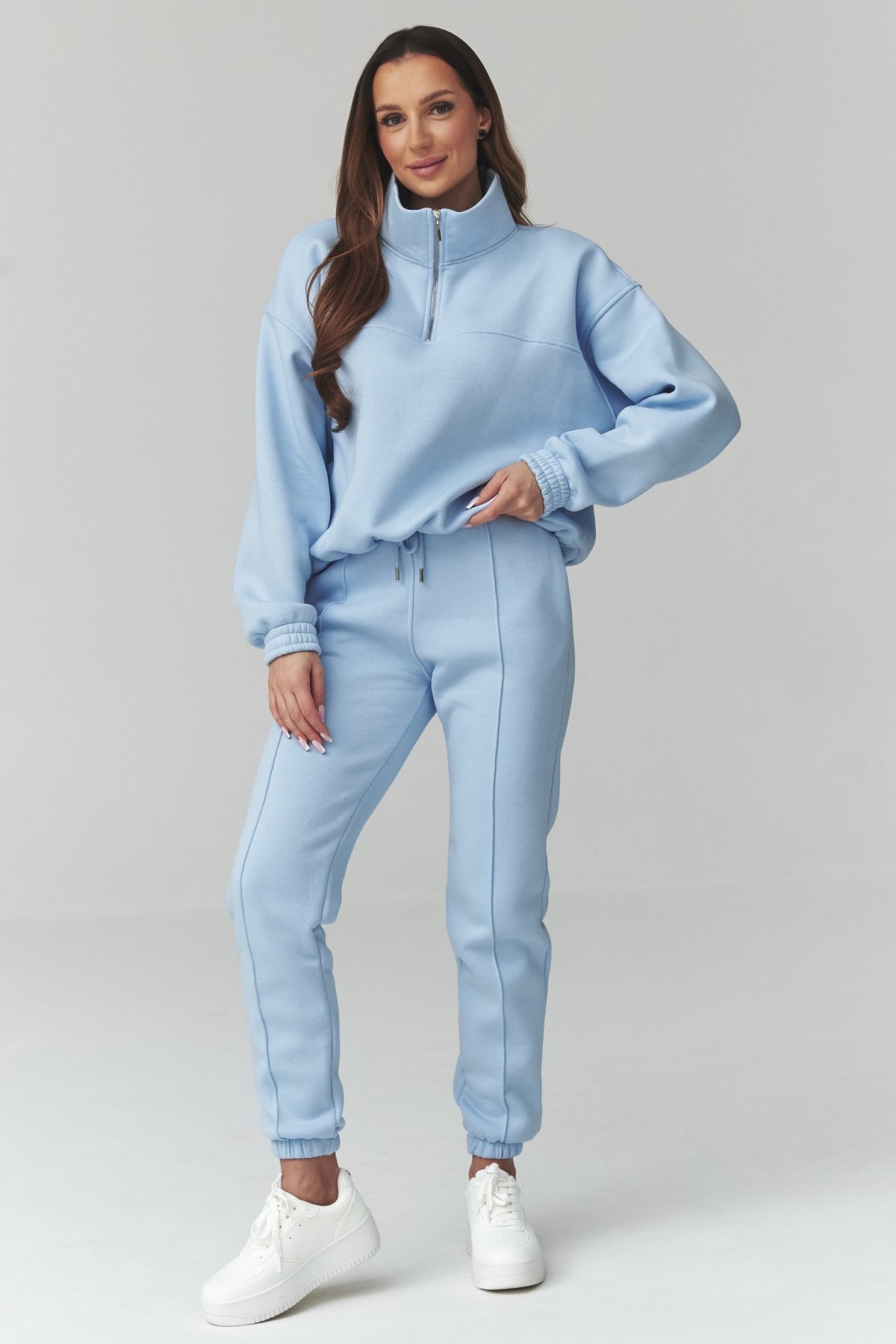 Dámská souprava světle modré barvy spojuje pohodlný střih a čistý, městský vzhled.