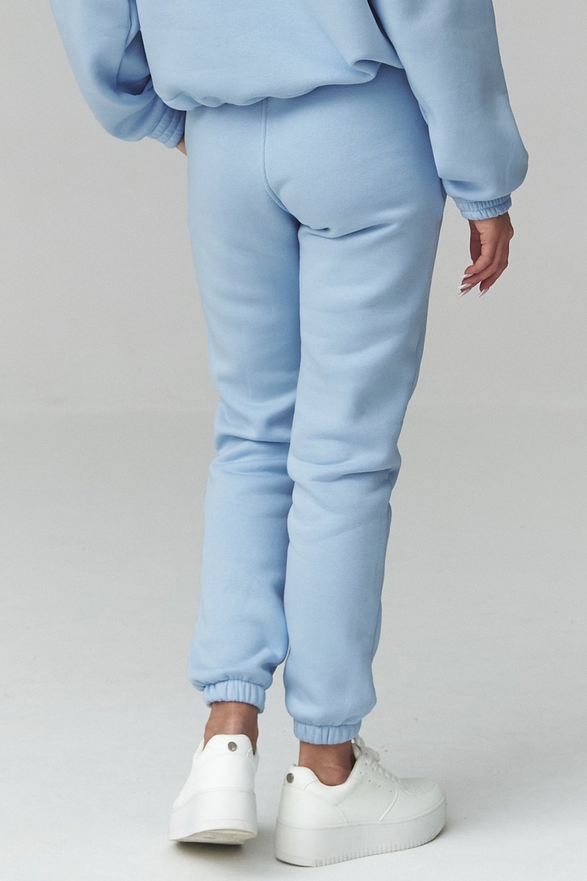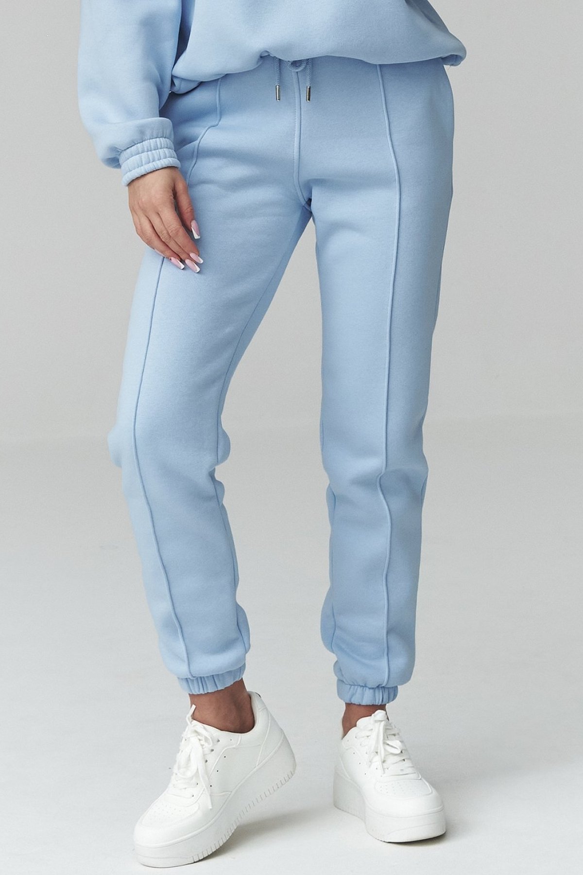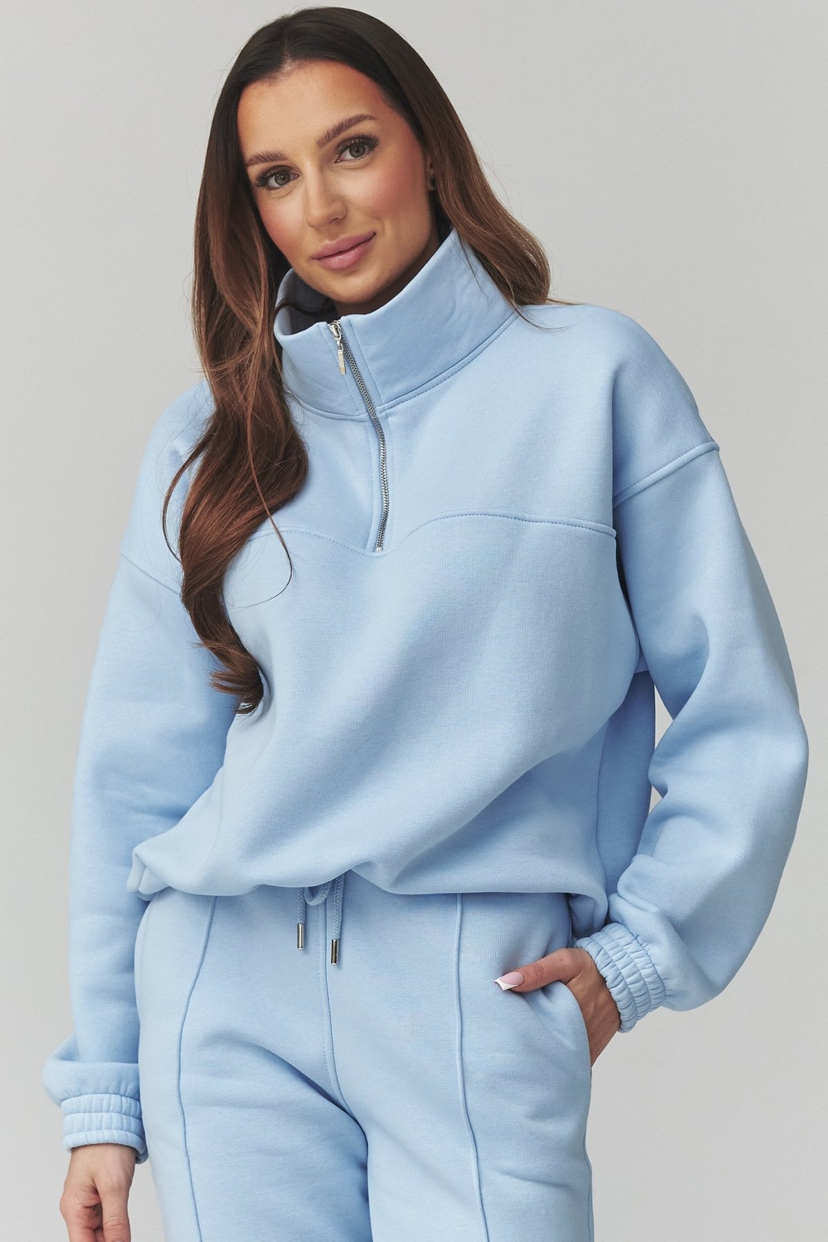 Dámská souprava světle modré barvy spojuje pohodlný střih a čistý, městský vzhled.