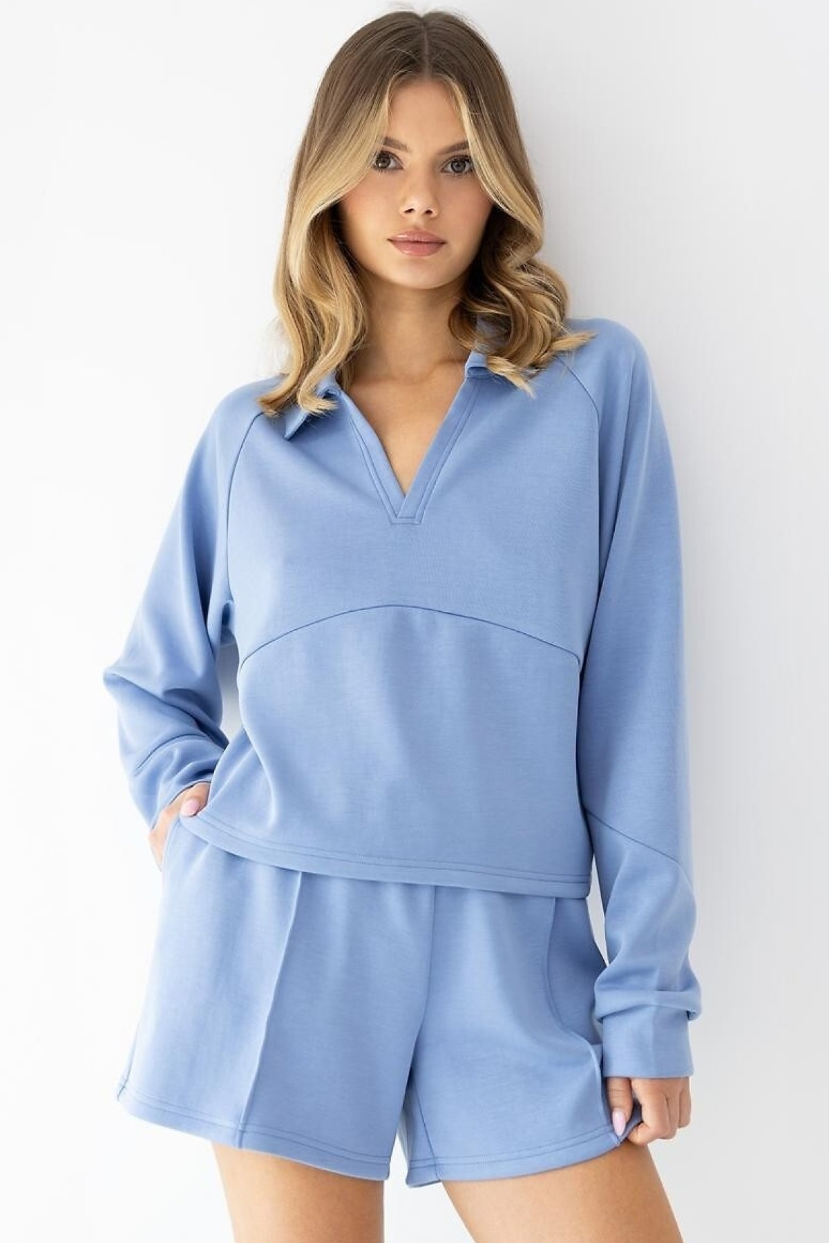 Komplet Blaire je pohodlný set v homewear stylu, který se hodí na odpočinek doma i jako lehčí pyžamo. Volnější horní díl s dlouhým rukávem a výstřihem do V působí uvolněně a dodává modelu nenucený, moderní vzhled.