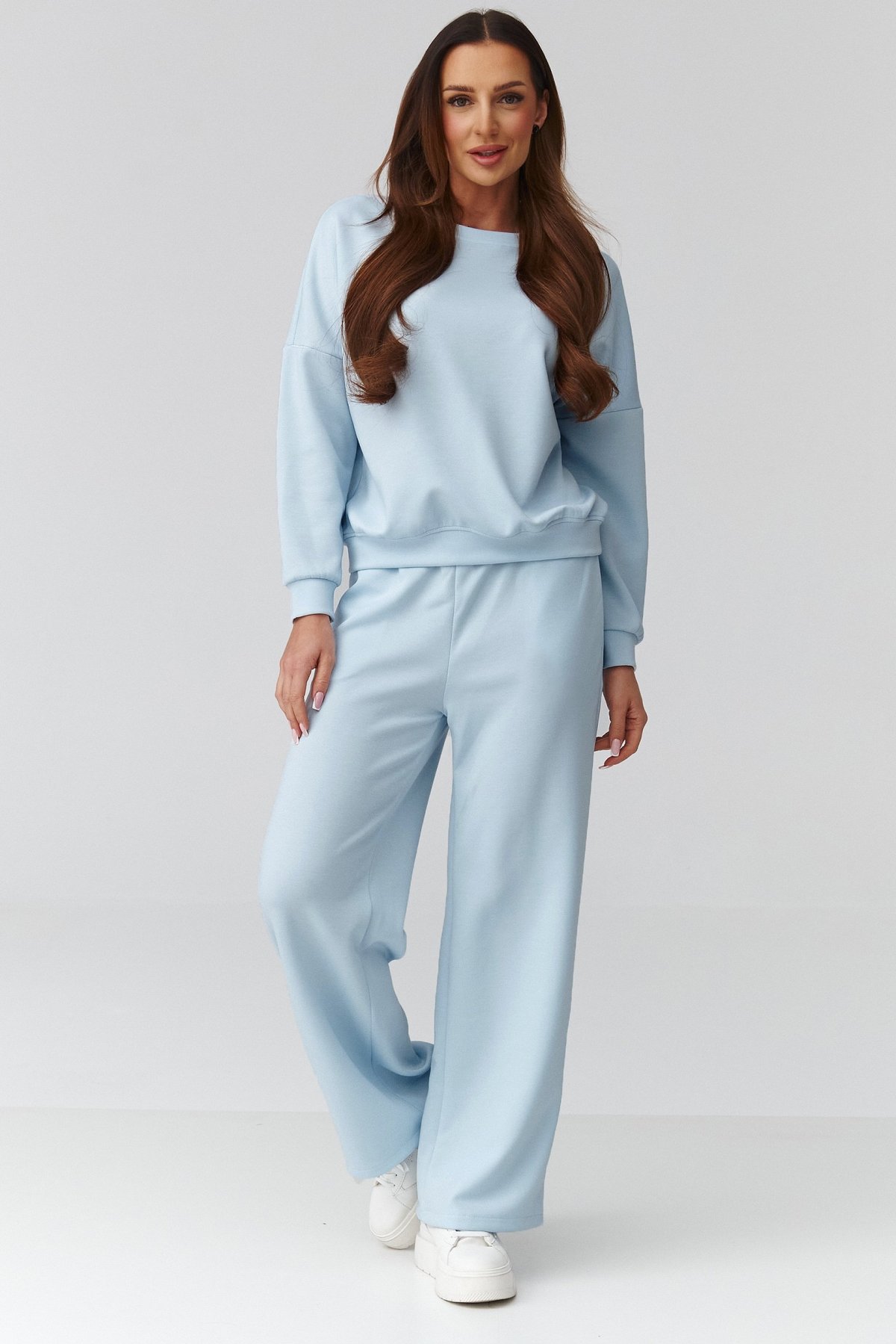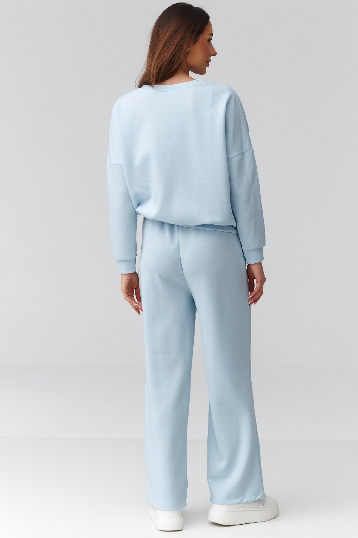 Volnější mikina s dlouhým rukávem zajišťuje komfort a přirozený pohyb, široké nohavice dodávají outfitu moderní siluetu a lehkost. Kalhoty mají pružný pas, který se přizpůsobí postavě a netlačí. Materiál je měkký na dotek, dobře splývá a působí upraveně i při celodenním nošení. Díky univerzálnímu střihu komplet vyhovuje různým typům postavy.