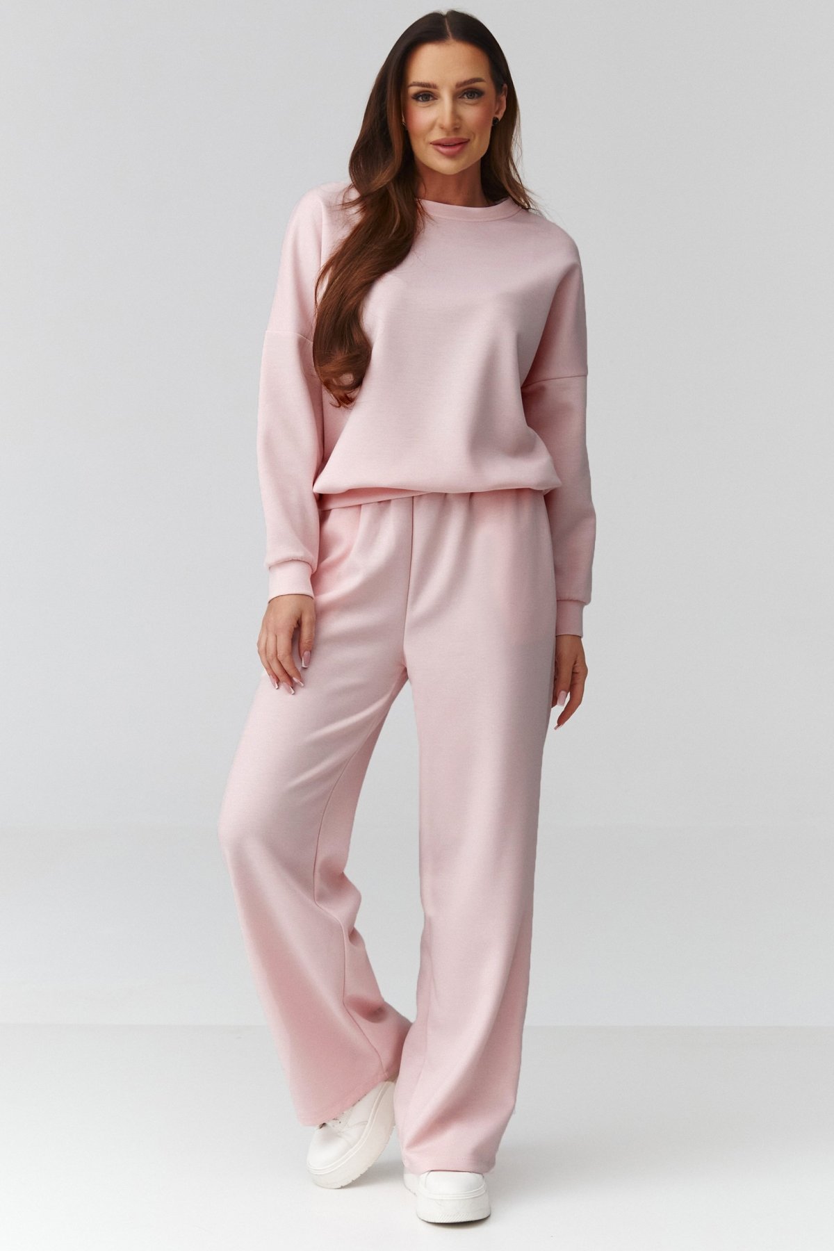 Volnější mikina s dlouhým rukávem zajišťuje komfort a přirozený pohyb, široké nohavice dodávají outfitu moderní siluetu a lehkost. Kalhoty mají pružný pas, který se přizpůsobí postavě a netlačí. Materiál je měkký na dotek, dobře splývá a působí upraveně i při celodenním nošení. Díky univerzálnímu střihu komplet vyhovuje různým typům postavy.