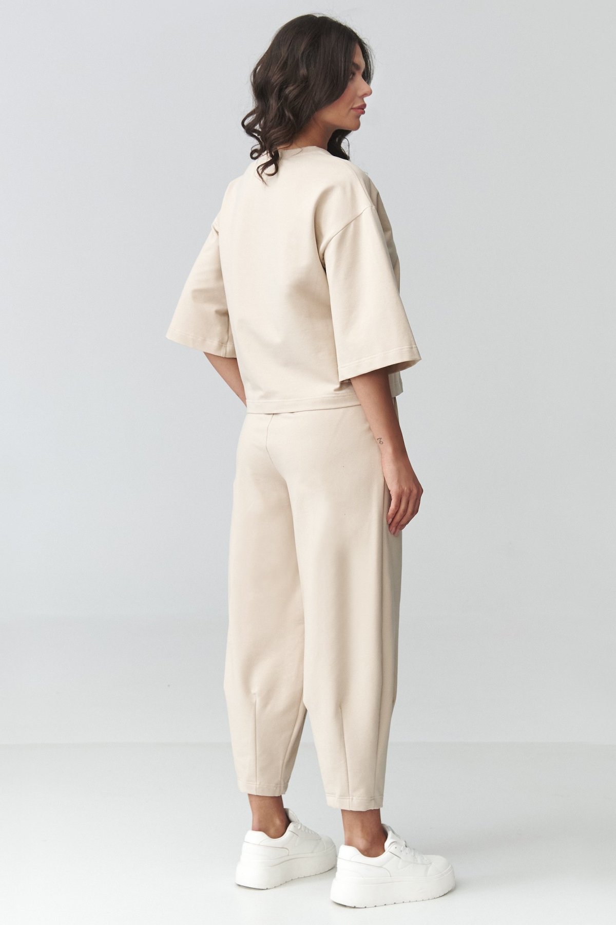 Oversize halenka s krátkým rukávem působí ležérně a nechává dost prostoru pro volný pohyb, zatímco balónové kalhoty dodávají siluetě moderní tvar. Elastický pas se dobře přizpůsobí postavě a kapsy zvyšují praktičnost při běžném nošení. Celek působí čistě a nadčasově, takže ho snadno sladíte se sneakersy i jednoduššími doplňky. Díky bavlně s příměsí elastanu je materiál příjemný na těle a pohodlný po celý den. Tento komplet se hodí do města, na cestování i klidnější dny, kdy chcete vypadat upraveně bez zbytečné snahy.
