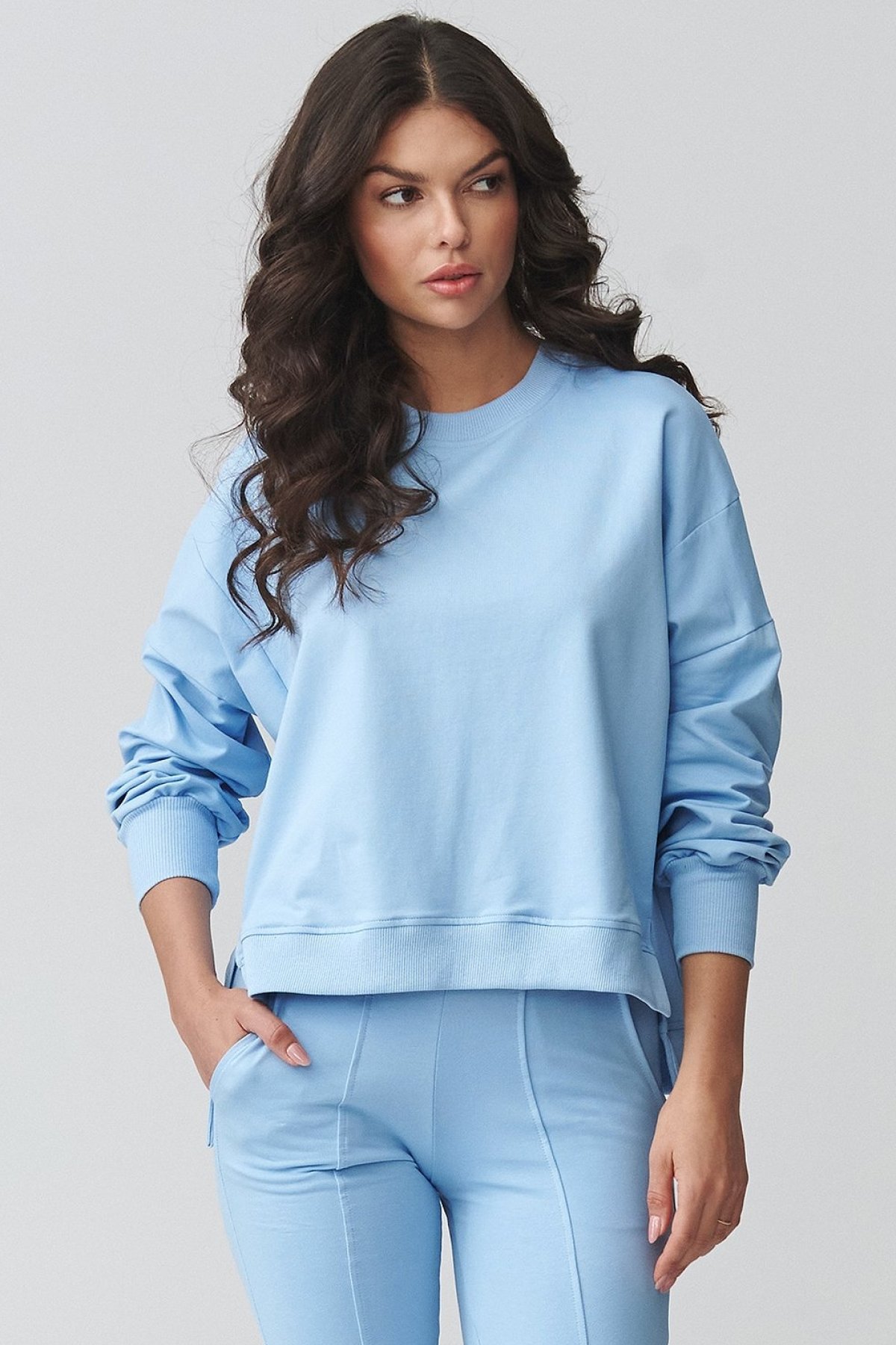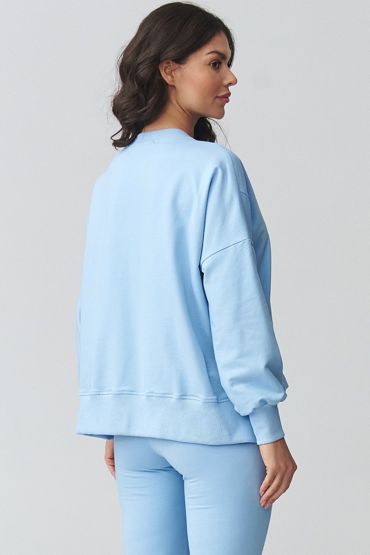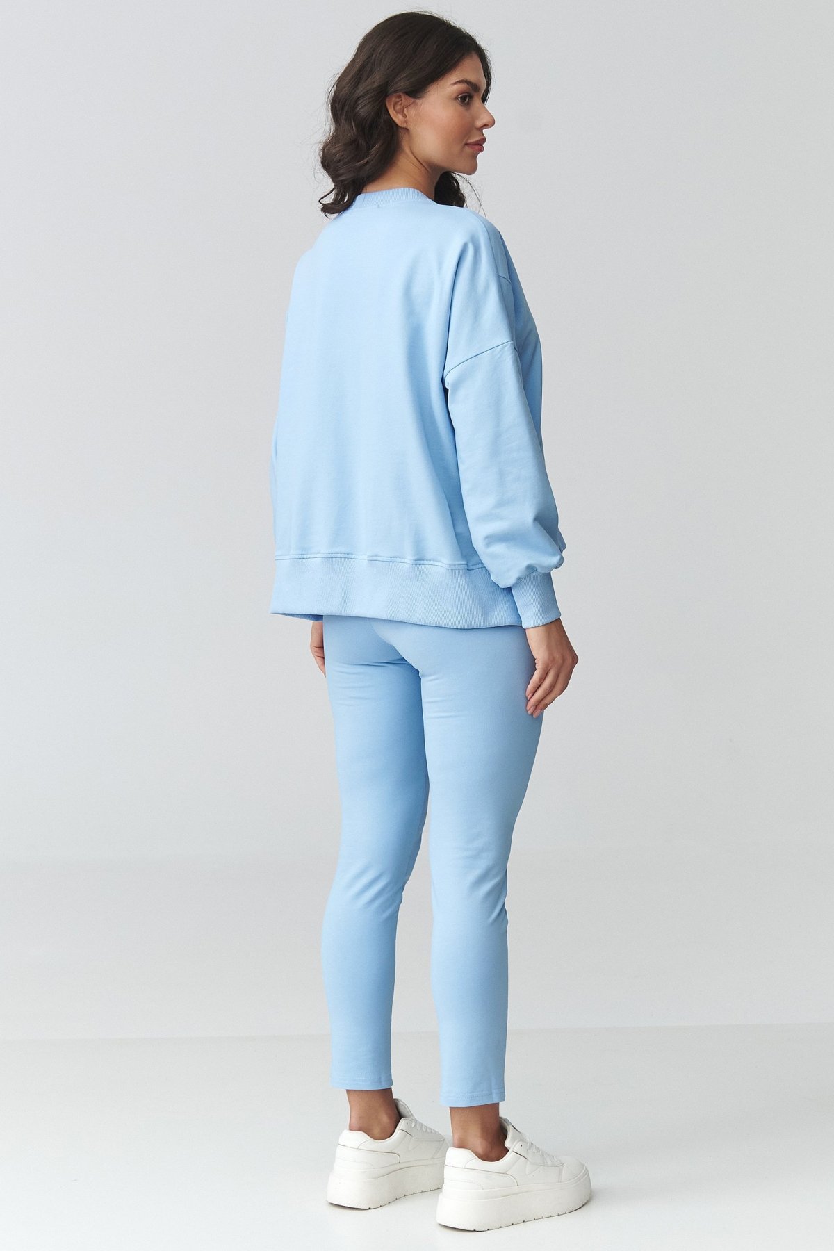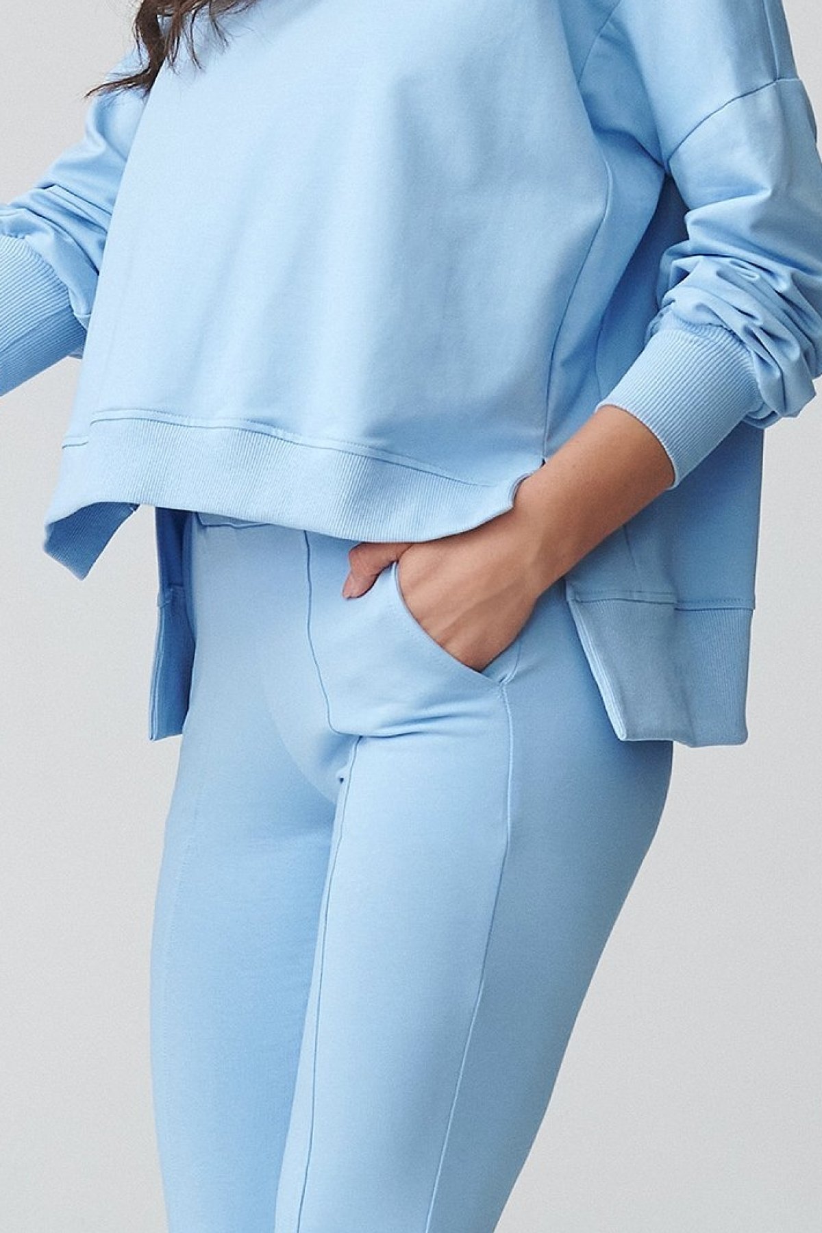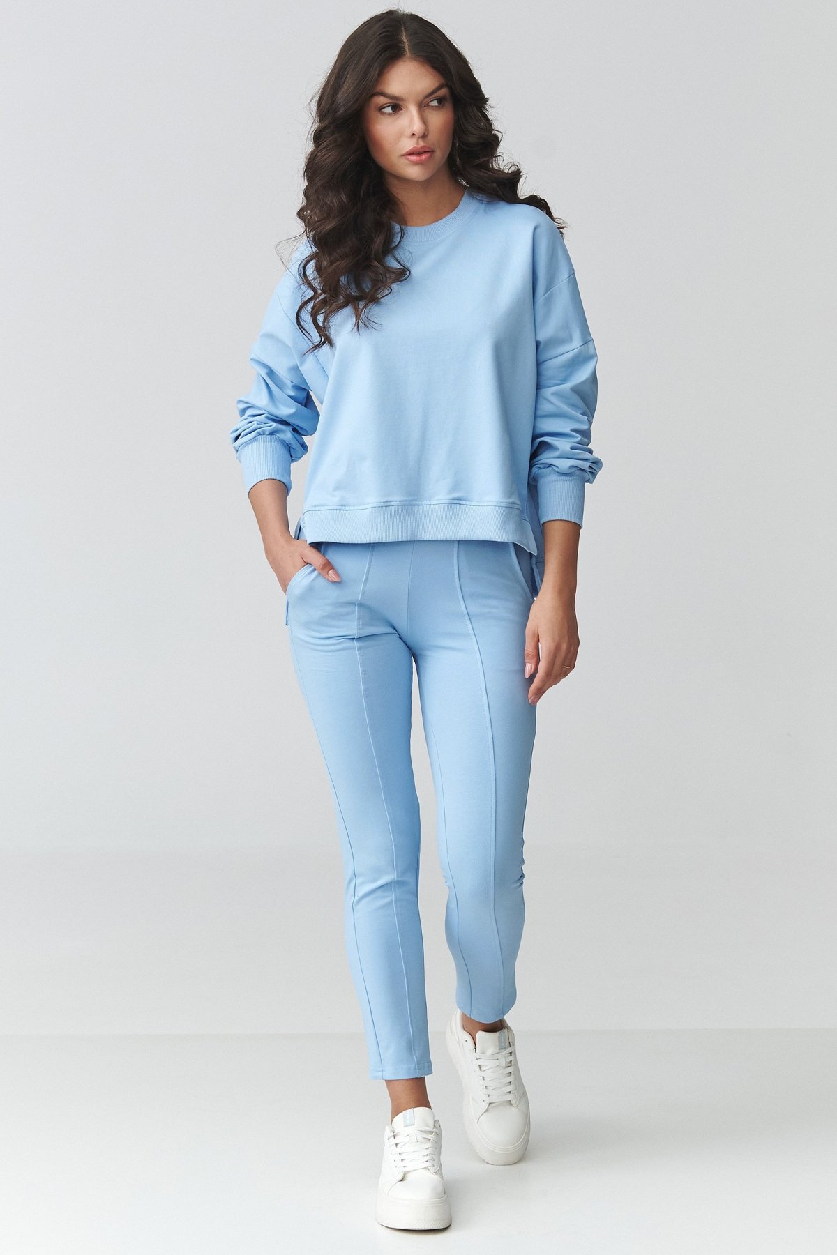 Tento teplákový komplet světle modré barvy spojuje uvolněný vršek a užší spodní díl, takže působí vyváženě a současně.