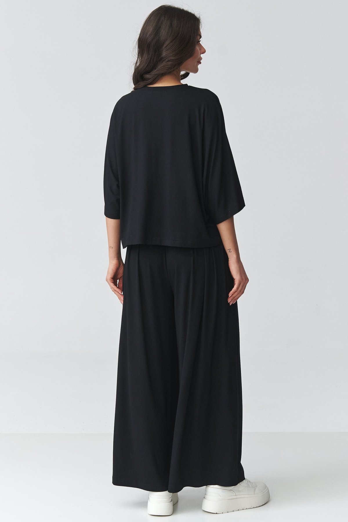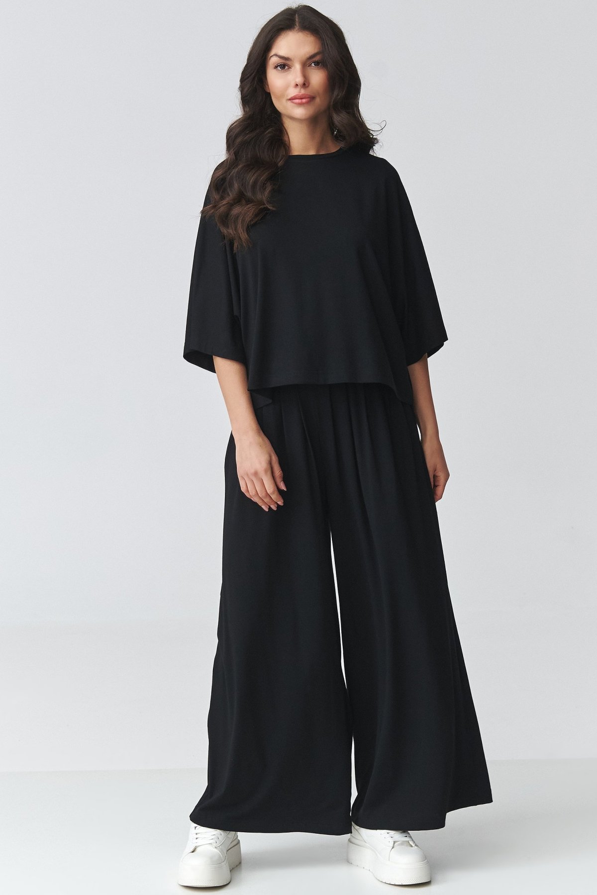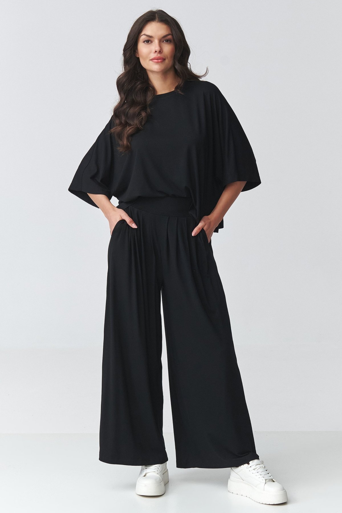 Dámský komplet černé barvy se širokými kalhotami a oversize halenkou působí uvolněně, ale zároveň velmi upraveně. Volnější horní díl s širokými rukávy dodává modelu lehkost a nechává vyniknout splývavou linii celého outfitu. Kalhoty s vysokým pasem opticky prodlužují nohy a díky pružnému pasu se pohodlně přizpůsobí postavě. Široké nohavice podtrhují elegantní, současný výraz a dělají z kompletu kousek, který využijete do práce, na rodinné setkání i na běžný den ve městě. Jednotlivé díly můžete nosit i zvlášť a snadno je kombinovat s dalšími základy šatníku.