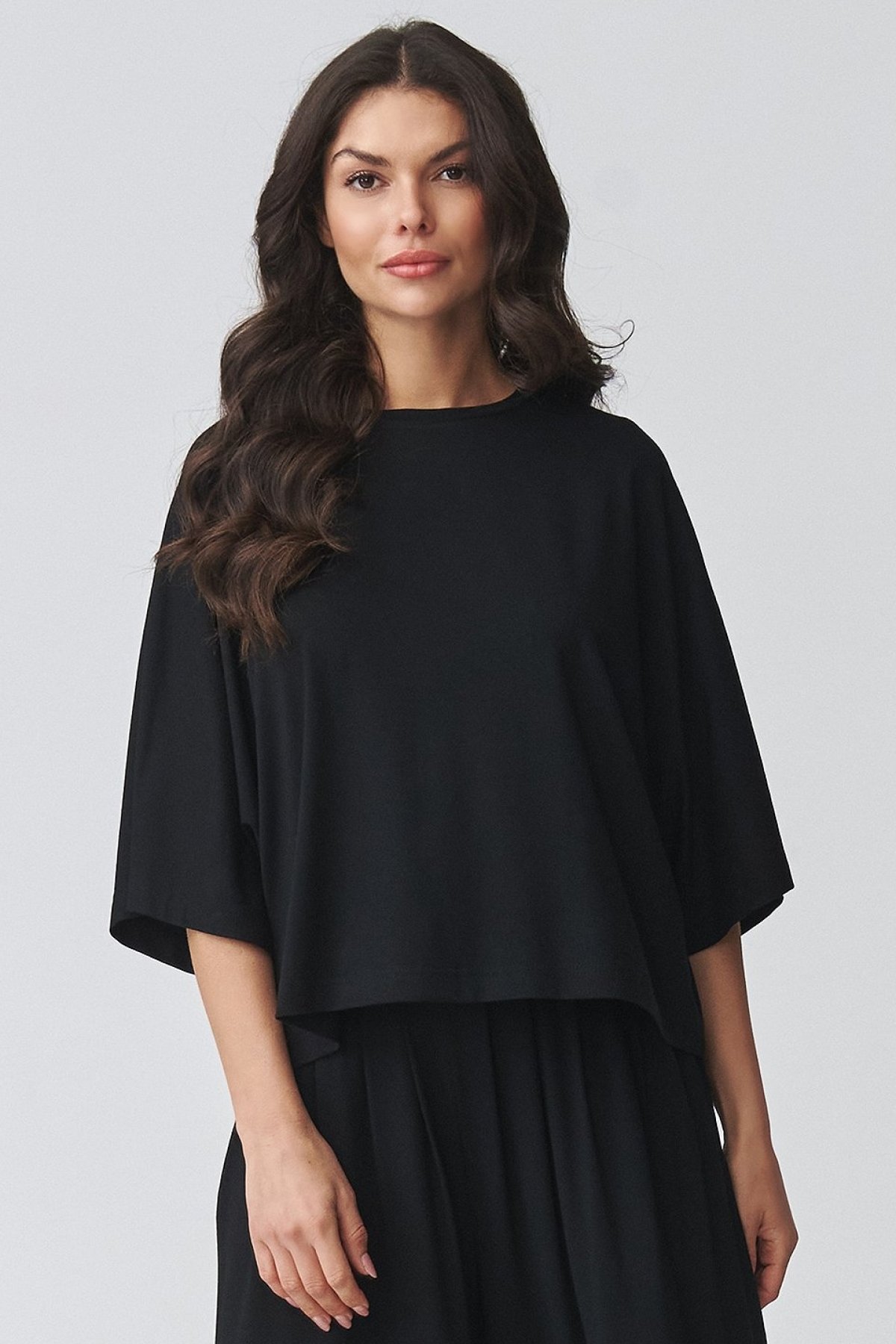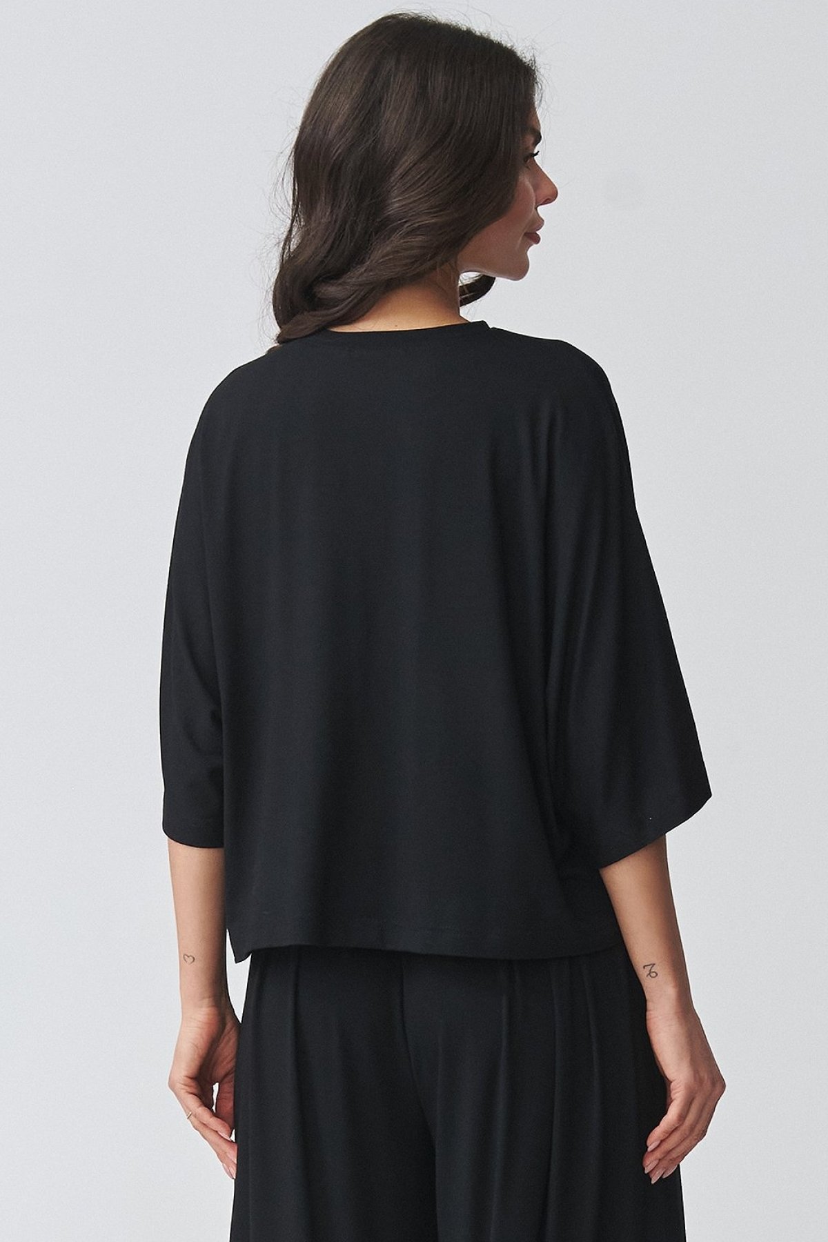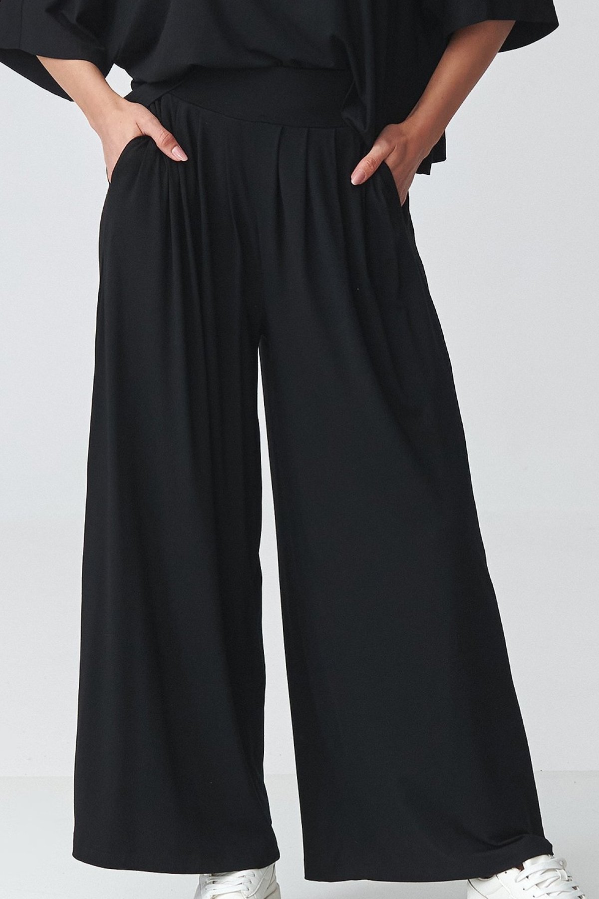 Dámský komplet černé barvy se širokými kalhotami a oversize halenkou působí uvolněně, ale zároveň velmi upraveně. Volnější horní díl s širokými rukávy dodává modelu lehkost a nechává vyniknout splývavou linii celého outfitu. Kalhoty s vysokým pasem opticky prodlužují nohy a díky pružnému pasu se pohodlně přizpůsobí postavě. Široké nohavice podtrhují elegantní, současný výraz a dělají z kompletu kousek, který využijete do práce, na rodinné setkání i na běžný den ve městě. Jednotlivé díly můžete nosit i zvlášť a snadno je kombinovat s dalšími základy šatníku.