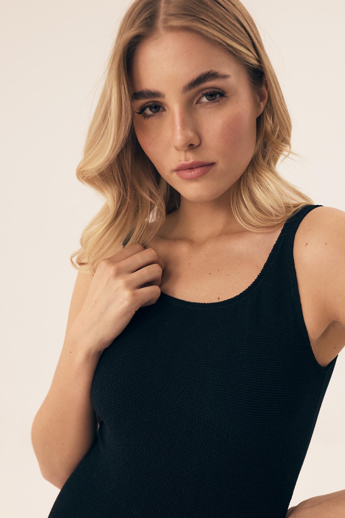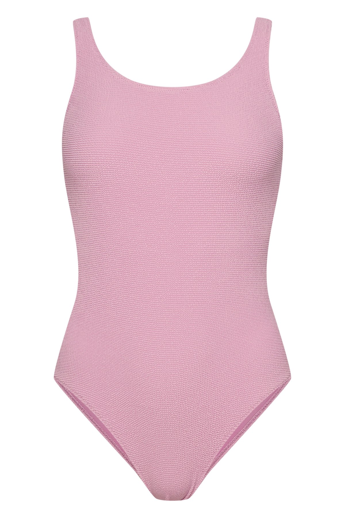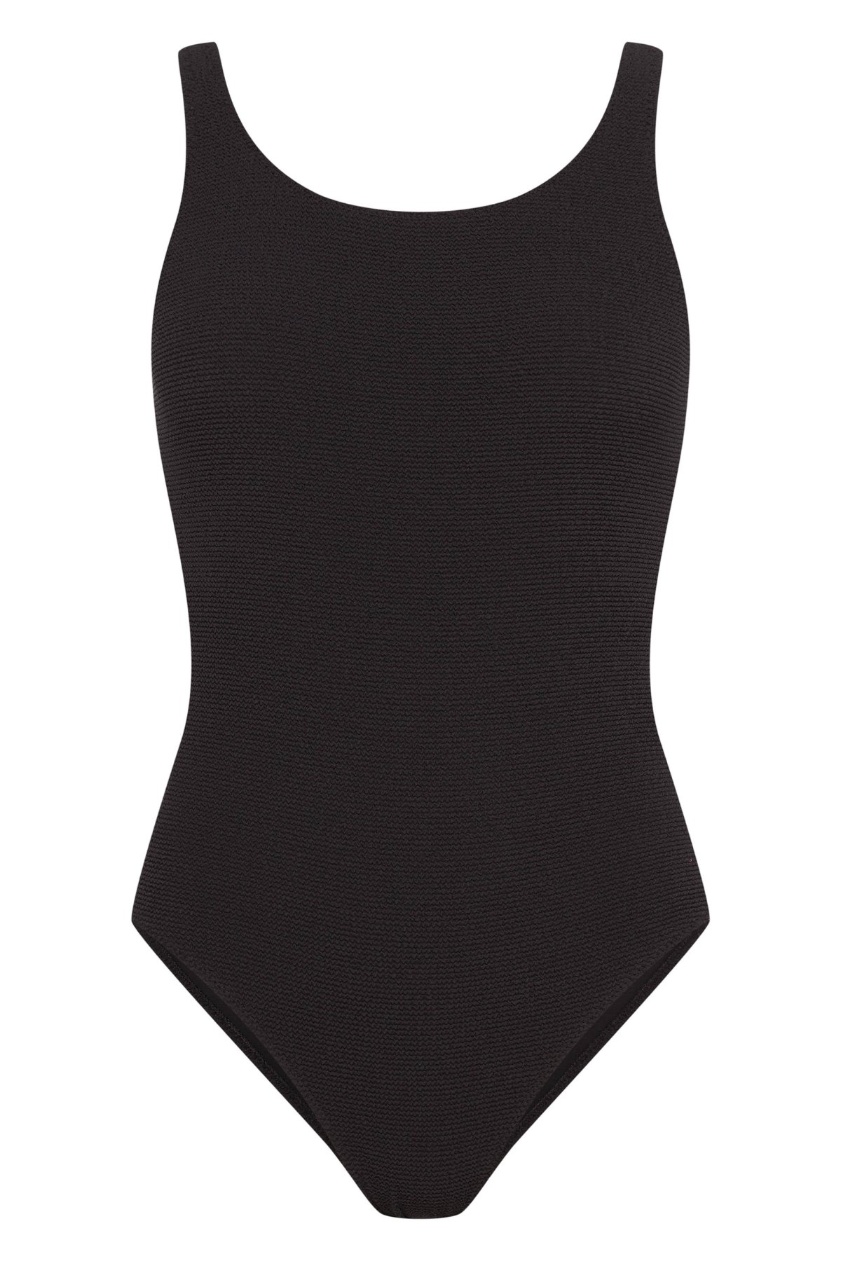 Jednodílné plavky Sunnyday zaujmou strukturovaným materiálem a čistým ženským střihem. Hladká linie výstřihu a širší ramínka vytvářejí vyvážený vzhled, který hezky podtrhne postavu. Středně vykrojené boky a hluboce vykrojená záda dodávají modelu jemně smyslný charakter. Výrazná textura materiálu s 3D efektem oživuje minimalistické provedení a dává plavkám moderní vzhled.