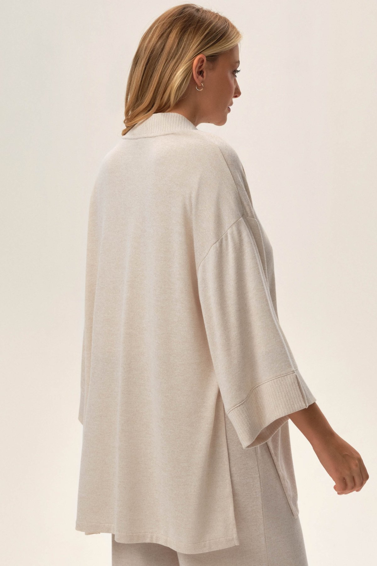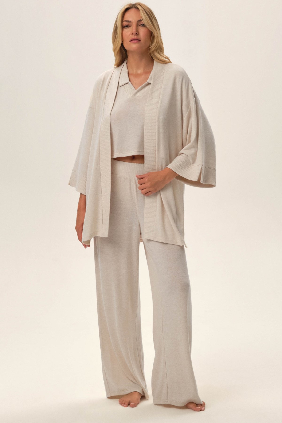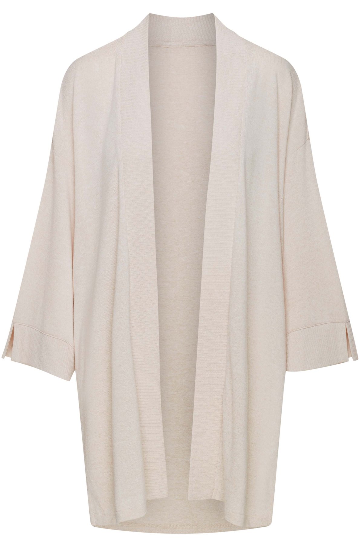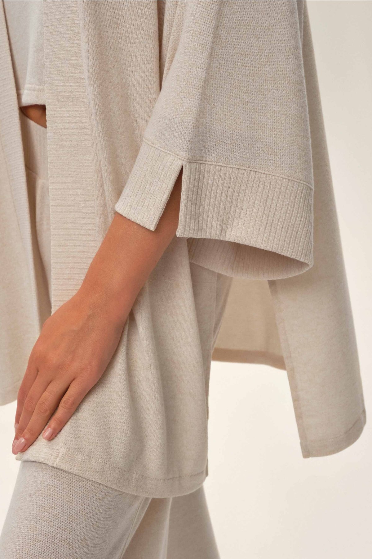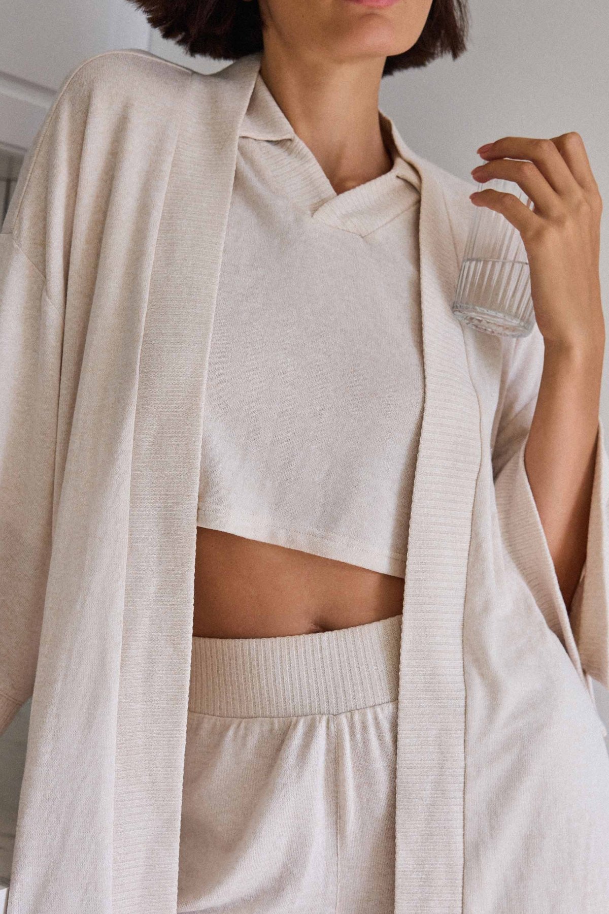 Kardigán Jen je praktický a pohodlný kúsok na nosenie doma aj na oddych počas cestovania. Ľahký úplet je mäkký, príjemný na dotyk a pohodlne sa nosí. Otvorený strih a rukávy pod lakte dodávajú modelu vzdušný, uvoľnený vzhľad, ktorý sa ľahko kombinuje s ďalším domácim oblečením.