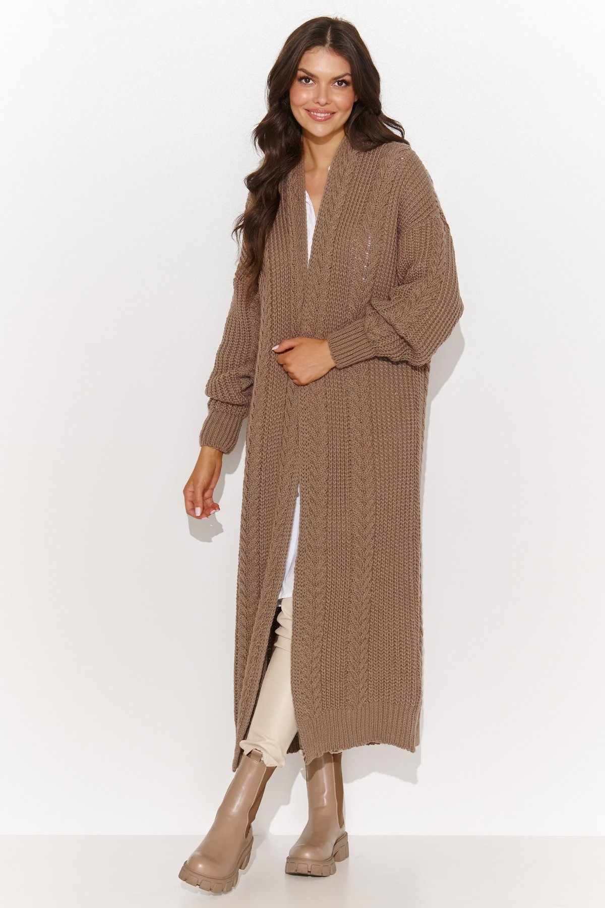 Tento dlhý dámsky sveter typu kardigan je absolútny must have pre chladnejšie dni. Jeho otvorený strih a široké rukávy zakončené pružnými manžetami zaisťujú pohodlie a voľnosť pohybu. Jemný vrkôčikový vzor mu dodáva šarm a jedinečnosť, vďaka čomu je ideálnou voľbou pre ženy, ktoré ocenia originálne a elegantné detaily. Bezpochyby sa stane vaším obľúbeným kúskom šatníka pre chladnejšie dni. Sveter je k dispozícii v niekoľkých atraktívnych farbách. Skombinujte ho s džínsami a čižmami a vytvorte si ležérny, ale štýlový look na každý deň. Môžete ho tiež skombinovať s elegantnými nohavicami a lodičkami na formálnejšie príležitosti. Nech už ho budete nosiť akokoľvek, určite si ho zamilujete!