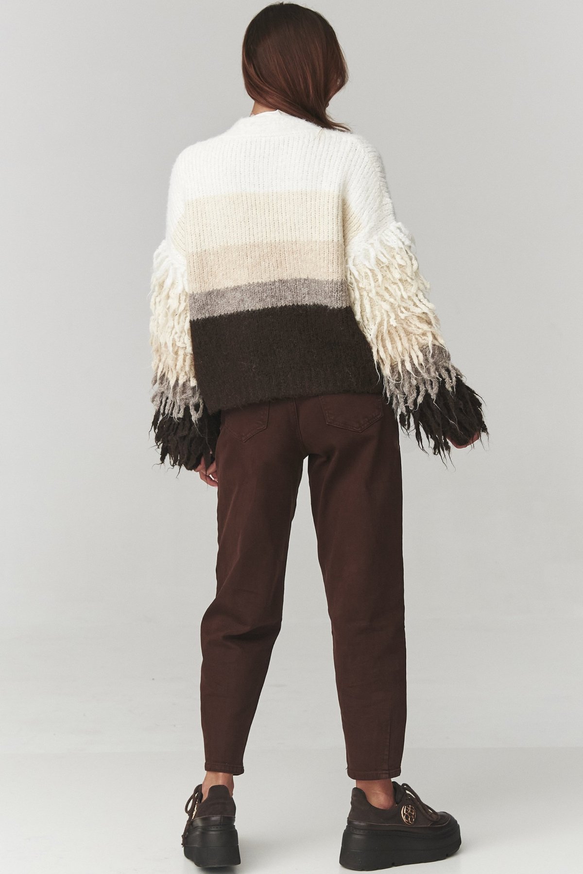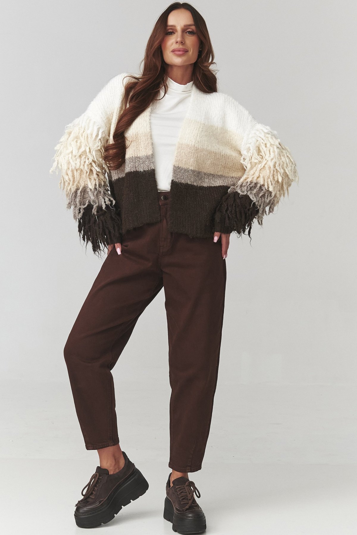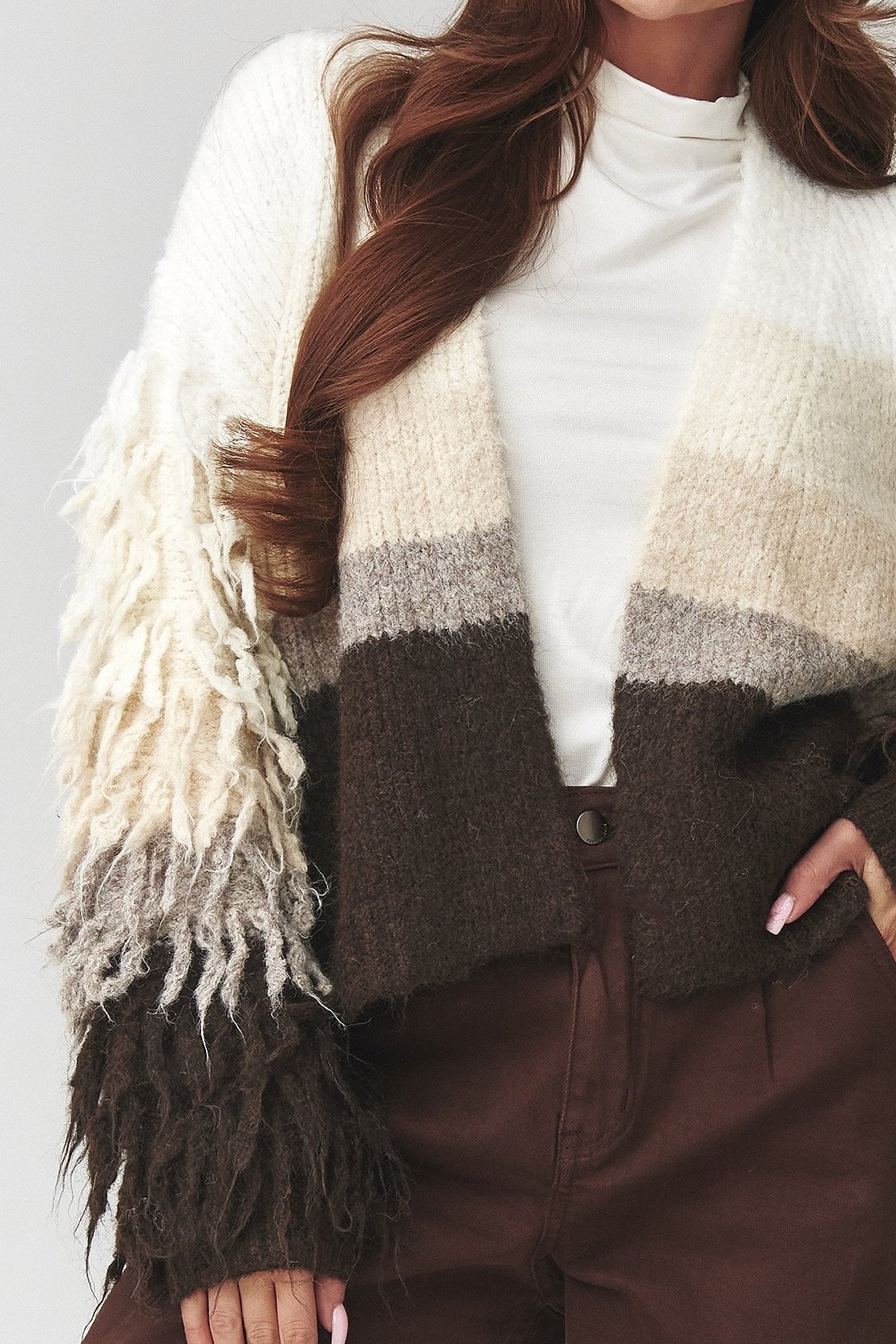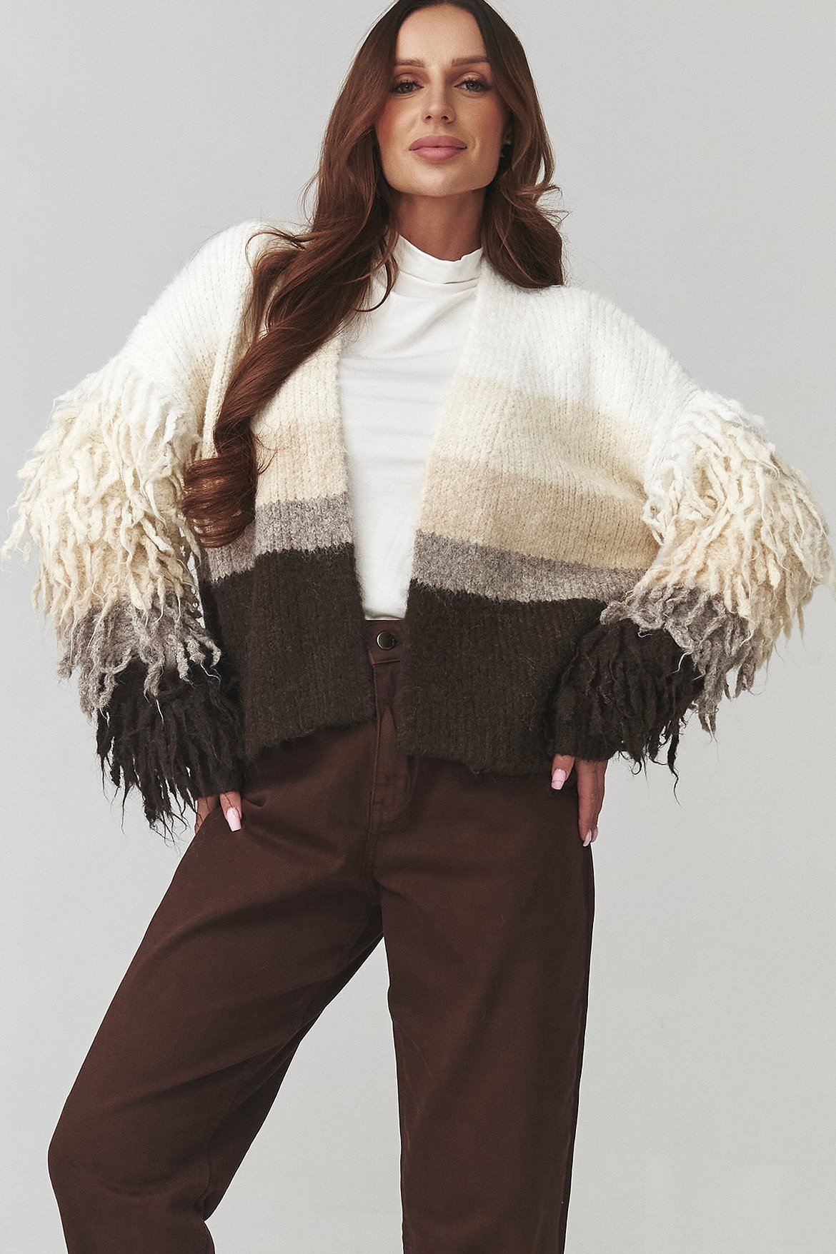 Štýlový dámsky kardigan so strapcami v béžovom odtieni. Dodá každému outfitu ležérnu eleganciu a originálny charakter. Vďaka voľnejšiemu strihu sa pohodlne nosí a krásne padne na každú postavu. Mäkký úplet príjemne hreje a zaistí komfort počas chladnejších dní, zatiaľ čo ozdobné strapce dodávajú modelu módny, hravý akcent.