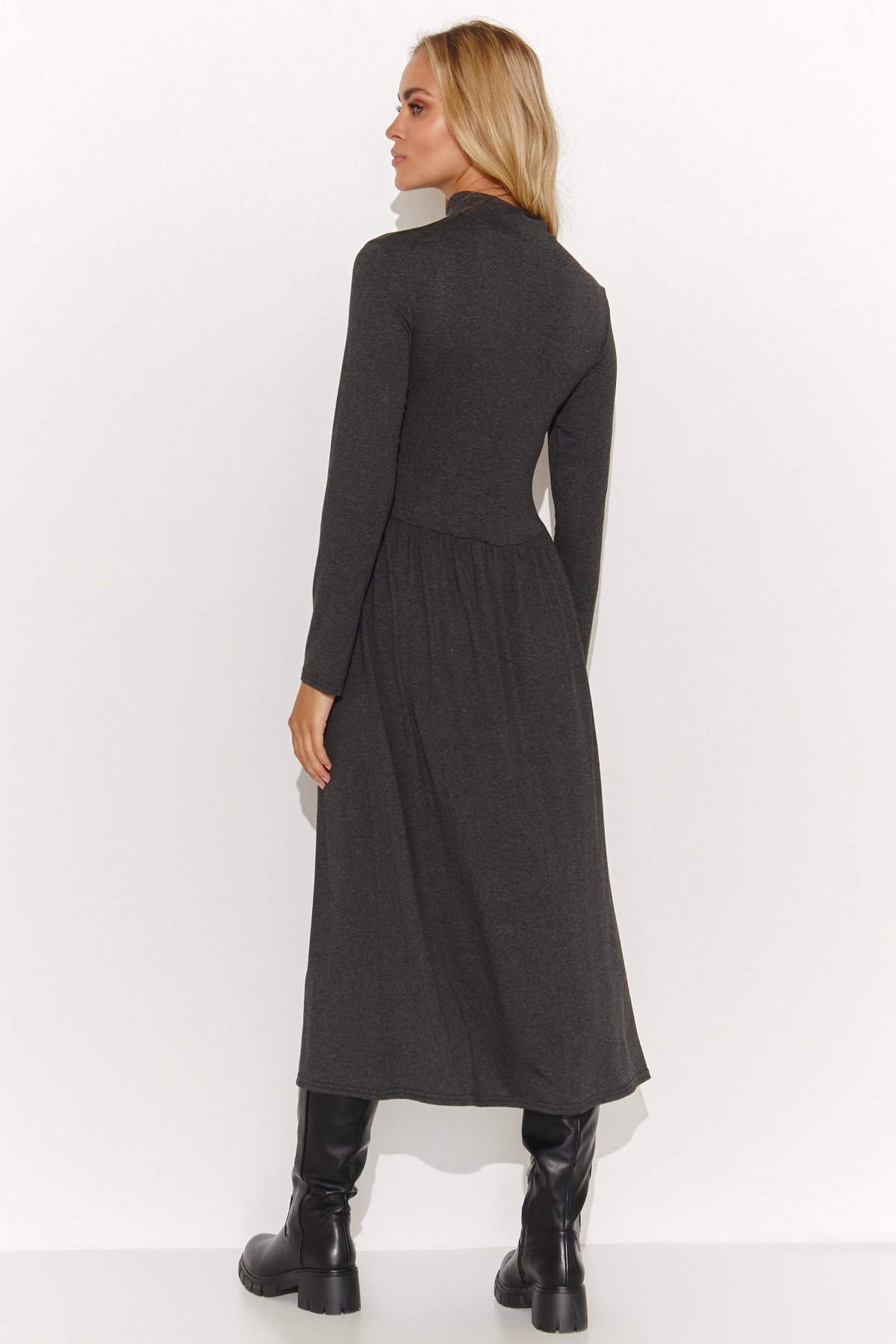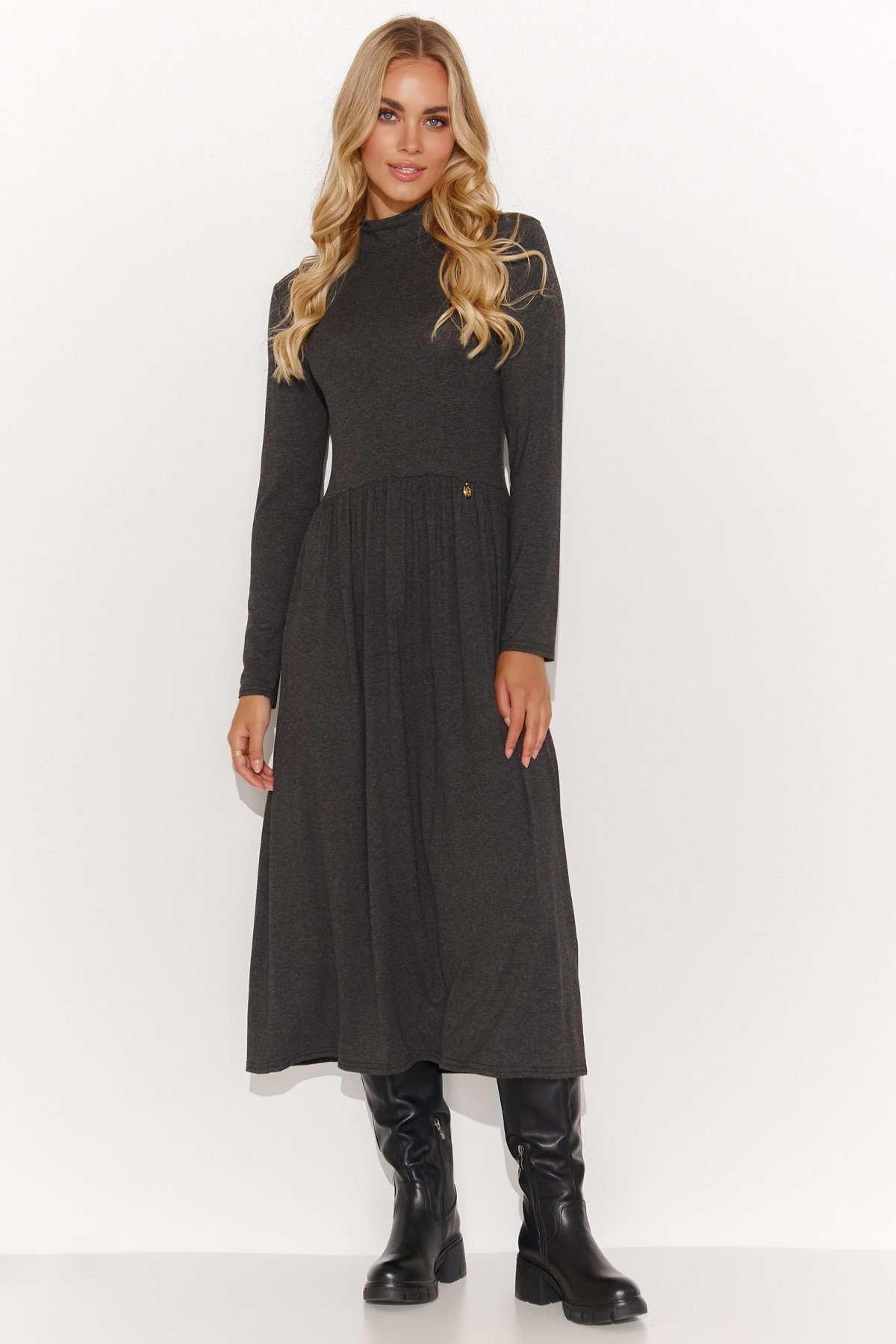 Šaty ku kolenám sú kombináciou pohodlia a štýlu, ktorá sa vám určite bude páčiť. Dlhé rukávy a rolák zaisťujú teplo a pohodlie v chladnejších dňoch a zároveň dodávajú šatám elegantný nádych. Šaty sú v hornej časti priliehavé, čo zdôrazňuje postavu, a od pása sú voľnejšie, čo zase zaisťuje voľnosť pohybu. Kombinácia týchto šiat s čižmami vytvára módny a pohodlný look, ktorý sa perfektne hodí ako do práce, tak na posedenie s priateľmi. Šaty sú v klasických farbách. Skombinujte ich s topánkami a padnúcim kabátom a vytvorte jedinečný outfit na jeseň aj zimu. Môžete ich tiež skombinovať s teniskami a páperovou bundou pre viac ležérny výzor.