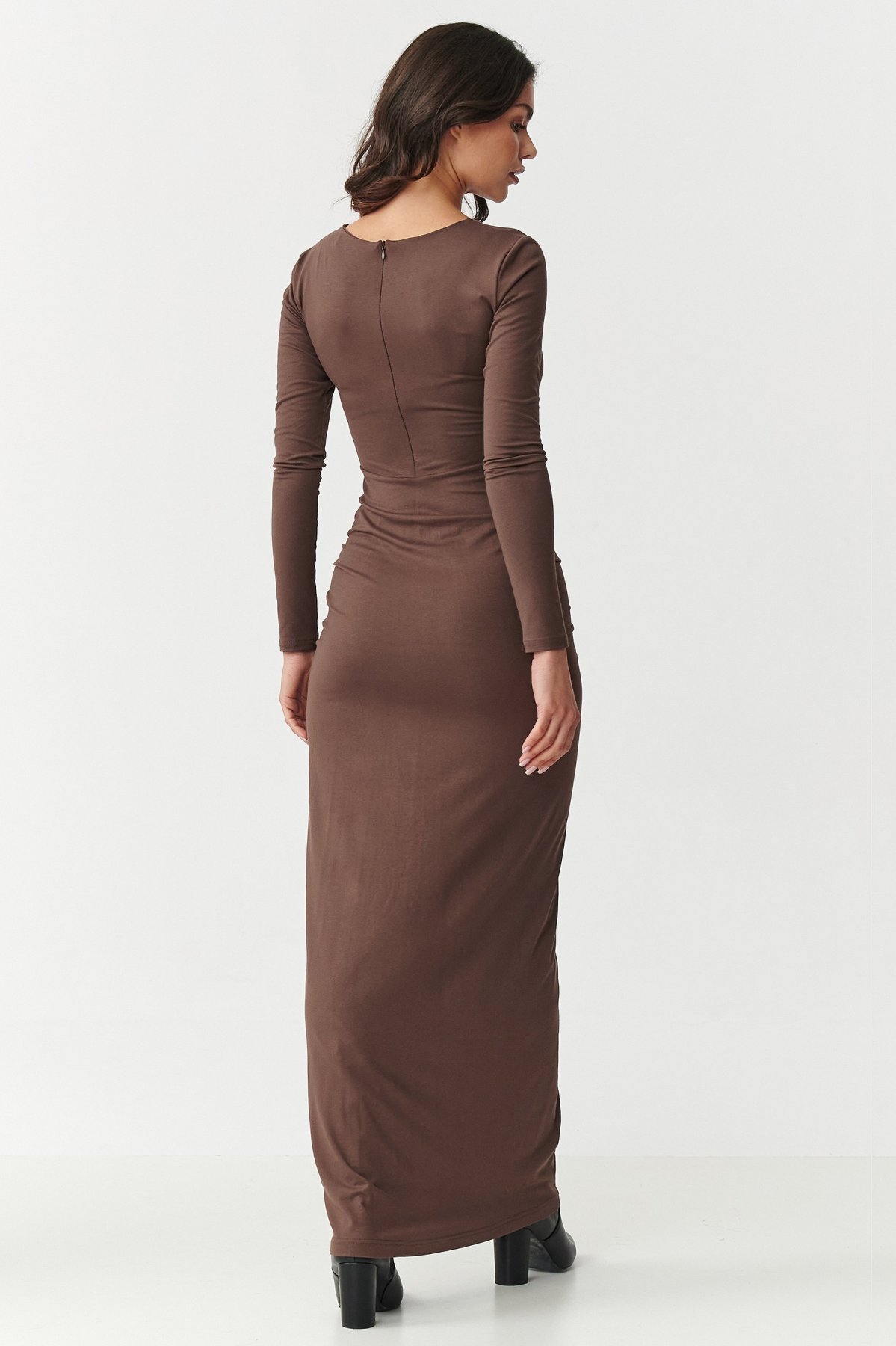 Maxi šaty ako esencia ženskosti a elegancie, vytvorené pre ženy, ktoré rady zdôrazňujú svoje prednosti a chcú sa cítiť výnimočne v každej situácii. Sú vyrobené z pružného materiálu príjemného na dotyk, perfektne sa prispôsobia postave a zaistia nielen pohodlie, ale aj dokonalý vzhľad. Najväčšou prednosťou týchto šiat je efektné riasenie v páse, ktoré opticky zoštíhľuje postavu, zdôrazňuje ženské krivky a zároveň maskuje drobné nedokonalosti. Vďaka tomu sa v nich každá žena bude cítiť sebaisto a atraktívne. Maxi dĺžka dodáva eleganciu a vďaka nej vyzerá celok veľmi štýlovo a šik. Univerzálny strih umožňuje ľahké zladenie s doplnkami - šaty vyzerajú skvele ako v kombinácii s klasickými lodičkami, tak s modernými topánkami. Môžete ich skombinovať s jemnými šperkami na dosiahnutie subtílneho efektu alebo s výraznejšími doplnkami, ak chcete vytvoriť výraznejší večerný look. Hodia sa na rodinné oslavy alebo večierky, kedy chcete vyzerať výnimočne a cítiť sa sebaisto. Elegantné maxi šaty s riasením sú synonymom ženskosti a nadčasovej elegancie. Pokiaľ hľadáte model, ktorý podčiarkne vašu postavu, dodá vám sebavedomie a bude vhodný pre mnoho príležitostí, je práve tento model ideálnou voľbou.