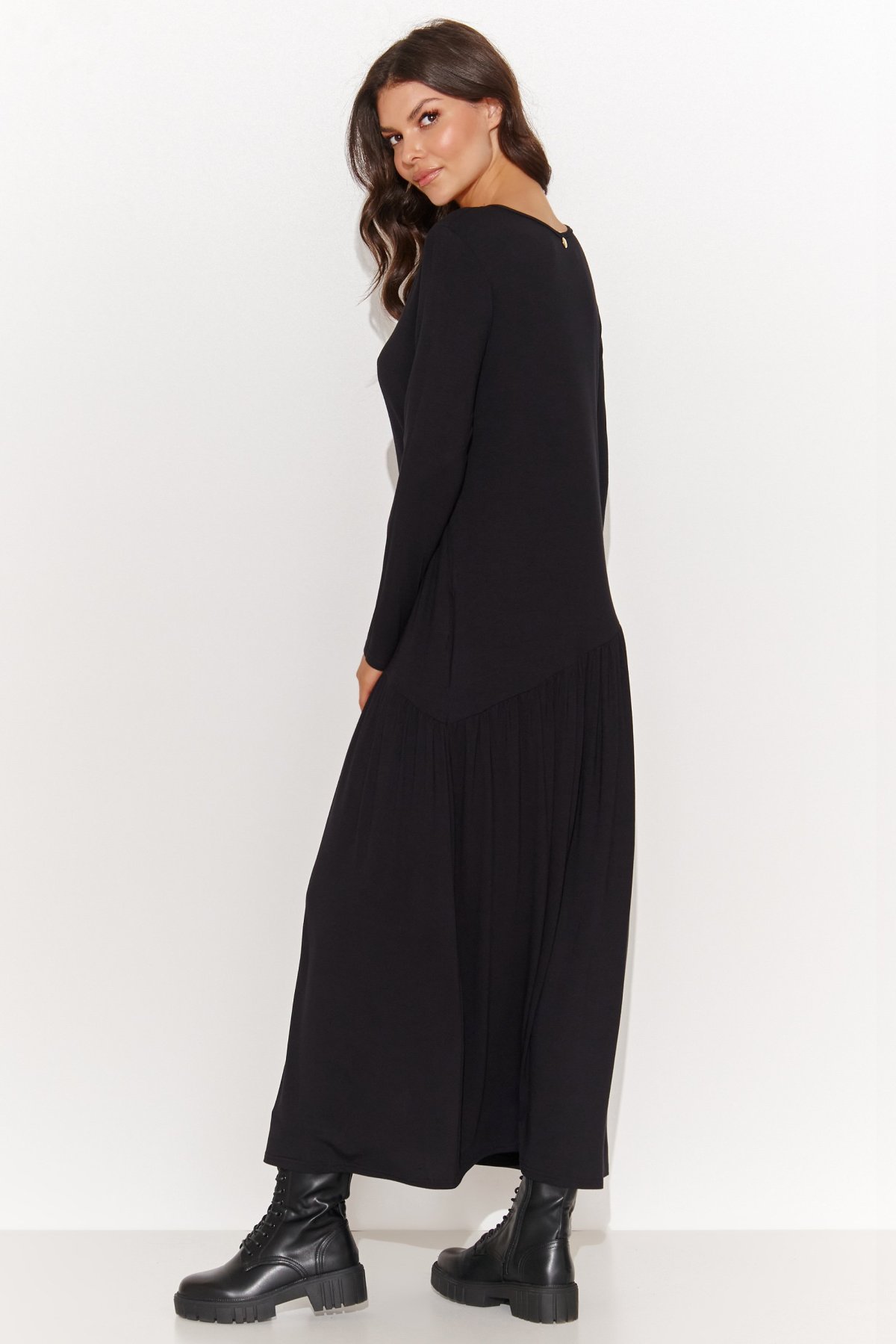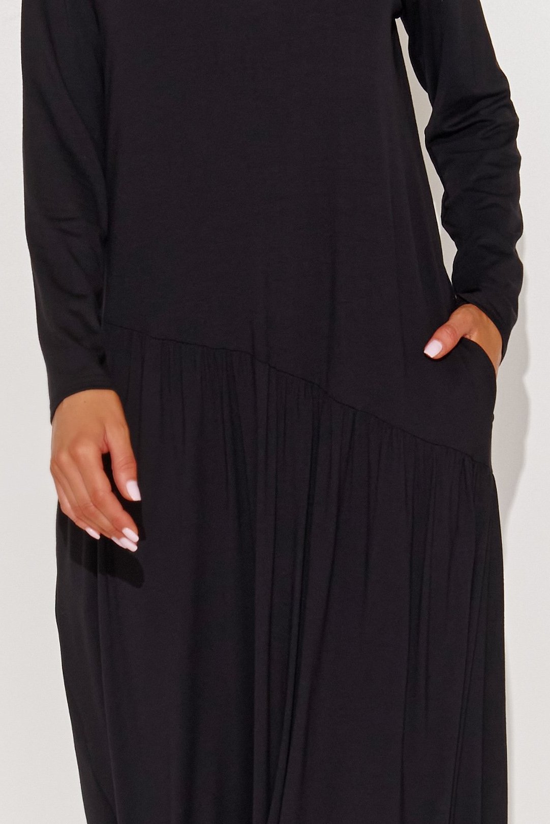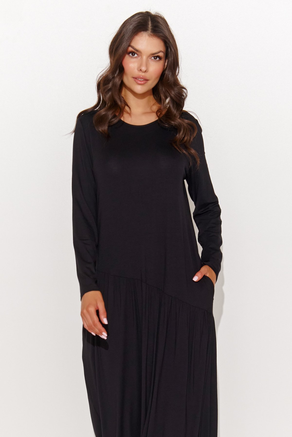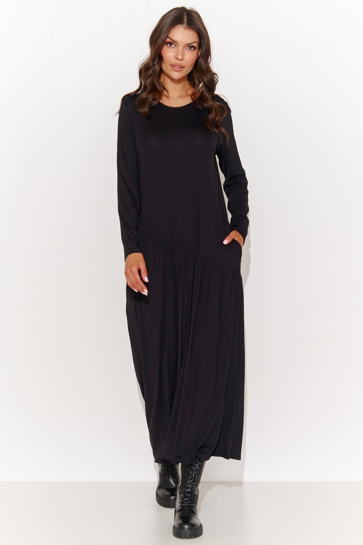 Maxi šaty sú vyrobené z priedušného viskózového úpletu. Majú okrúhly výstrih a na zadnej strane je všitý ozdobný pliešok. Po stranách sú praktické vrecká. Šaty majú asymetrické prešitie umiestnené mierne pod pásom. Dlhé rukávy zaisťujú voľnosť pohybu. Skvelá voľba pre efektnú štylizáciu do práce alebo na stretnutie s priateľmi. Najmä v kombinácii s vlneným kabátom.