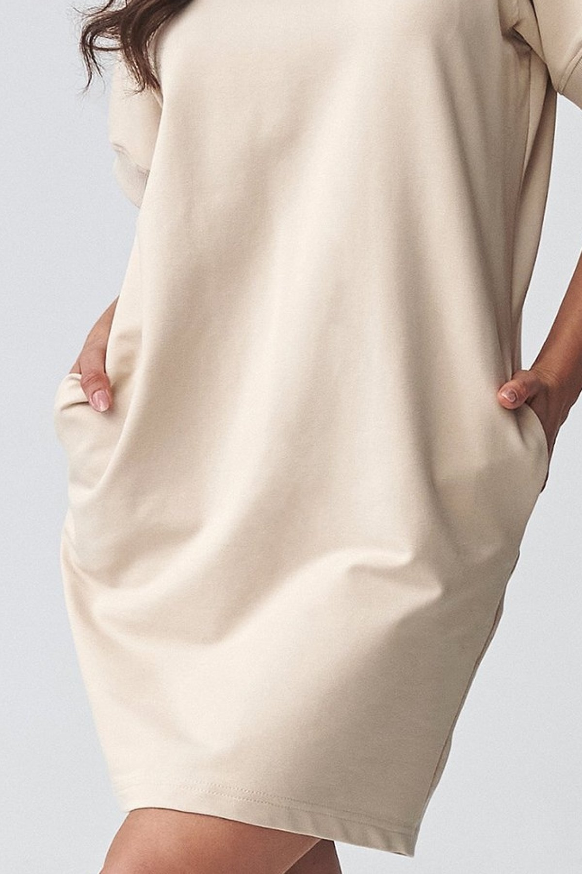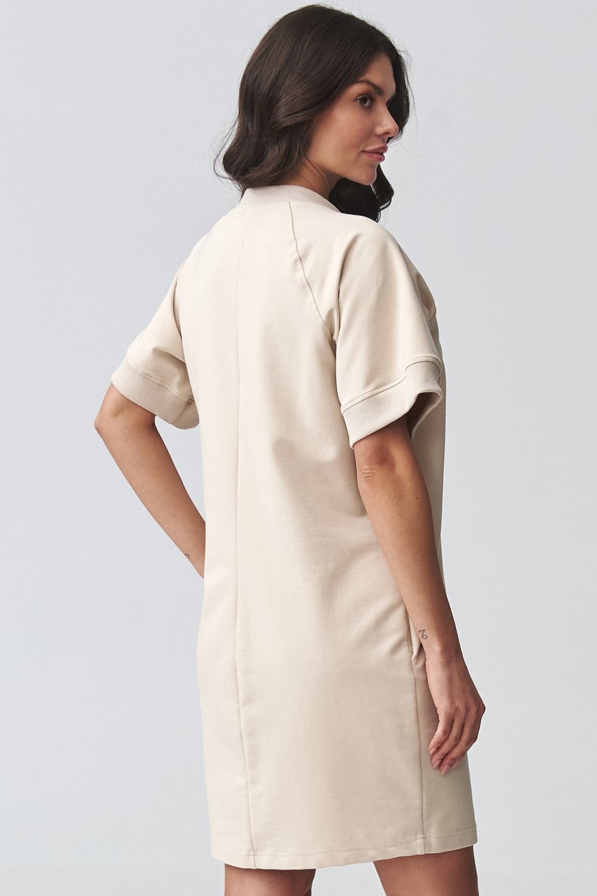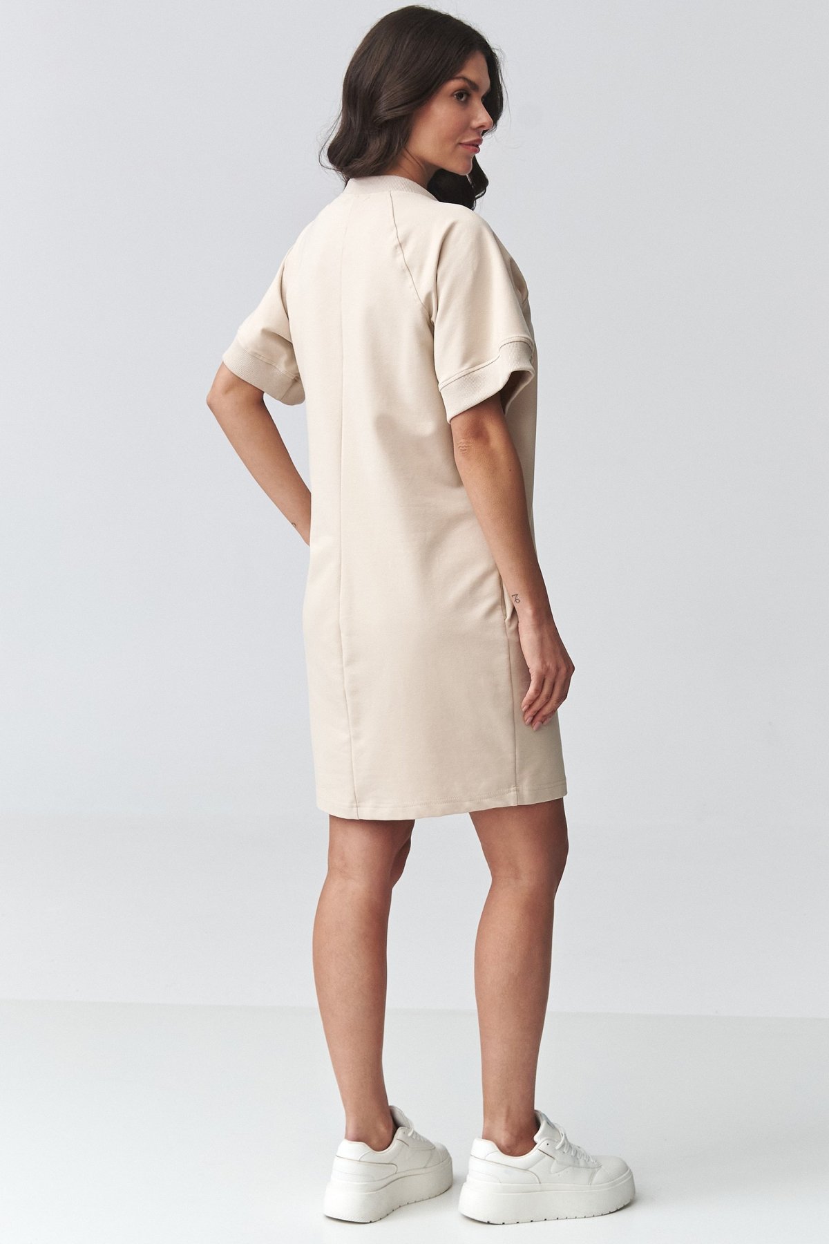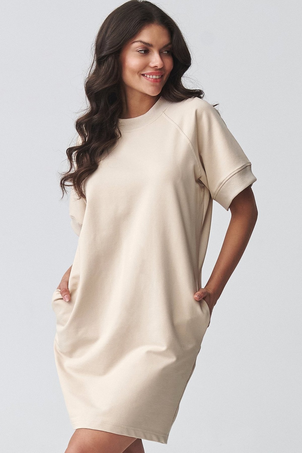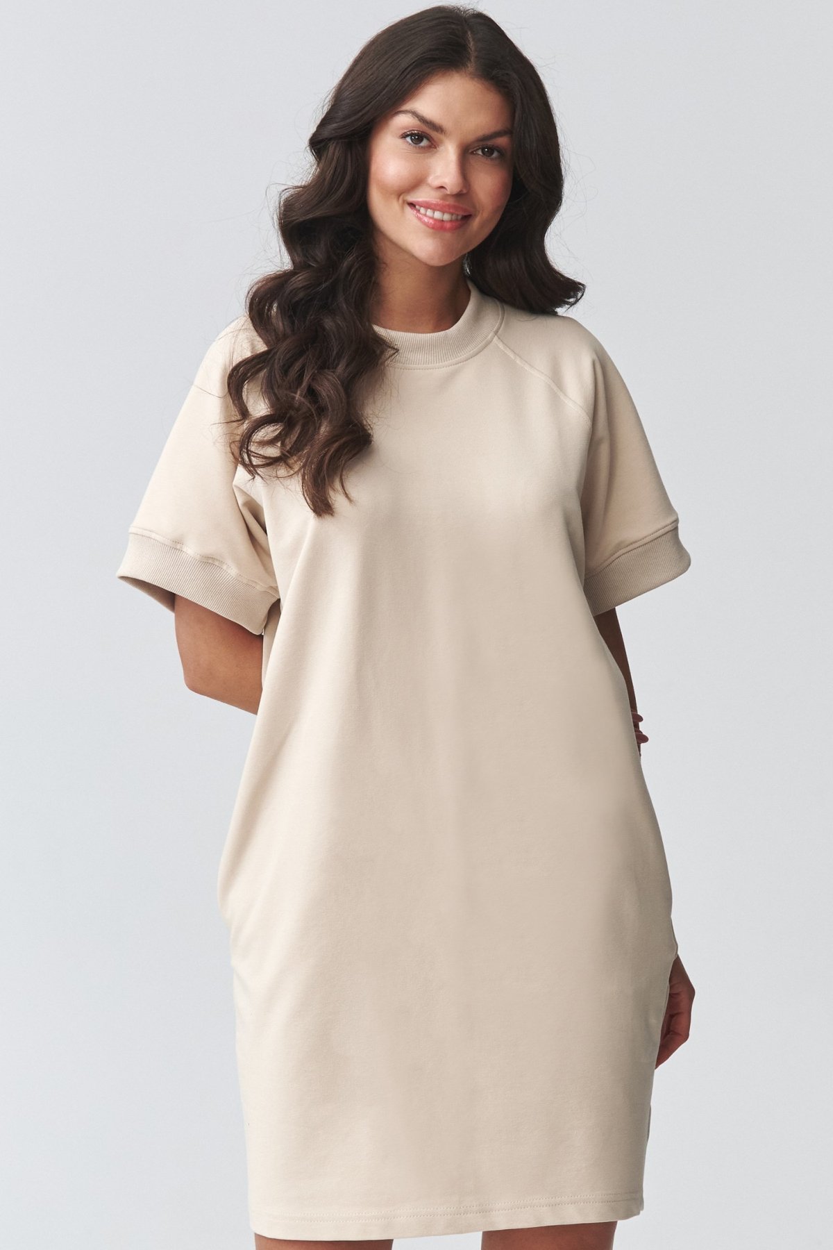 Pohodlné teplákové šaty světle béžové barvy s krátkým rukávem jsou pohodlný kousek pro dny, kdy chcete volnost bez složitého stylingu.