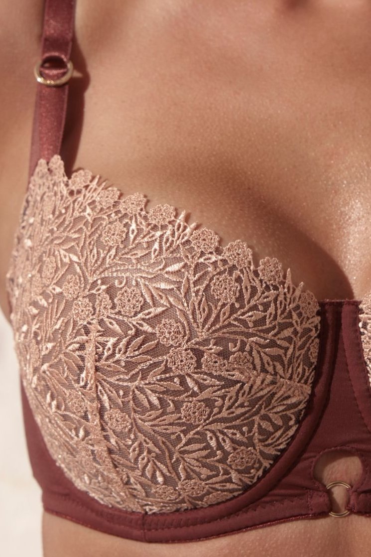 Měkká podprsenka Liv II zaujme kombinací jemné béžové výšivky se zlatou nití a hladkého čokoládového mikrovlákna. Výšivka elegantně kopíruje horní linii košíčků a zvýrazňuje tvar poprsí, zatímco měkká konstrukce s kosticemi poskytuje přirozenou oporu bez zbytečného objemu. Střed mezi košíčky je středně vysoký, decentně přiléhá k tělu a podtrhuje stabilitu konstrukce. Zadní díl je taktéž z mikrovlákna a doplněn vyšívanými prvky, které navazují na přední část.