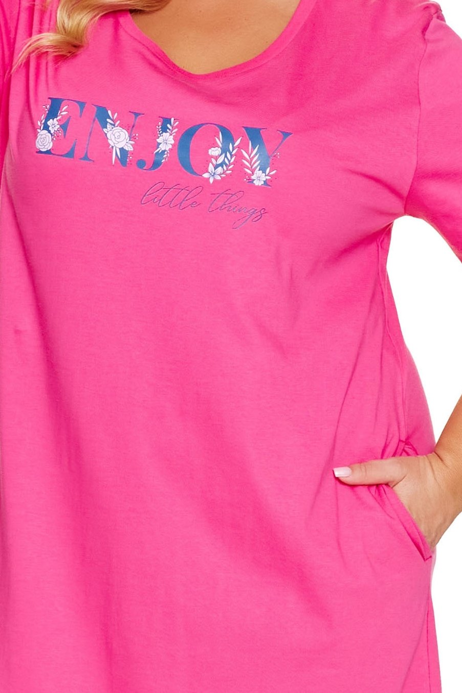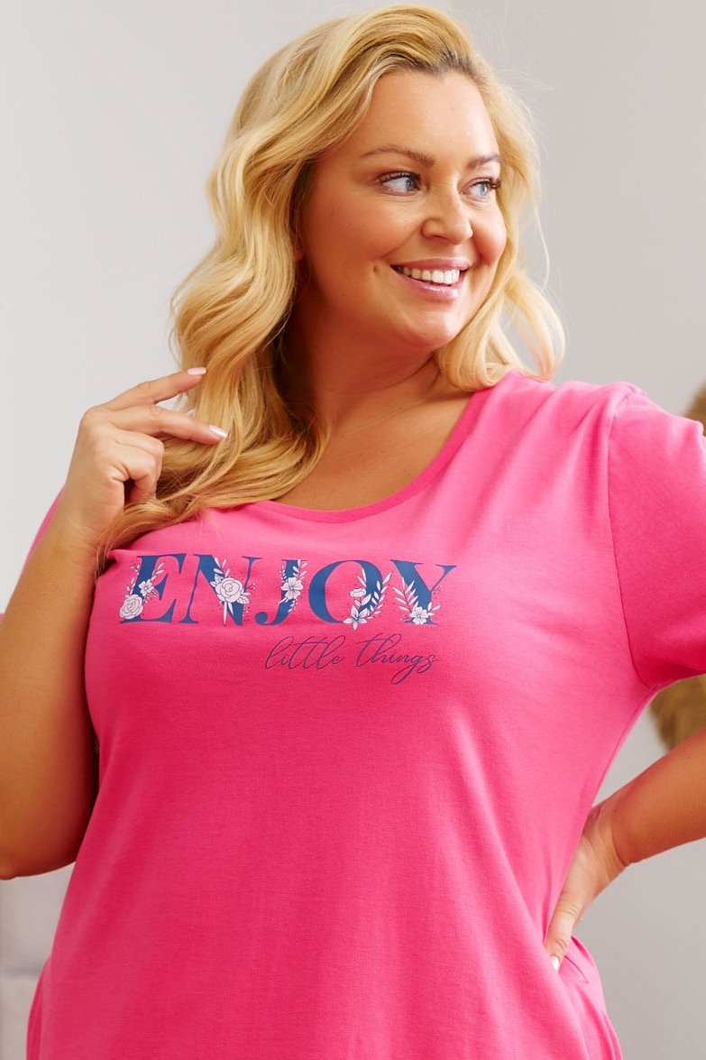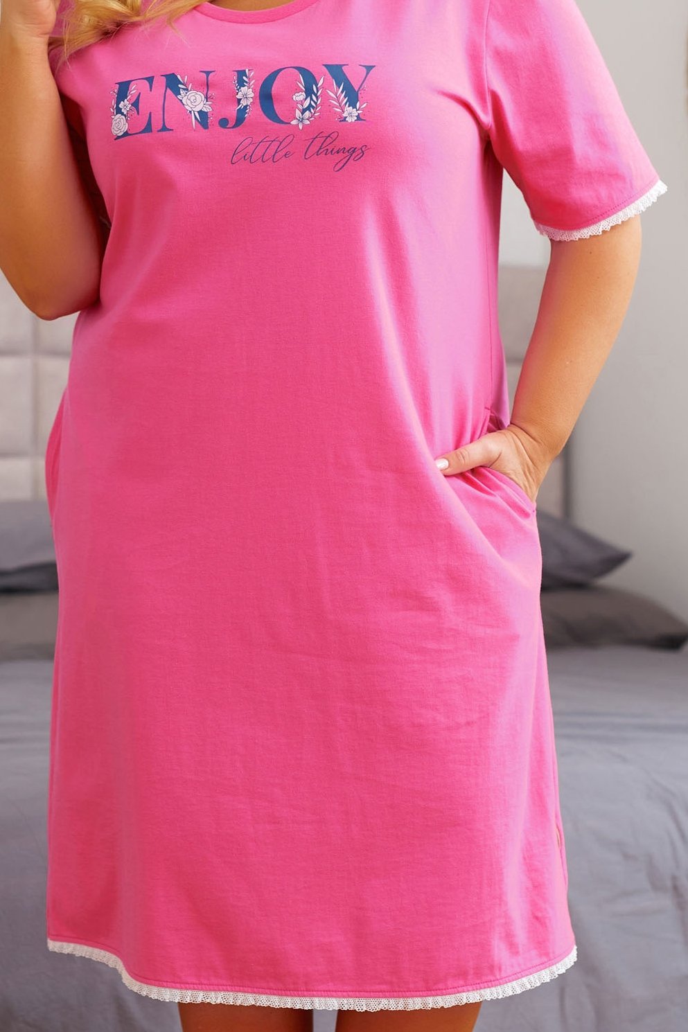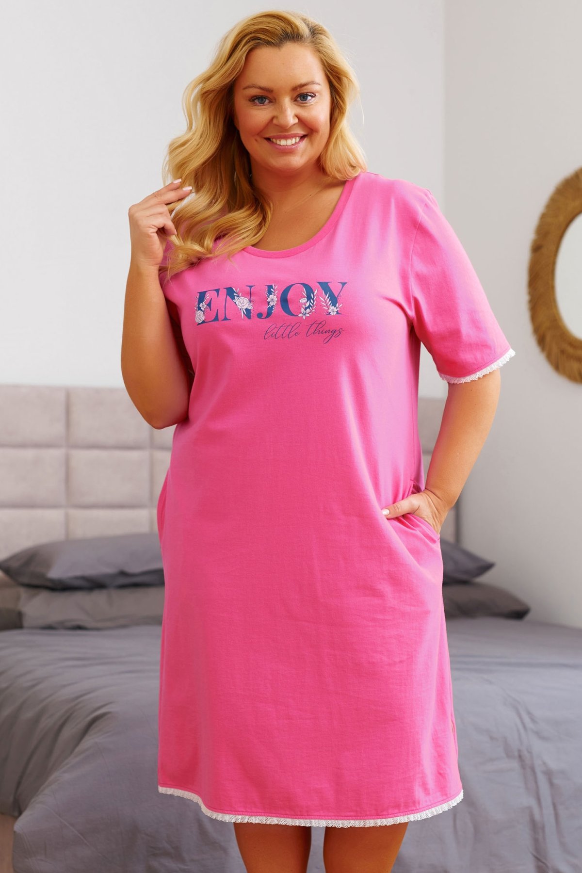 Košeľa je s krátkym rukávom, ktorý zakončuje ozdobný lem, rovnako ako spodnú časť košele. Dekolt je okrúhly. Dominantou je výrazný nápis „ENJOY little things“ – pripomienka, že aj malé radosti majú veľký význam. Dĺžka pod kolená zaisťuje pohodlie aj decentný ženský vzhľad. Ideálna voľba pre ženy, ktoré hľadajú prirodzený komfort, mäkké materiály a úsmevné detaily.