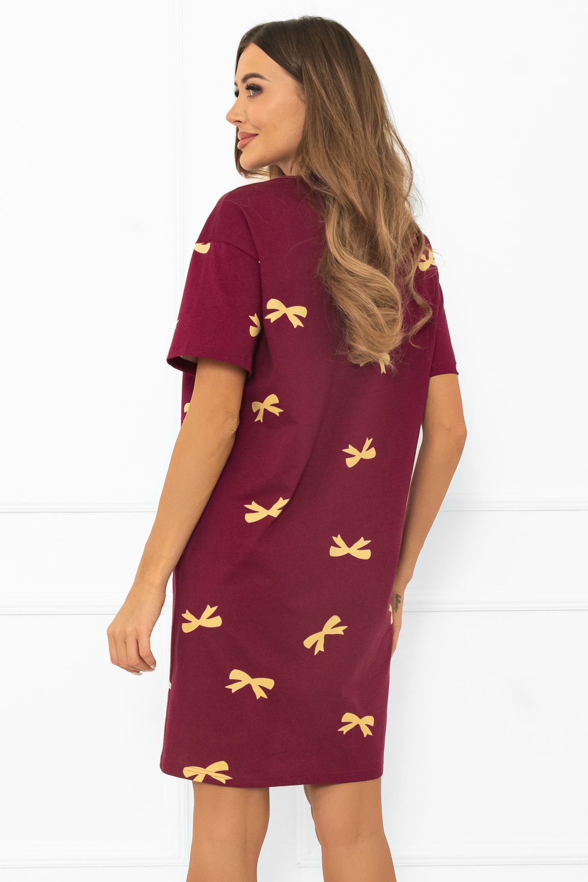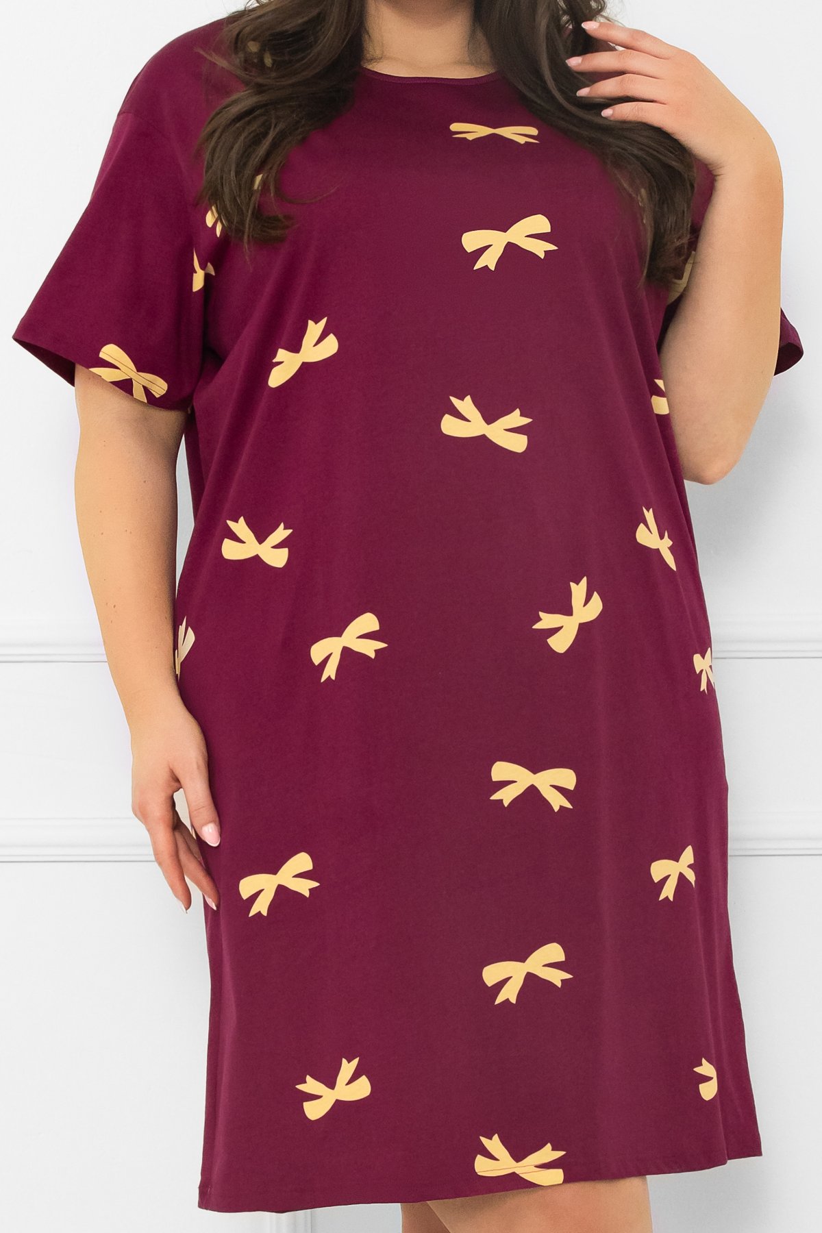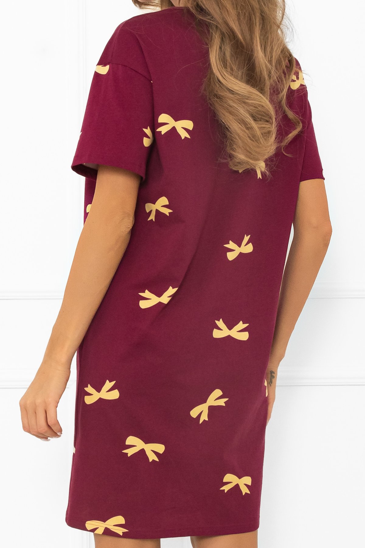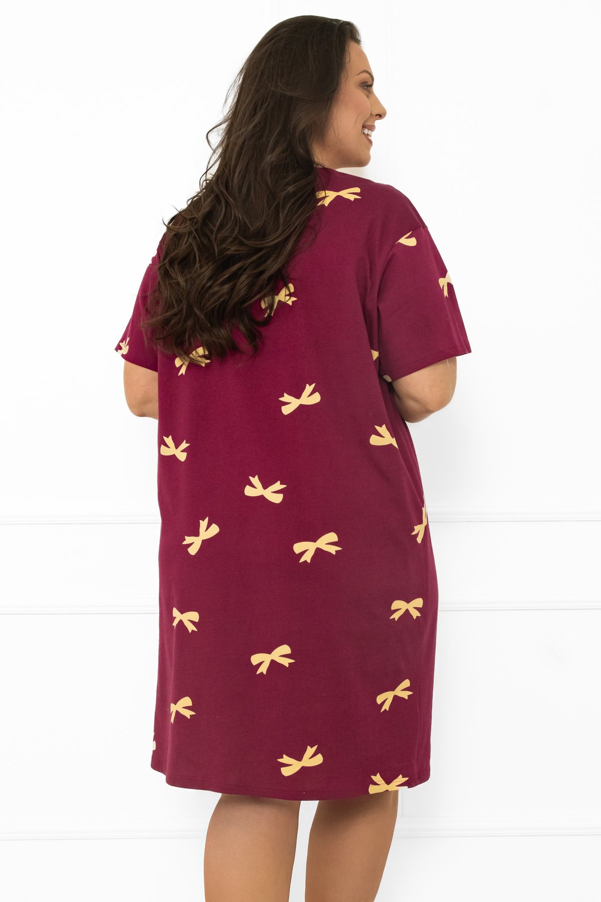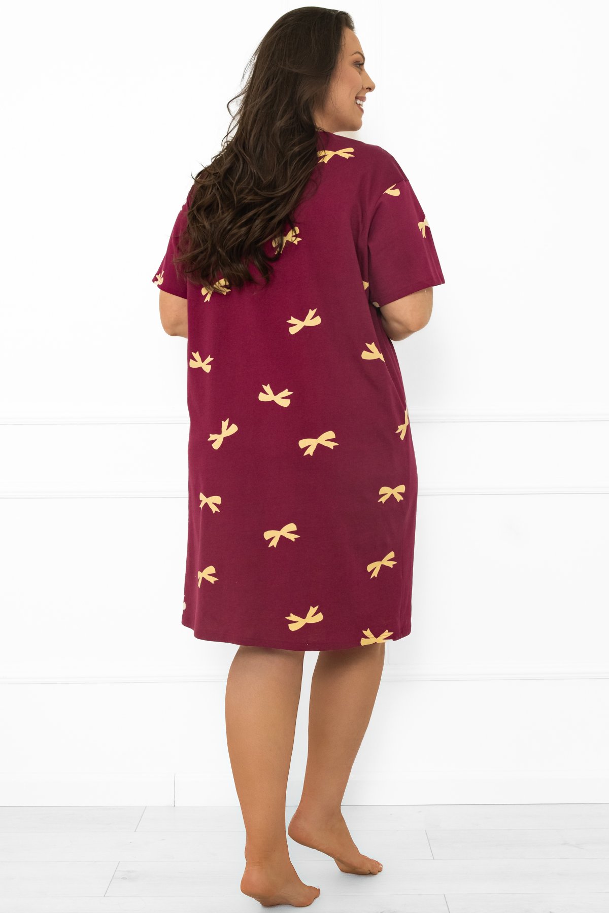 Mäkká bavlna príjemne objíme telo a zaistí komfort počas spánku aj pri domácom odpočinku. Voľnejší strih s krátkymi rukávmi neobmedzuje v pohybe a je ideálny na celoročné nosenie. Dizajn v sýto vínovej farbe zdobia zlaté mašličky, ktoré dodávajú celej košeli hravý a moderný vzhľad. Vďaka dĺžke ku kolenám poskytuje pocit voľnosti a ženského pôvabu zároveň.