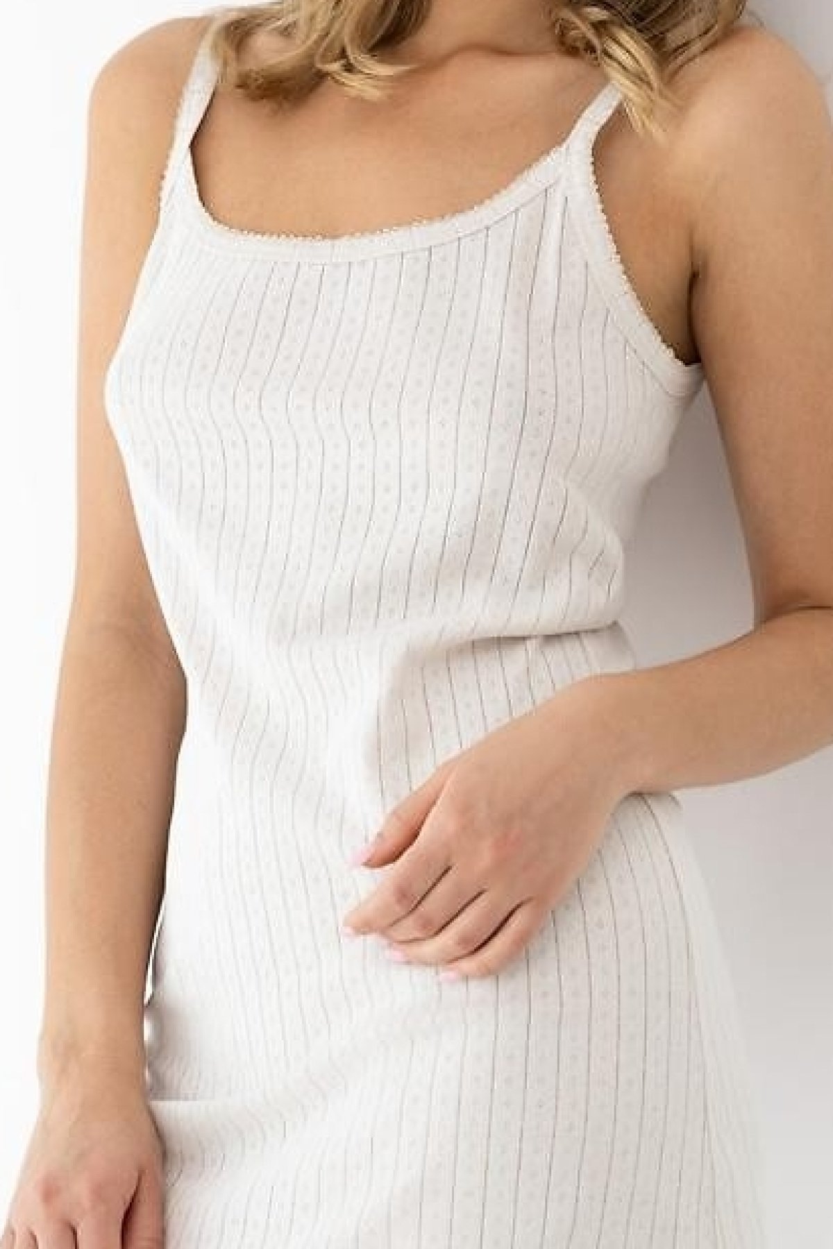 Minimalistické provedení a jemná struktura materiálu působí čistě a přirozeně, takže model nepůsobí těžce ani zbytečně zdobeně. Díky 100% bavlně je noční košilka příjemná na dotek a pohodlná při každodenním nošení. Modelka měří 168 cm a má na sobě velikost S.