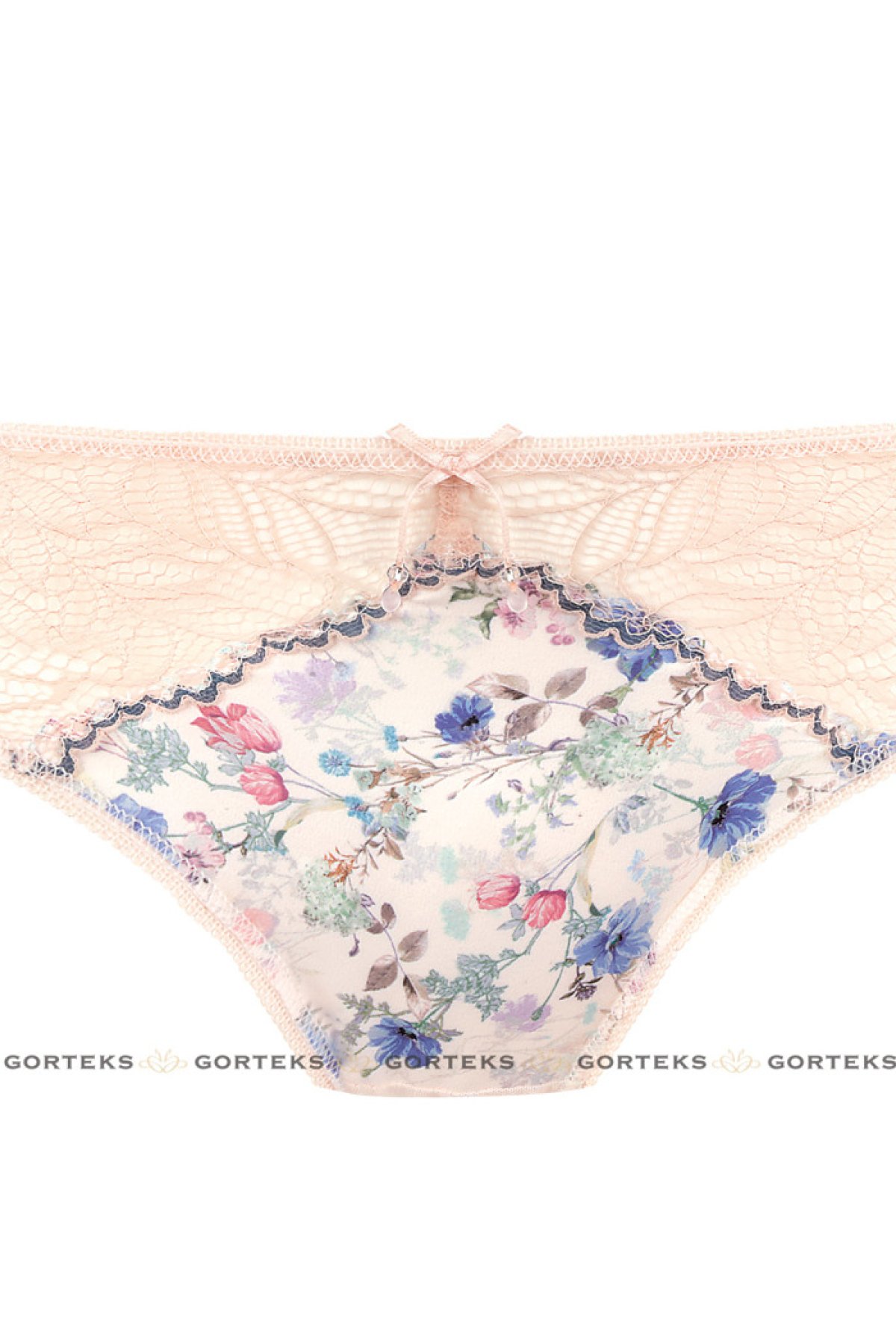 Atraktivní kalhotky klasického střihu. Jsou vyrobeny z tkaniny se vzorem květin, kterou doplňuje krajka a také jemný tyl.