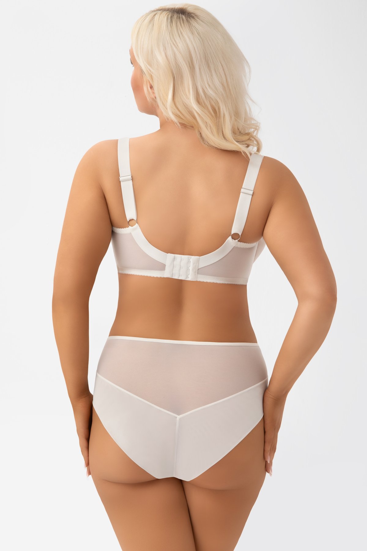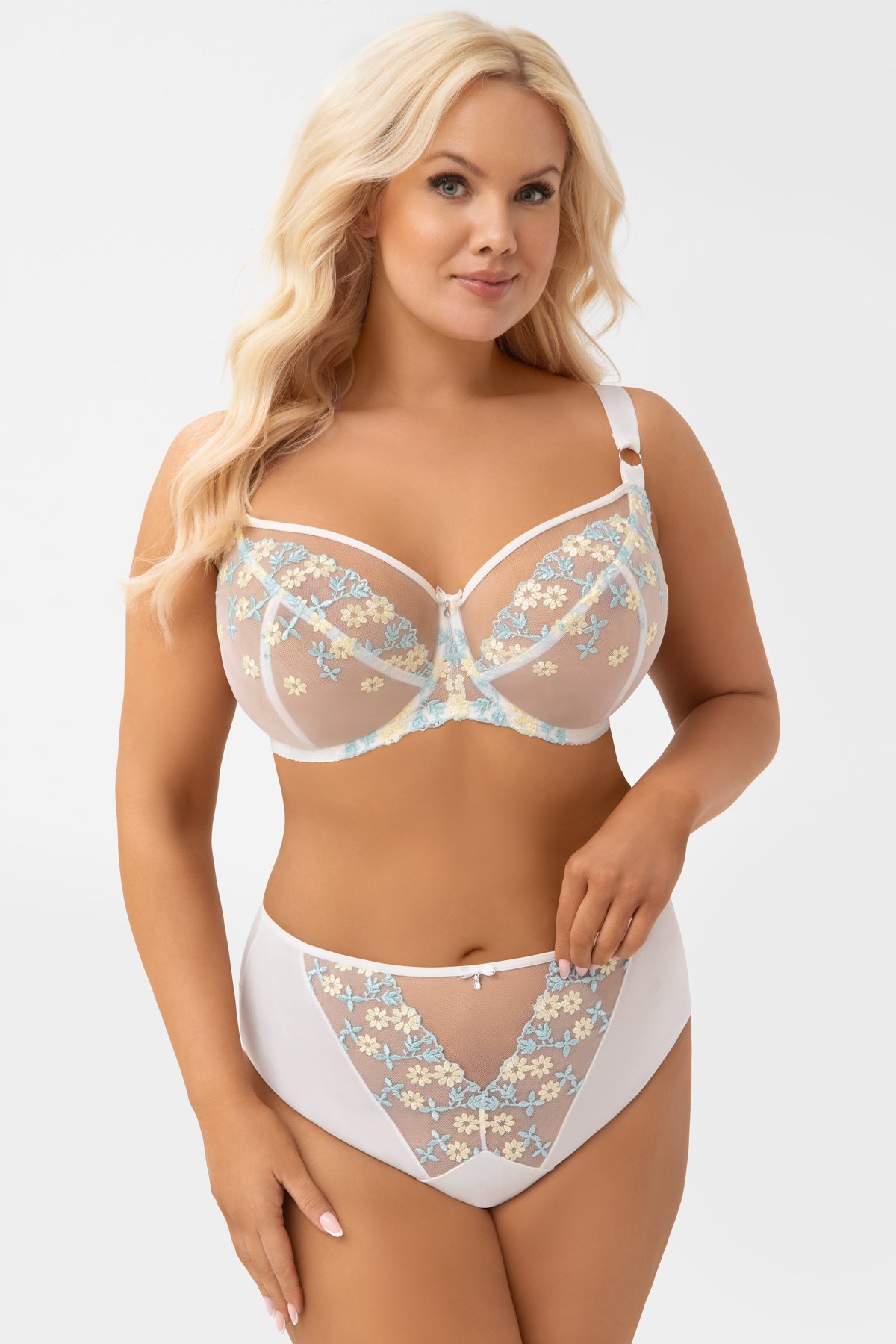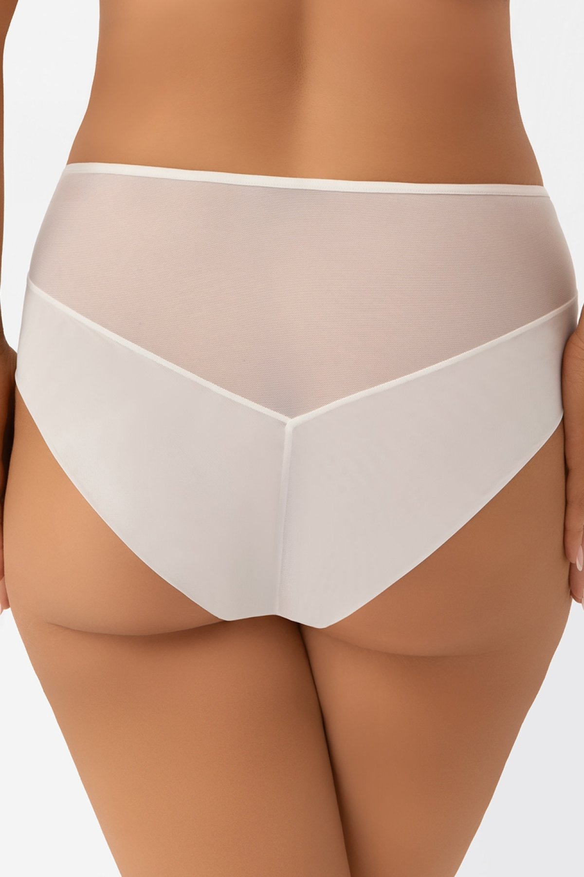 Kalhotky Tessa spojují vyšší pas s více zakrývajícím střihem, který poskytuje pohodlí i klid při nošení. Přední část zdobí výšivka podšitá tylem, takže model působí dekorativně, ale zároveň si drží tvar. Zadní díl z elastického tylu je zakončený hladce, aby kalhotky zůstaly méně viditelné pod oblečením. Střih zakrývá téměř celé hýždě, a přesto si zachovává lehký, ženský vzhled. Komfort při nošení podporuje také prodloužený bavlněný klínek.