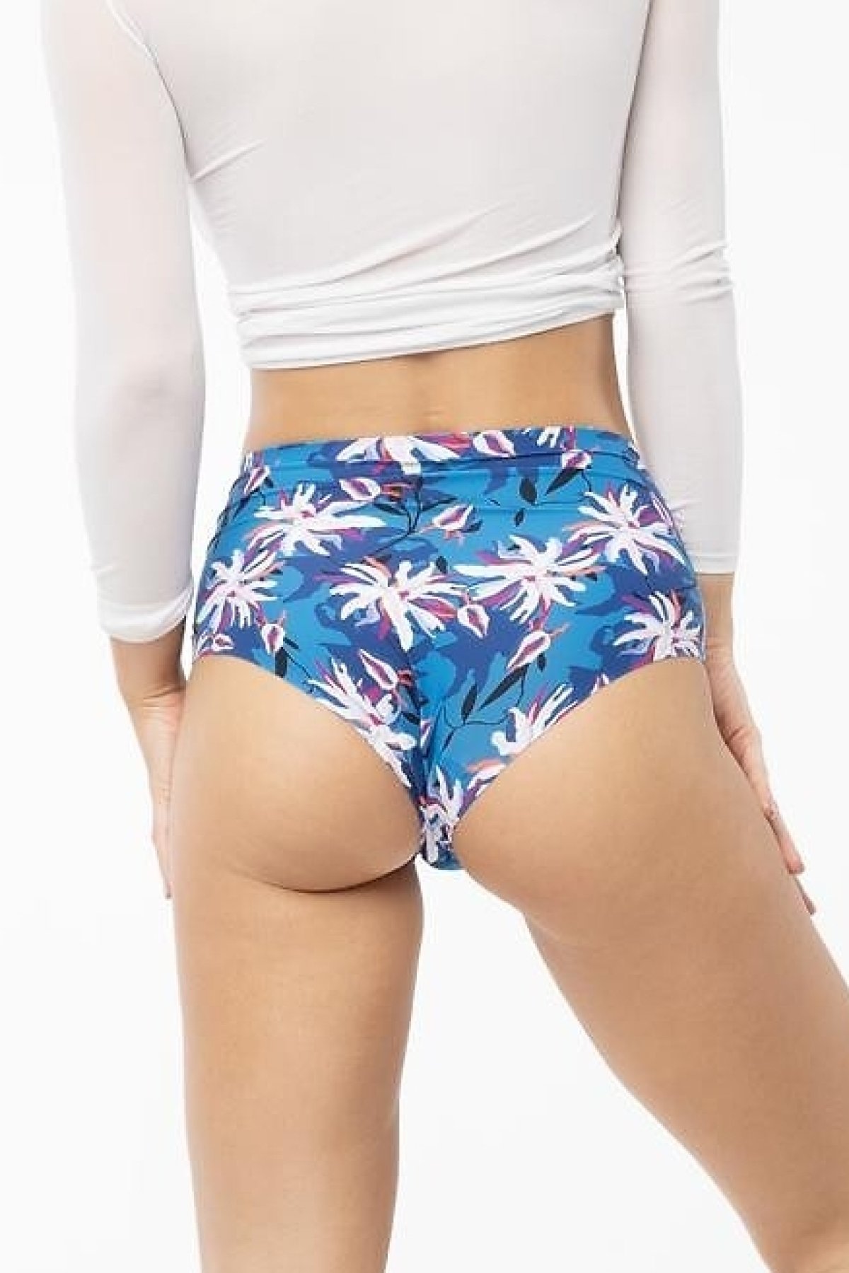 Výrazný květinový potisk inspirovaný bohatostí květů a listů dodává modelu svěží, ženský a energický vzhled. Kombinace sytě modrého základu a jemných akcentů v růžové, bílé a fialové působí nápaditě, ale stále elegantně. Praktickým detailem je také bavlněný klínek a provedení bez klasické všité cedulky.