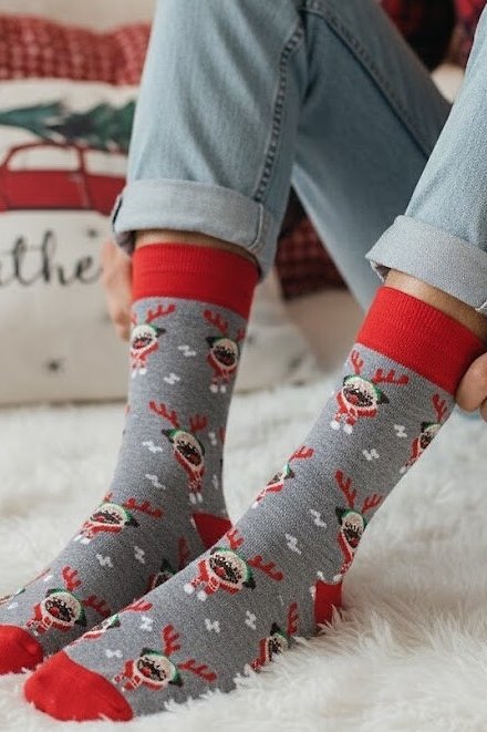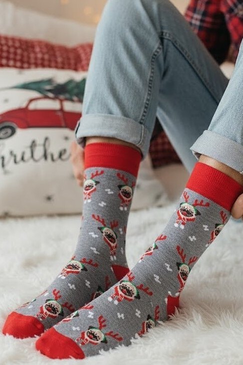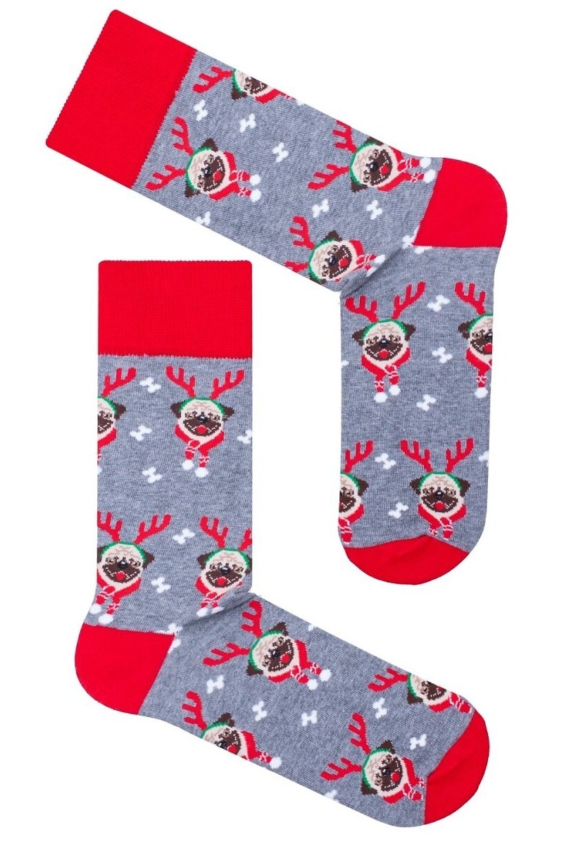 Vneste do zimných dní hravosť a pohodu s týmito pánskymi vianočnými ponožkami. Sivý základ dopĺňa výrazný motív veselého soba v červenej čiapke, ktorý dodáva outfitu sviatočný šmrnc. Ponožky sú vyrobené z príjemnej bavlnenej zmesi, ktorá zaručuje hebkosť, priedušnosť a celodenný komfort. Vďaka elastickému lemu skvele držia na nohe bez toho, aby ju nepríjemne sťahovali. Štýlový dizajn s červenými detailmi poteší každého muža, ktorý má rád pohodlie aj zábavu. Tieto ponožky sa stanú obľúbeným zimným doplnkom alebo ideálnym drobným darčekom na sviatočné obdobie.